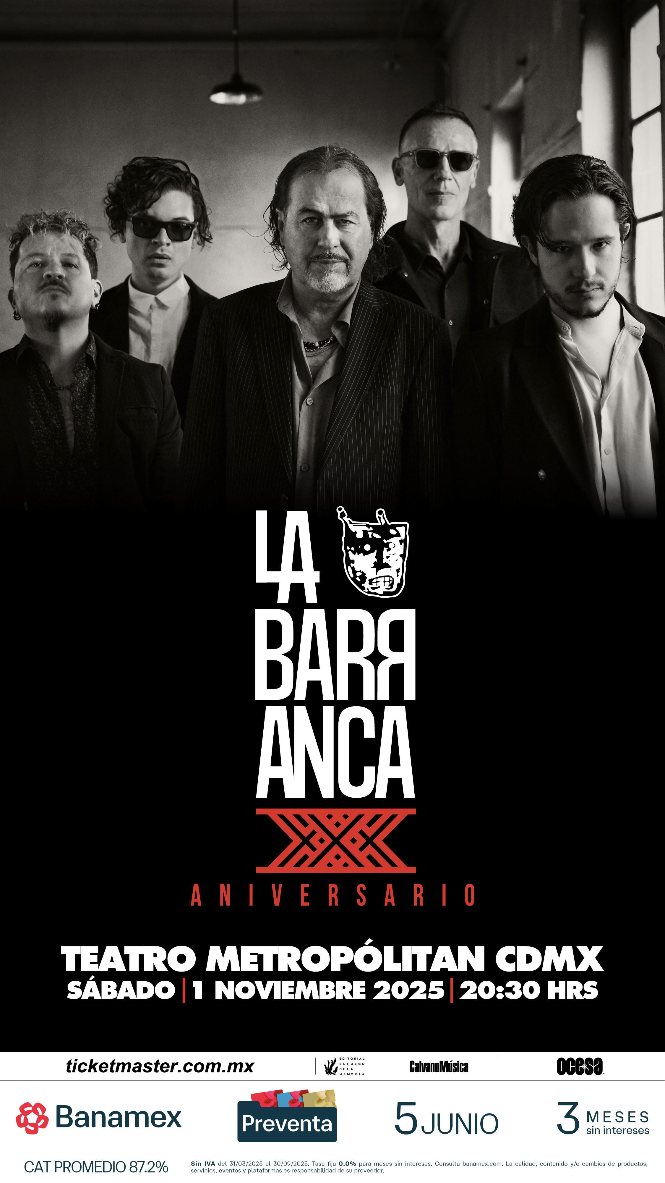 Prepárense para una velada que será un verdadero hito en la historia del rock mexicano, porque el próximo 1º de noviembre celebraremos 30 años de una de las bandas más legendarias, memorables y finas de nuestro país: ¡La Barranca! Tres décadas de éxitos, de una trayectoria musical que ha marcado un antes y un después en nuestra cultura sonora. ¡Nos vemos en el Teatro Metropólitan para un viaje inolvidable acompañados de sus clásicos!