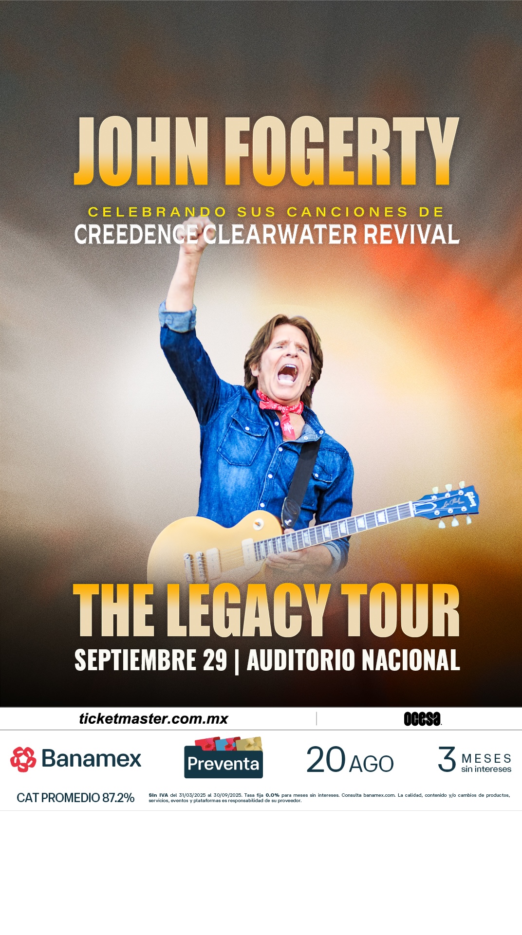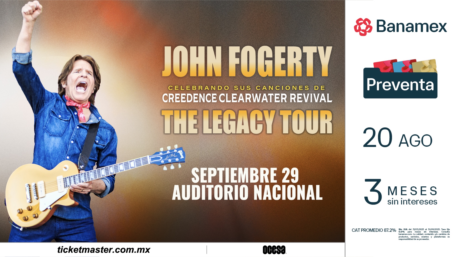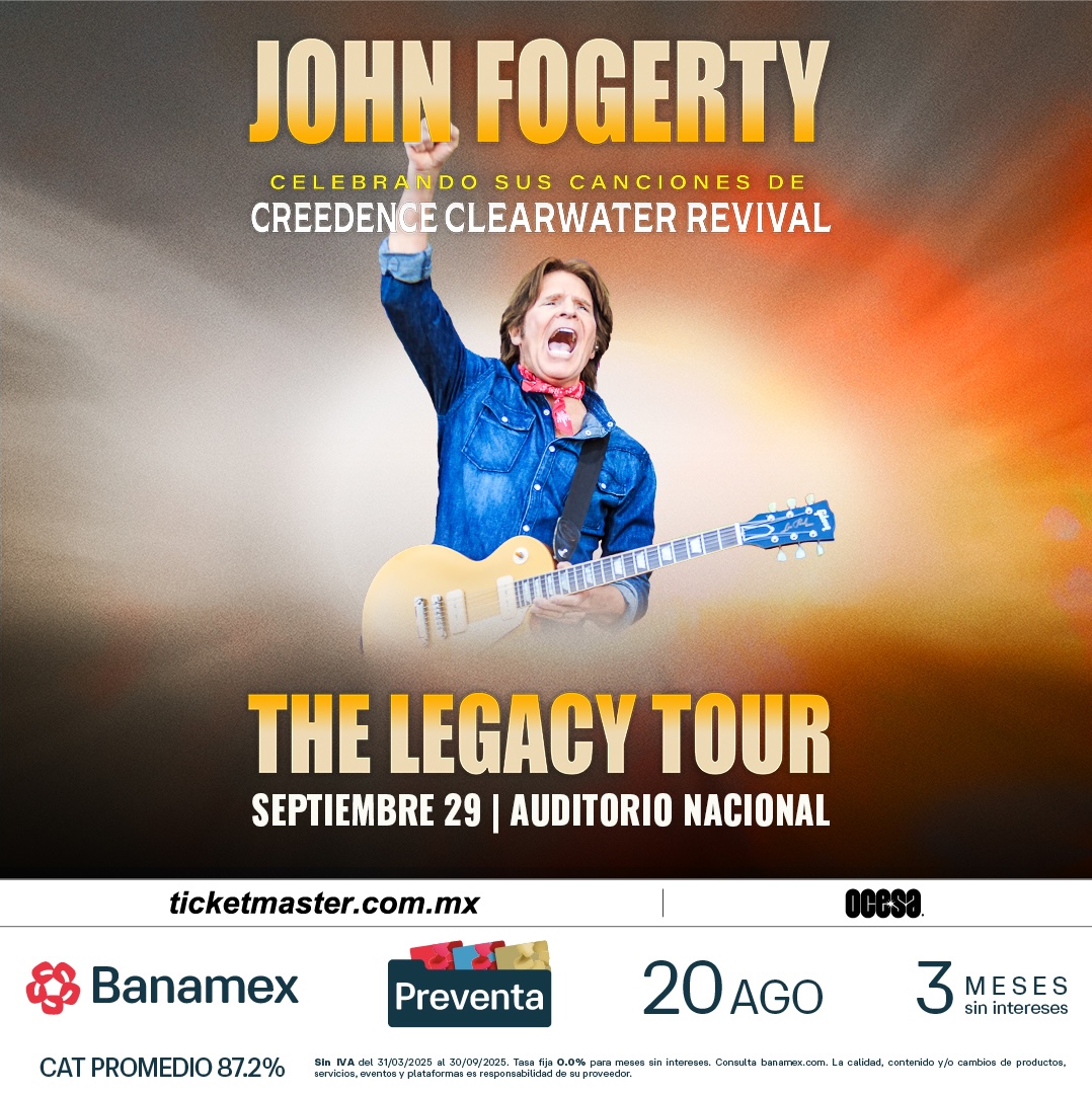Haz historia y disfruta en vivo las canciones que cambiaron el mundo celebrando los 80 años de John Fogerty. Asegura tus boletos en la preventa Banamex el 20 de agosto o bien, en la venta general el 21 de agosto a través de www.ticketmaster.com.mx o en las taquillas de los inmuebles.