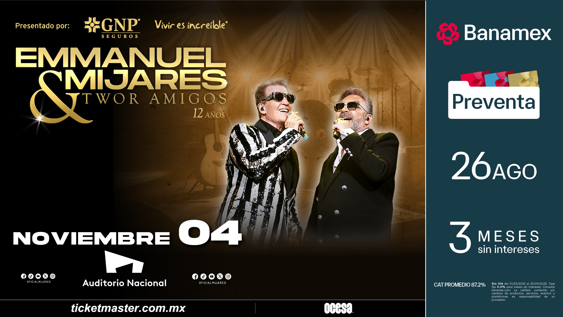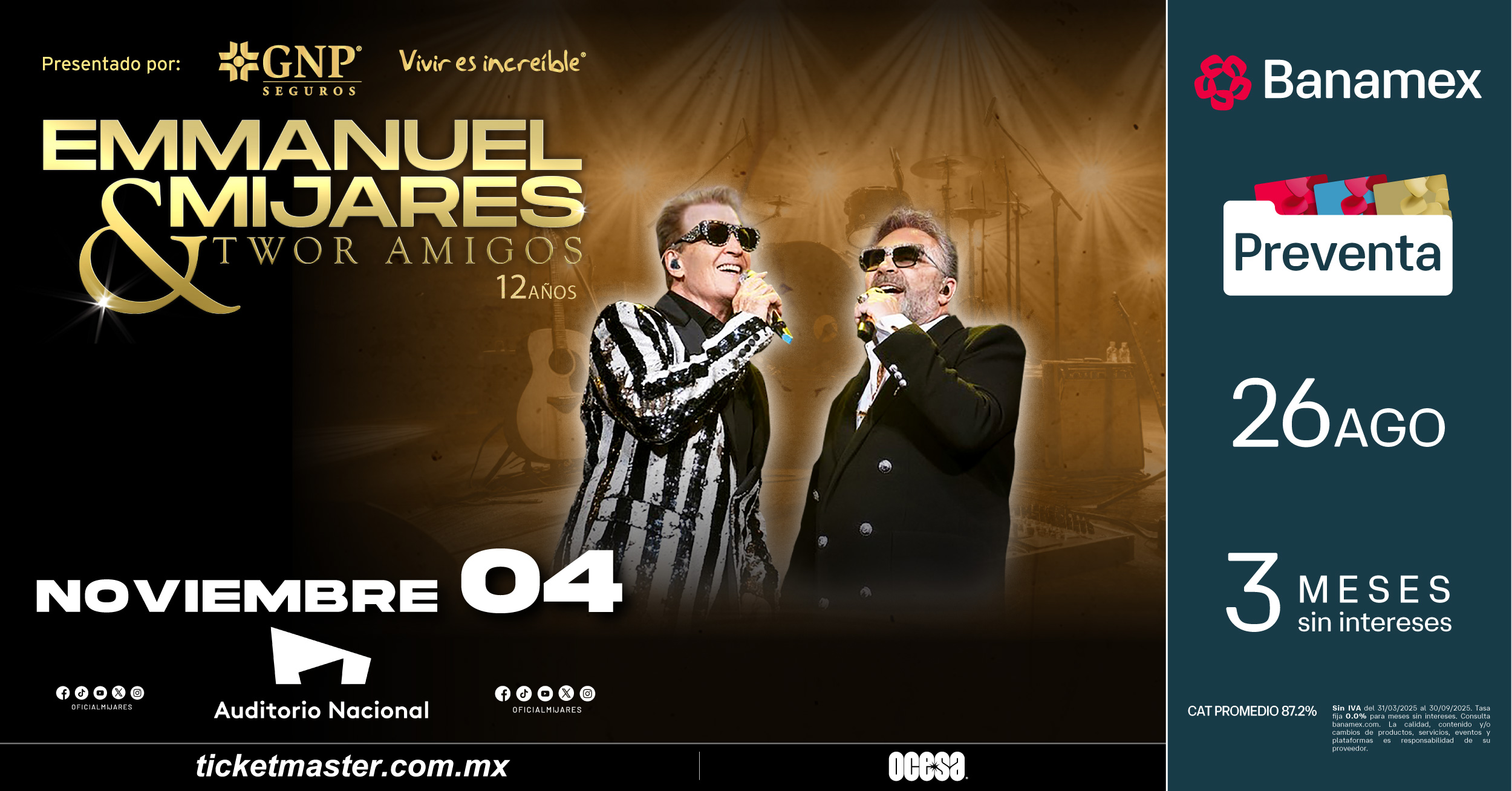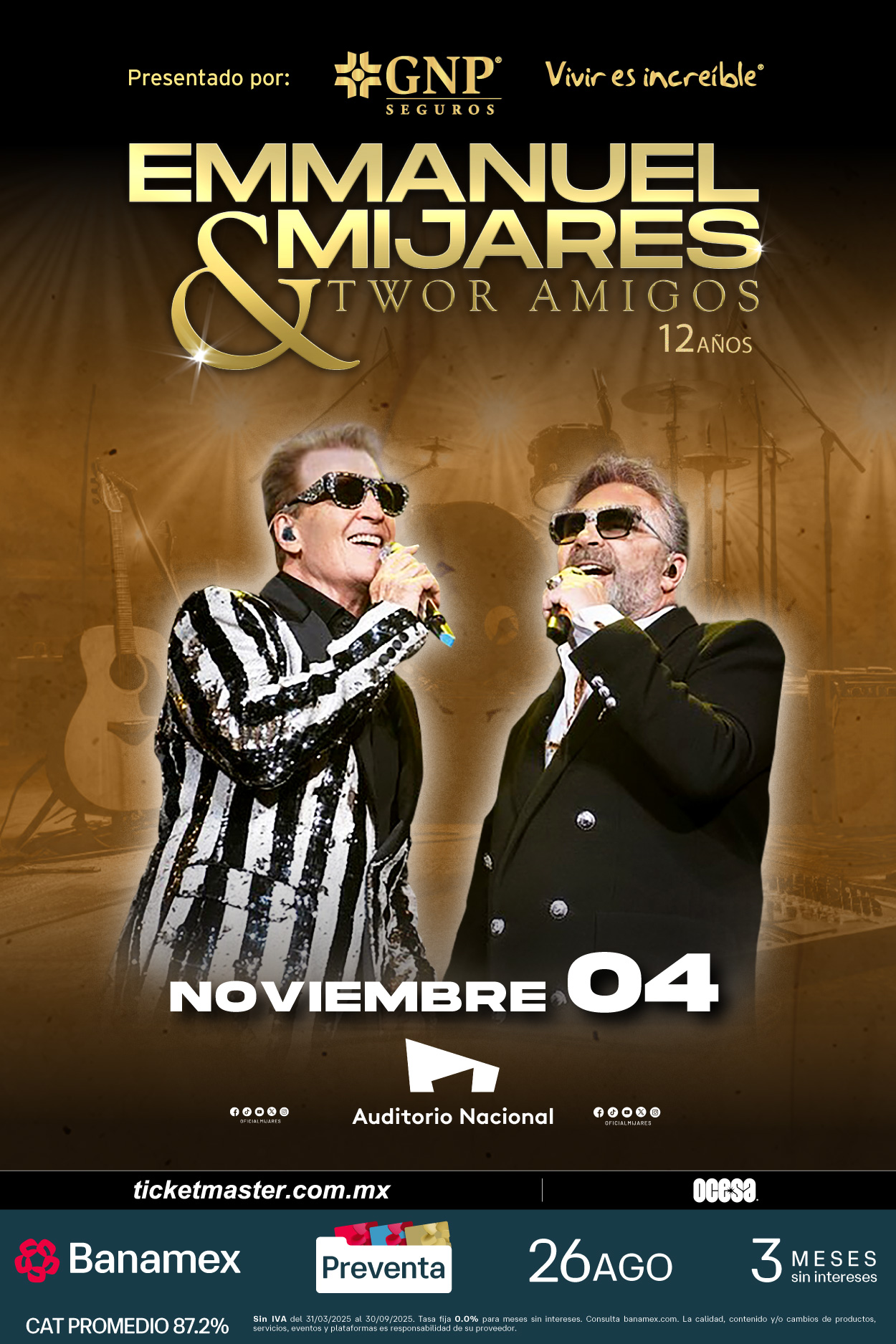 La euforia por este par de grandes de la música no ha parado en años y se han consolidado como uno de los más exitosos en la era del pop contemporáneo. Por supuesto que estamos hablando de Emmanuel & Mijares y su TWO’R AMIGOS, un espectáculo que ha llenado múltiples escenarios a lo largo de la República Mexicana y la capital. Este año no podía ser la excepción, así que prepárense para revivir los grandes éxitos de una de las mejores épocas del pop en nuestro país. La cita es el próximo 4 de noviembre en el Auditorio Nacional.