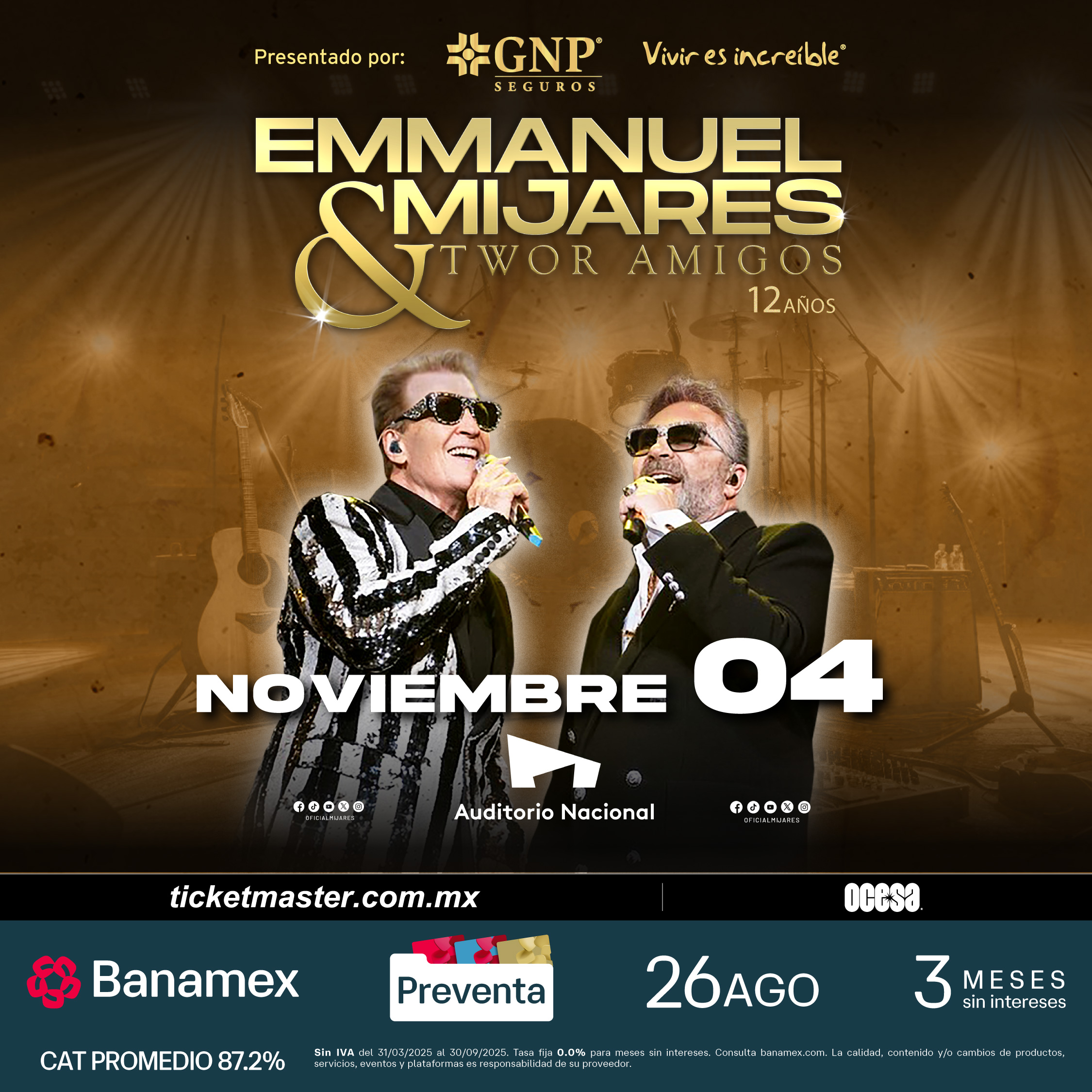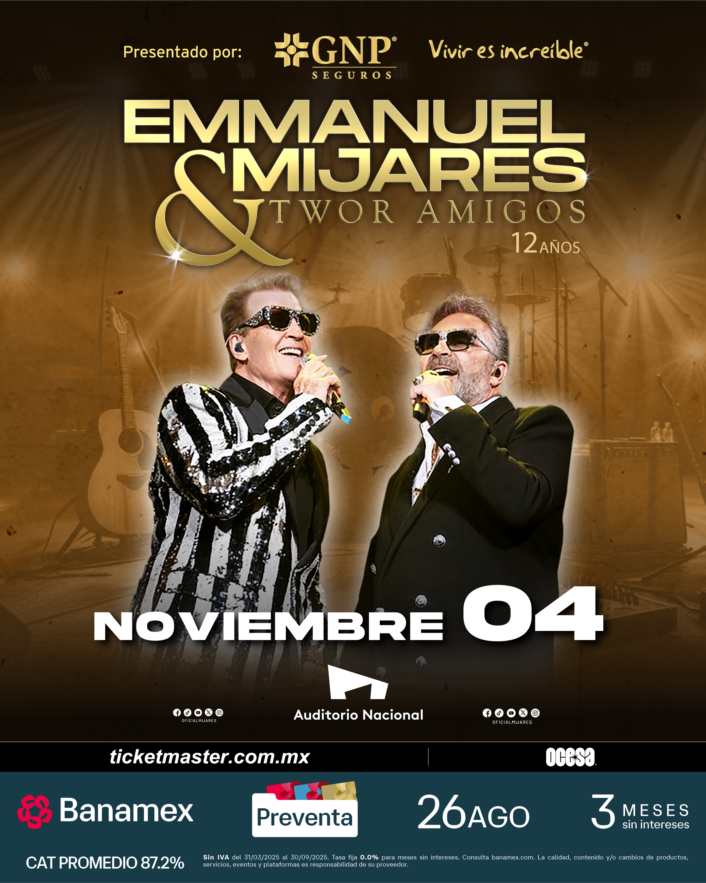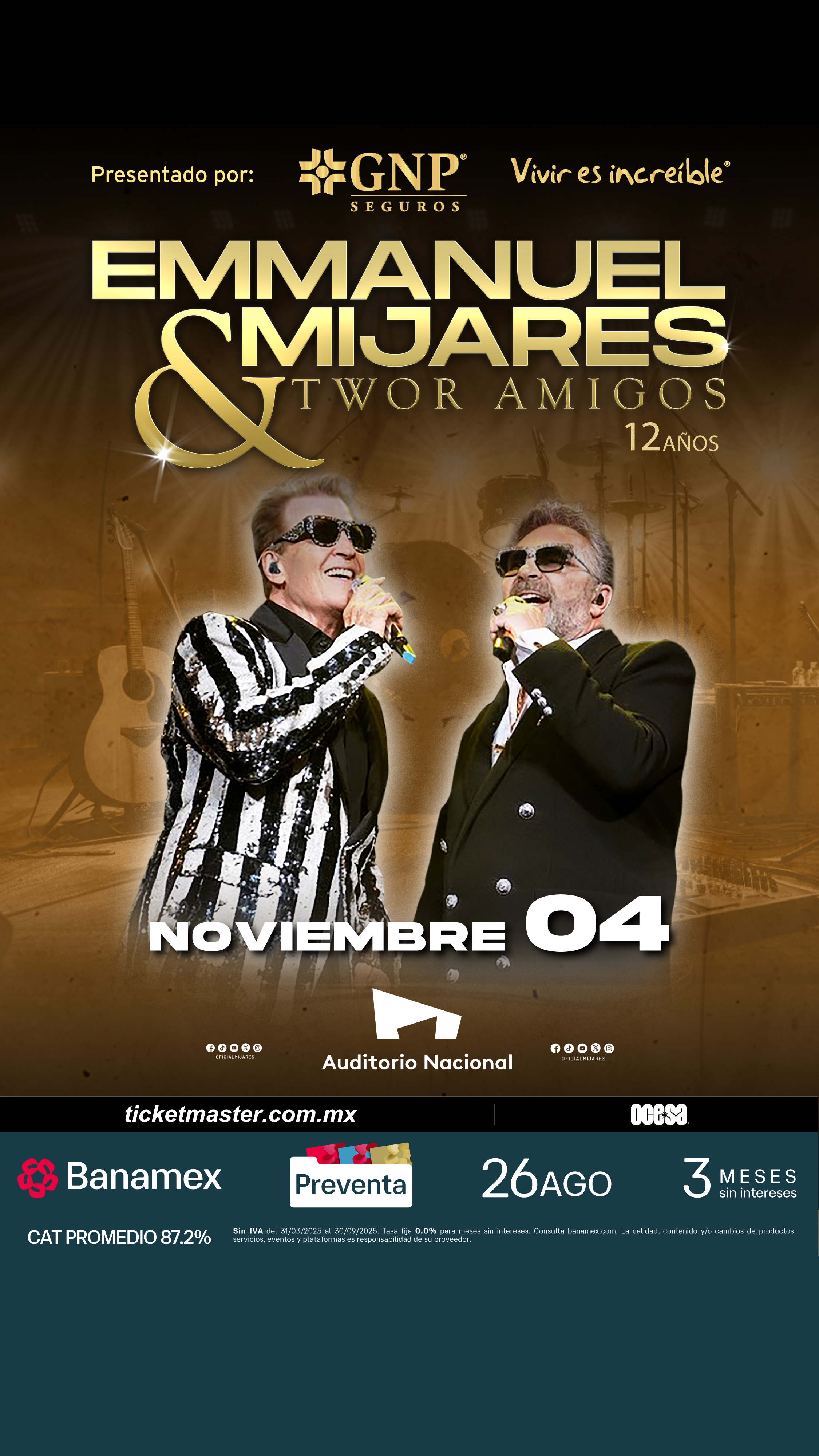 No te pierdas la oportunidad de ser parte de esta celebración musical. Corre por tus boletos y vive en persona la exitosa historia de Emmanuel & Mijares en el Auditorio Nacional. ¡Te esperamos para cantar, bailar y revivir los mejores recuerdos de una era dorada!
