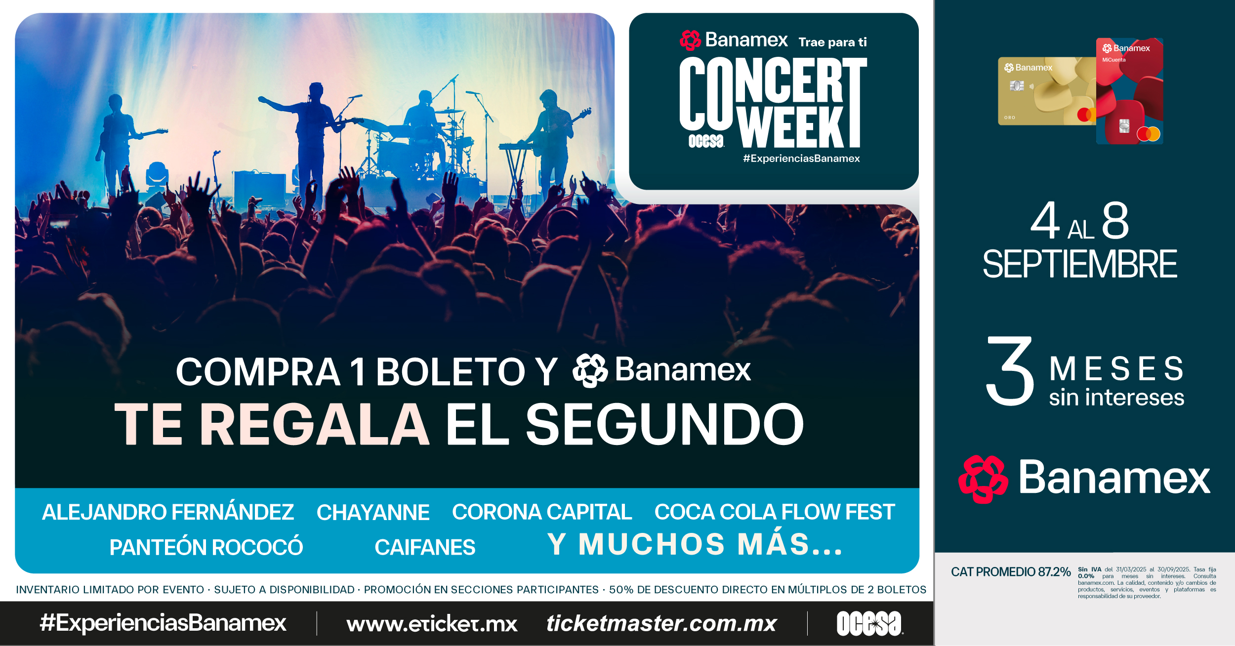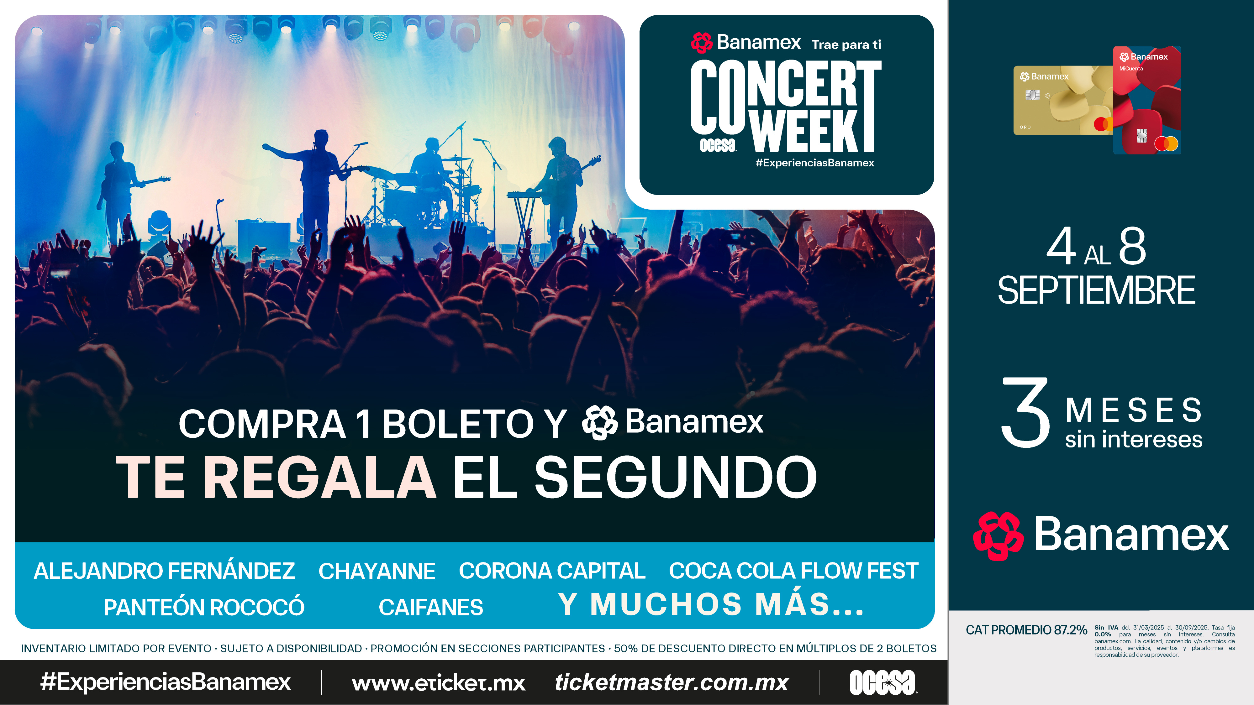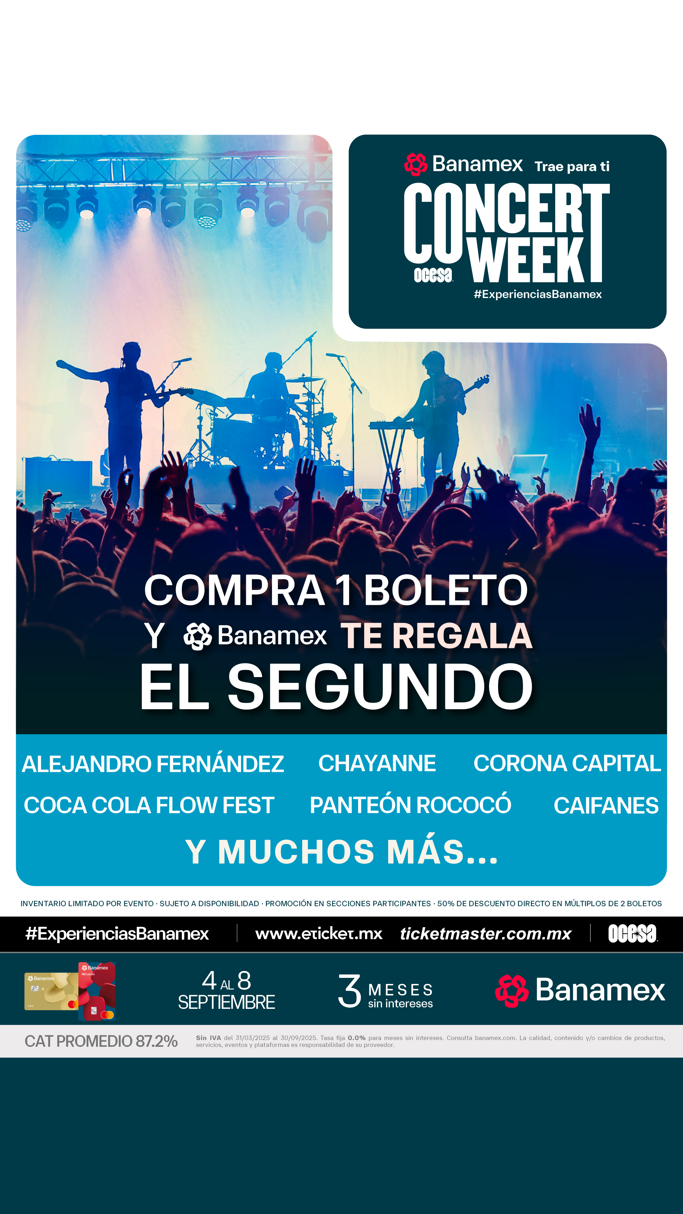 ¡Buenas noticias, OCESA CONCERT WEEK regresa! Prepárense para cinco días de pura euforia, del 4 al 8 de septiembre, donde podrán comprar un boleto y Banamex les regalará otro. Vive la emoción de compartir esa noche inolvidable con tu mejor amigo, tu pareja o tu crush, ¡sin gastar un extra!