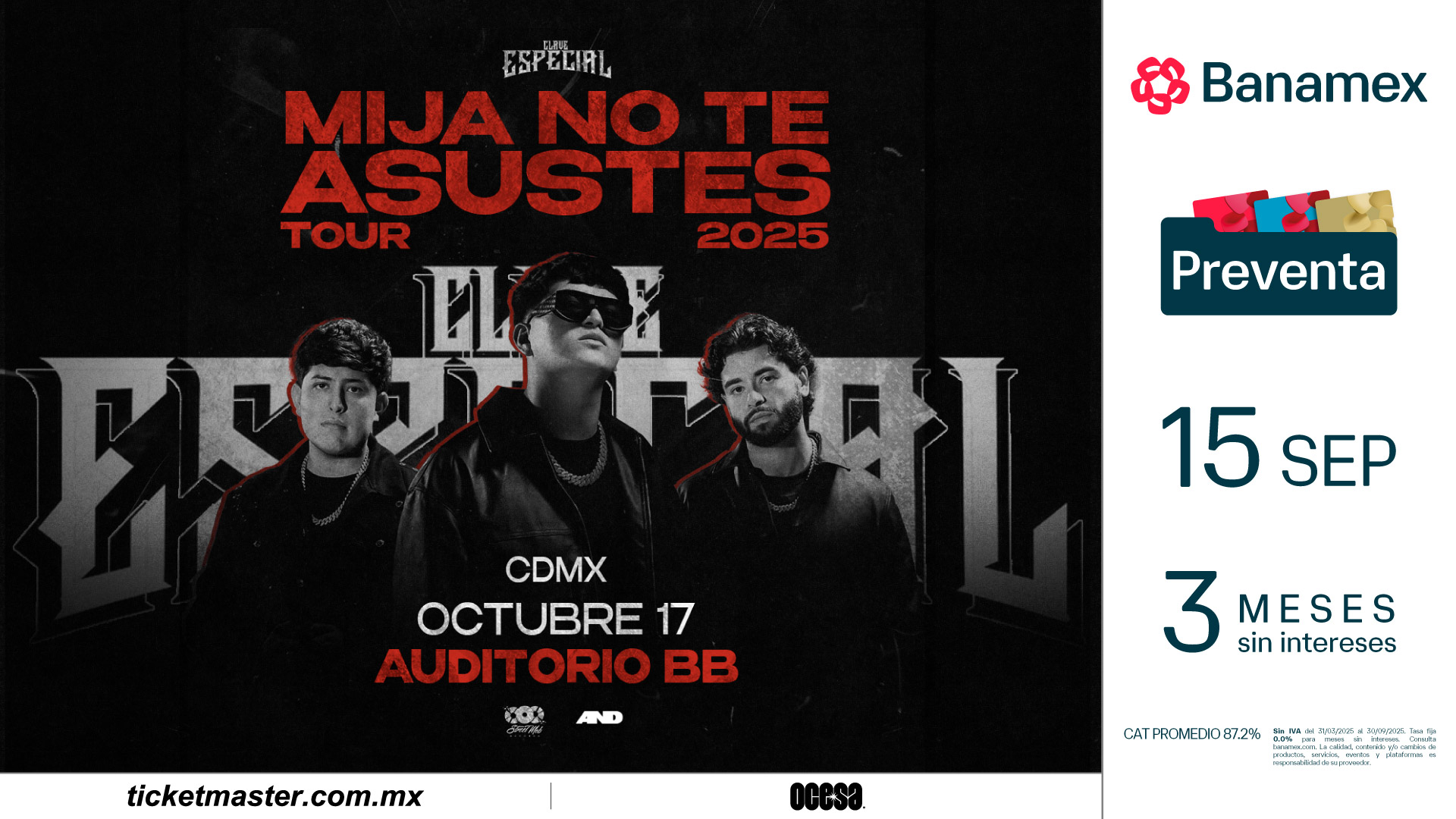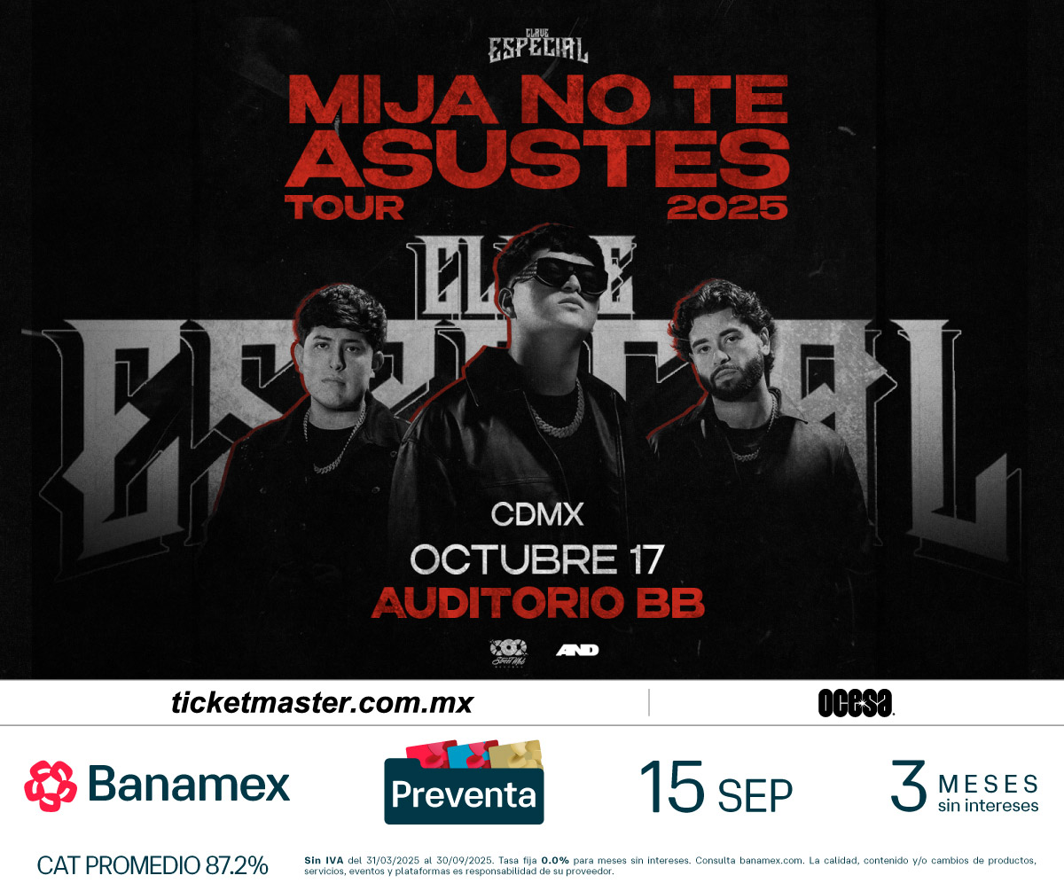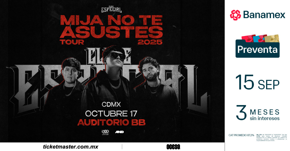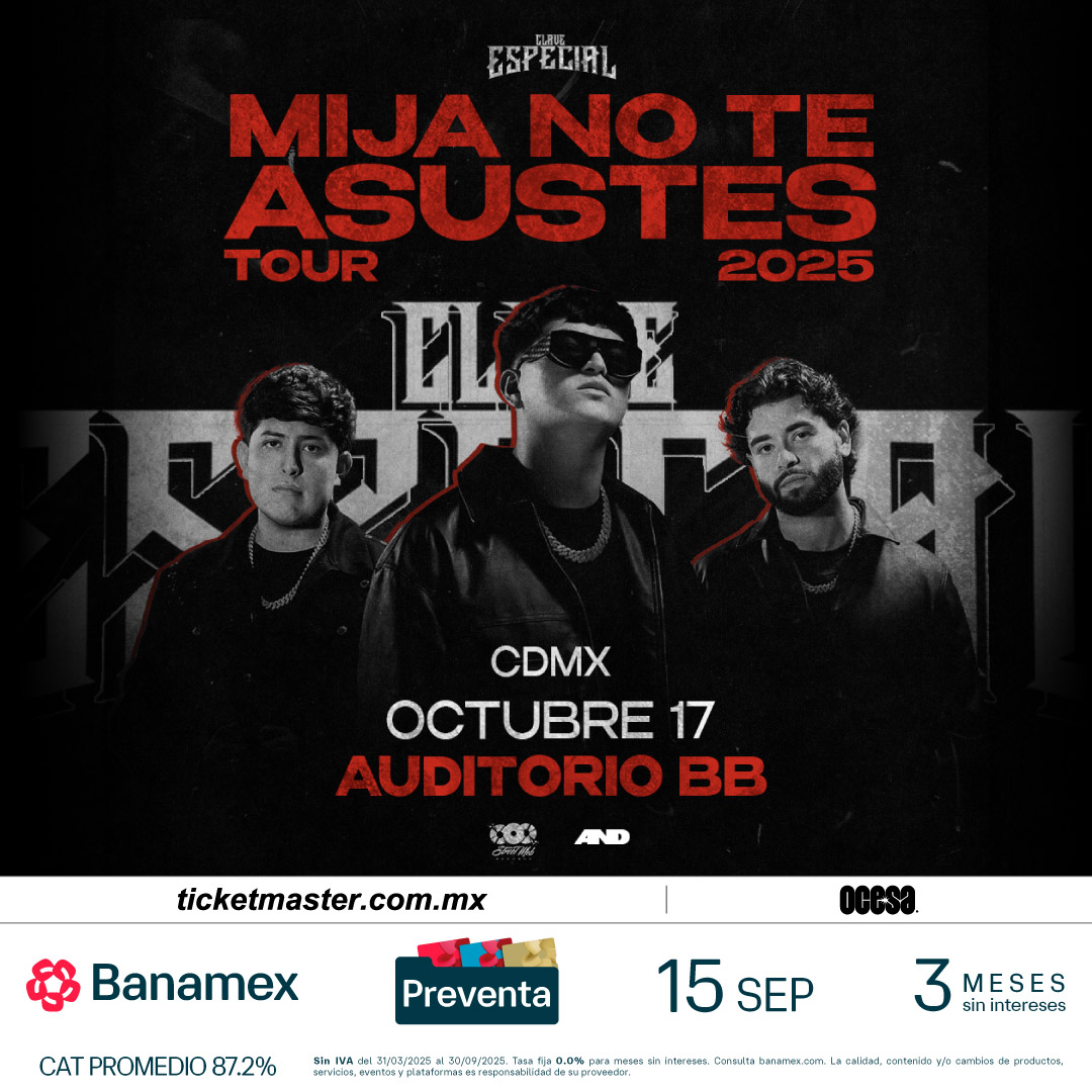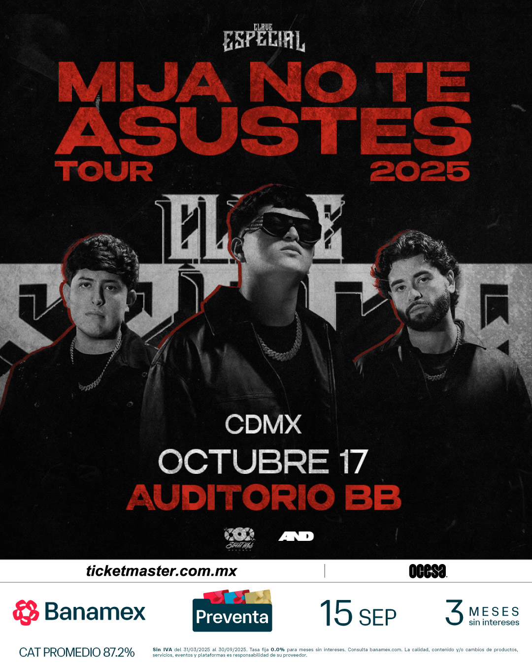 La banda reventó la industria con la fuerza de sus corridos, alcanzando una relevancia meteórica con “Como Capo”, misma que cuenta con la participación de Fuerza Regida. En plataformas alcanza más de 232 millones de reproducciones, demostrando así, que Clave Especial no sólo es una de las voces más frescas de los corridos, sino que vino para quedarse. Escucha en vivo “Luz Verde” y “No son Doritos”, y adquiere tus boletos en la Preventa Banamex a partir del 15 de septiembre, mientras que la venta general será un día después, en las taquillas del inmueble o a través de Ticketmaster.