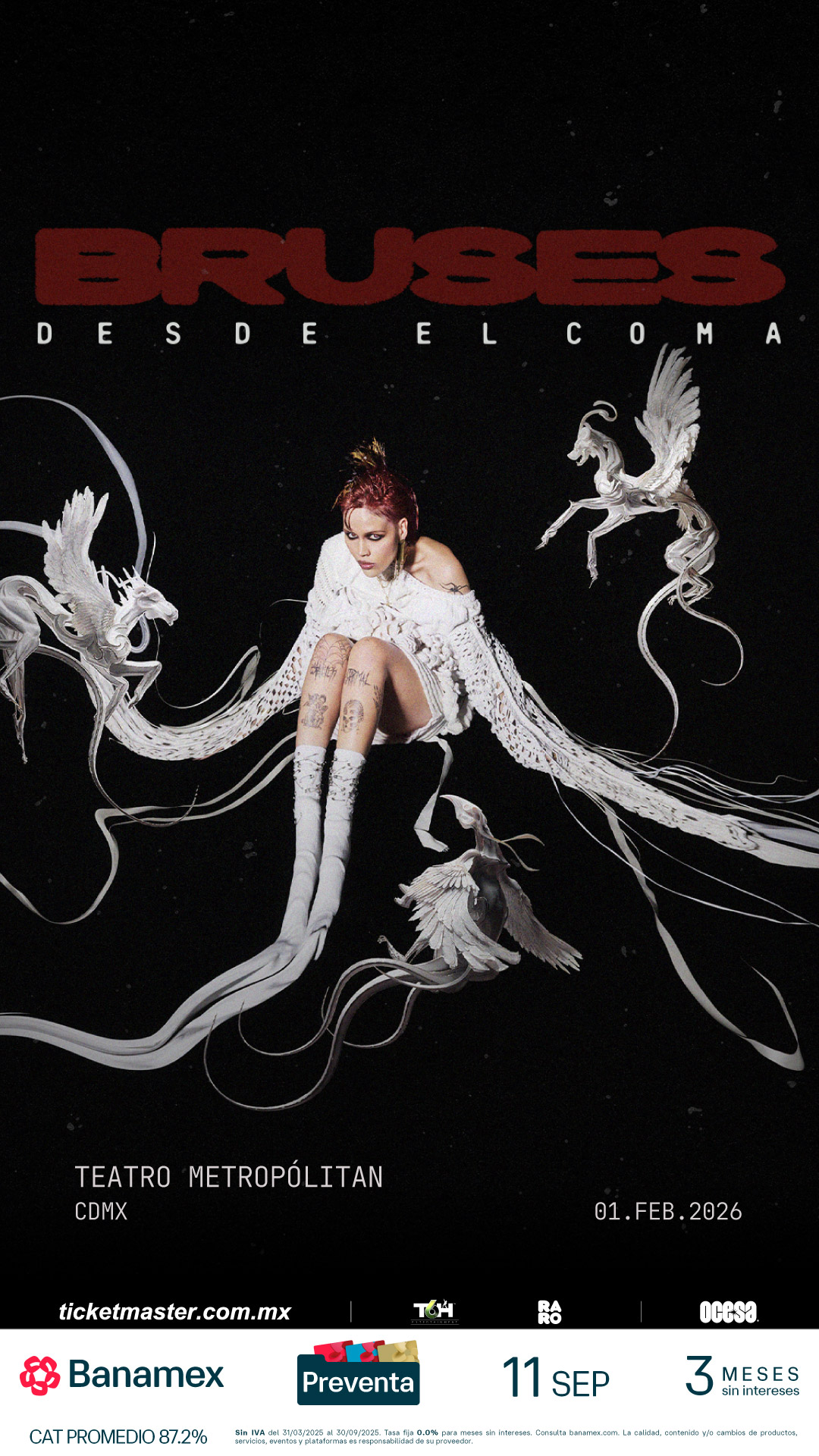 Amalia Ramírez, conocida artísticamente como Bruses, llega a la capital con su esperado segundo álbum, Desde El Coma, el cual incluye 15 tracks que exploran lo vivido durante un accidente que la dejó en coma. Canciones como “F MY X (I’M A MESS”), “ME ESTOY RINDIENDO am0r ☹” o “MALEFIKA”, reflejan ese viaje físico y mental que la han consolidado como una de las voces más originales de su generación.