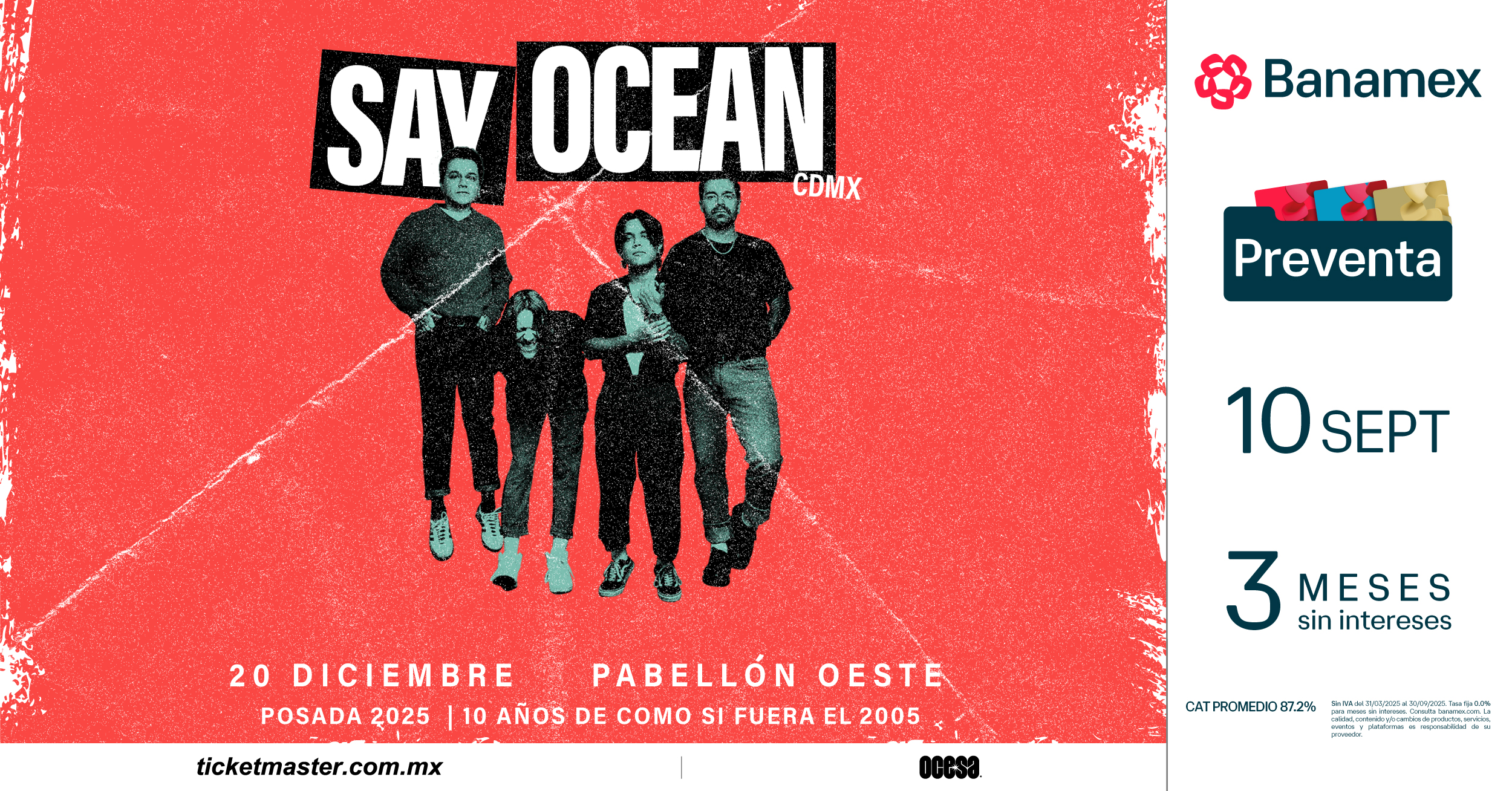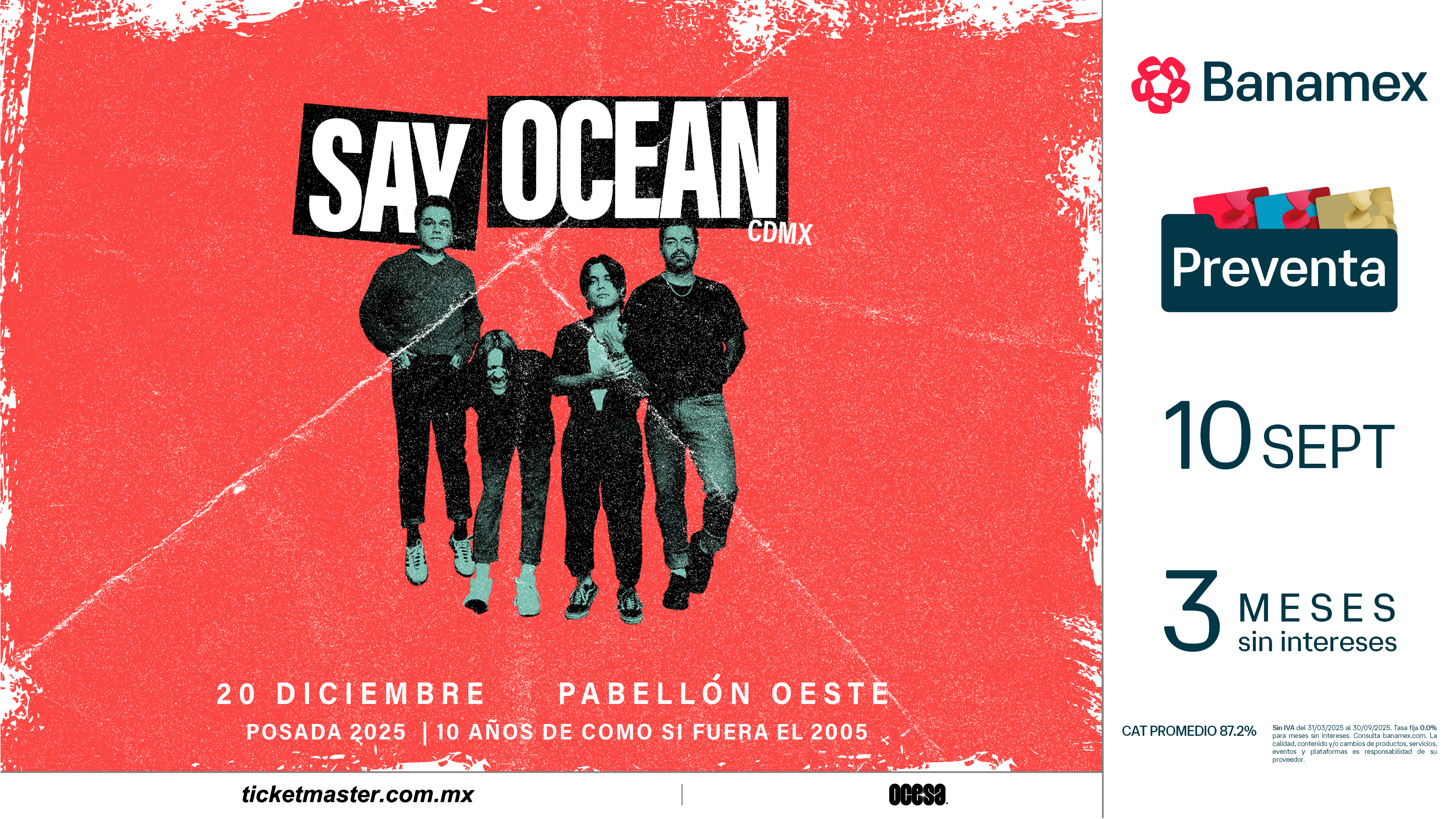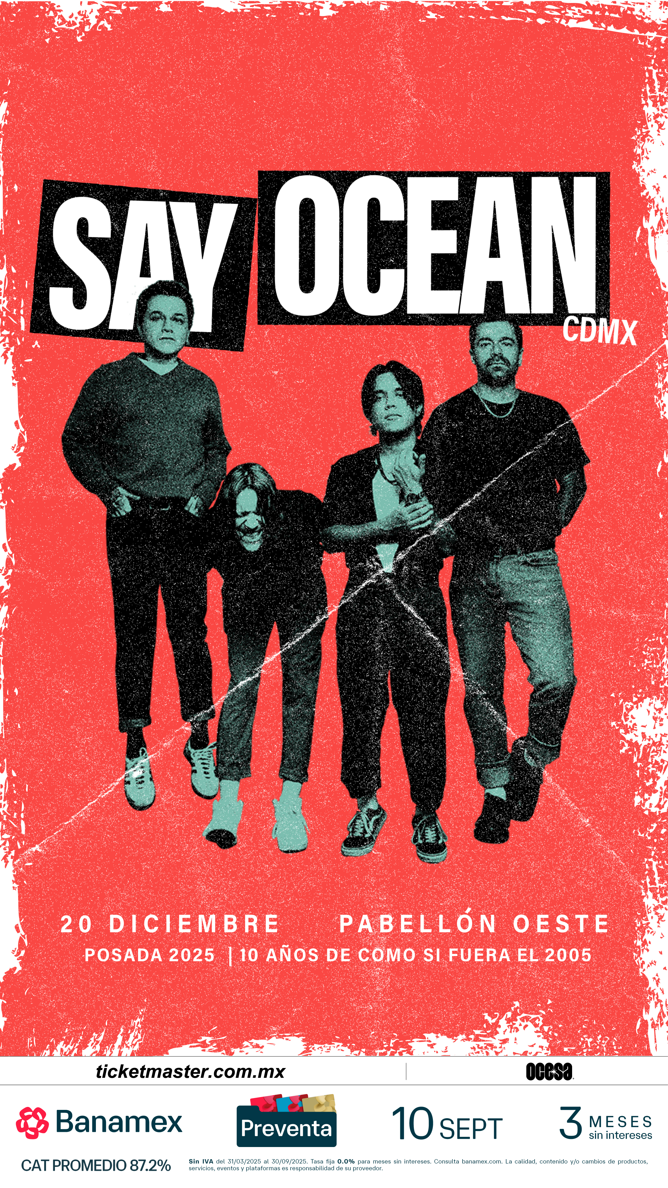 Entre guitarras, rebeldía, composiciones autónomas y un éxito que ha dejado huella de forma generacional, Say Ocean está listo para regresar a los escenarios. Es momento de dejar el celular, ponerse las mejores botas y revivir los éxitos del pop punk mexa junto a la banda que le ha dado un giro a la escena. Asegura tus boletos en la Preventa Banamex el próximo 10 de septiembre, o bien, en la venta general que se liberará el 11 de septiembre a través de Ticketmaster o en la taquilla del inmueble.