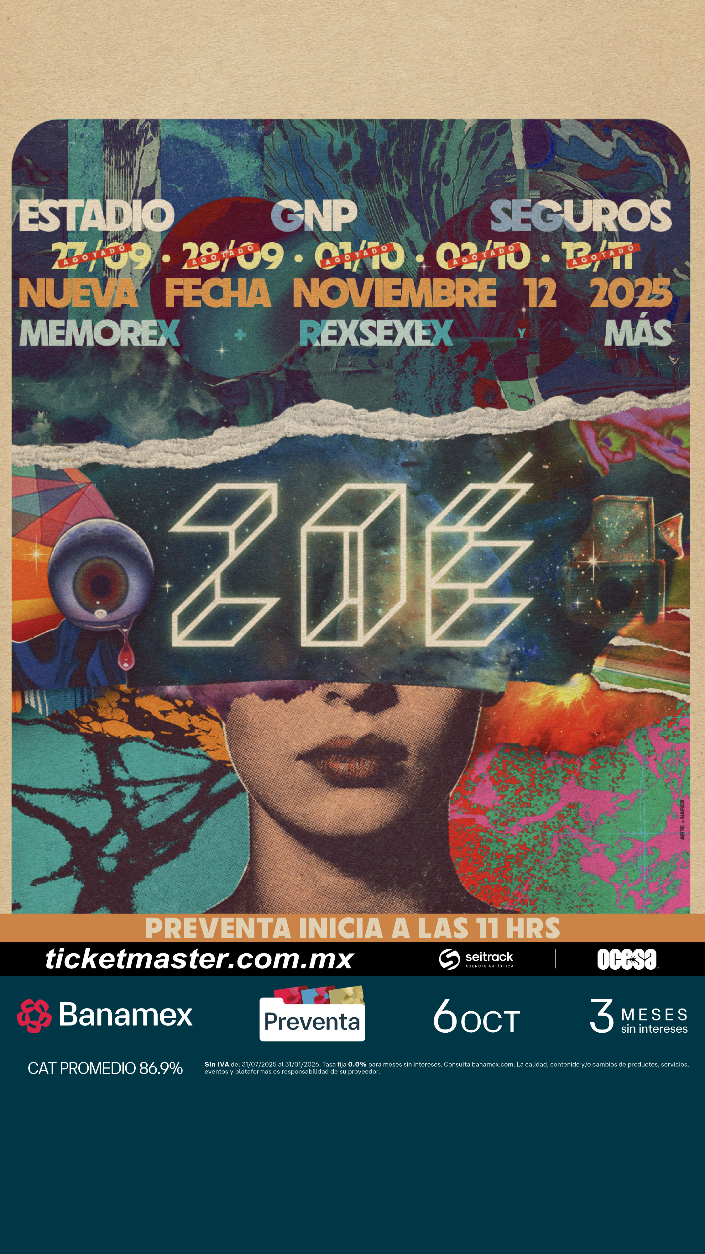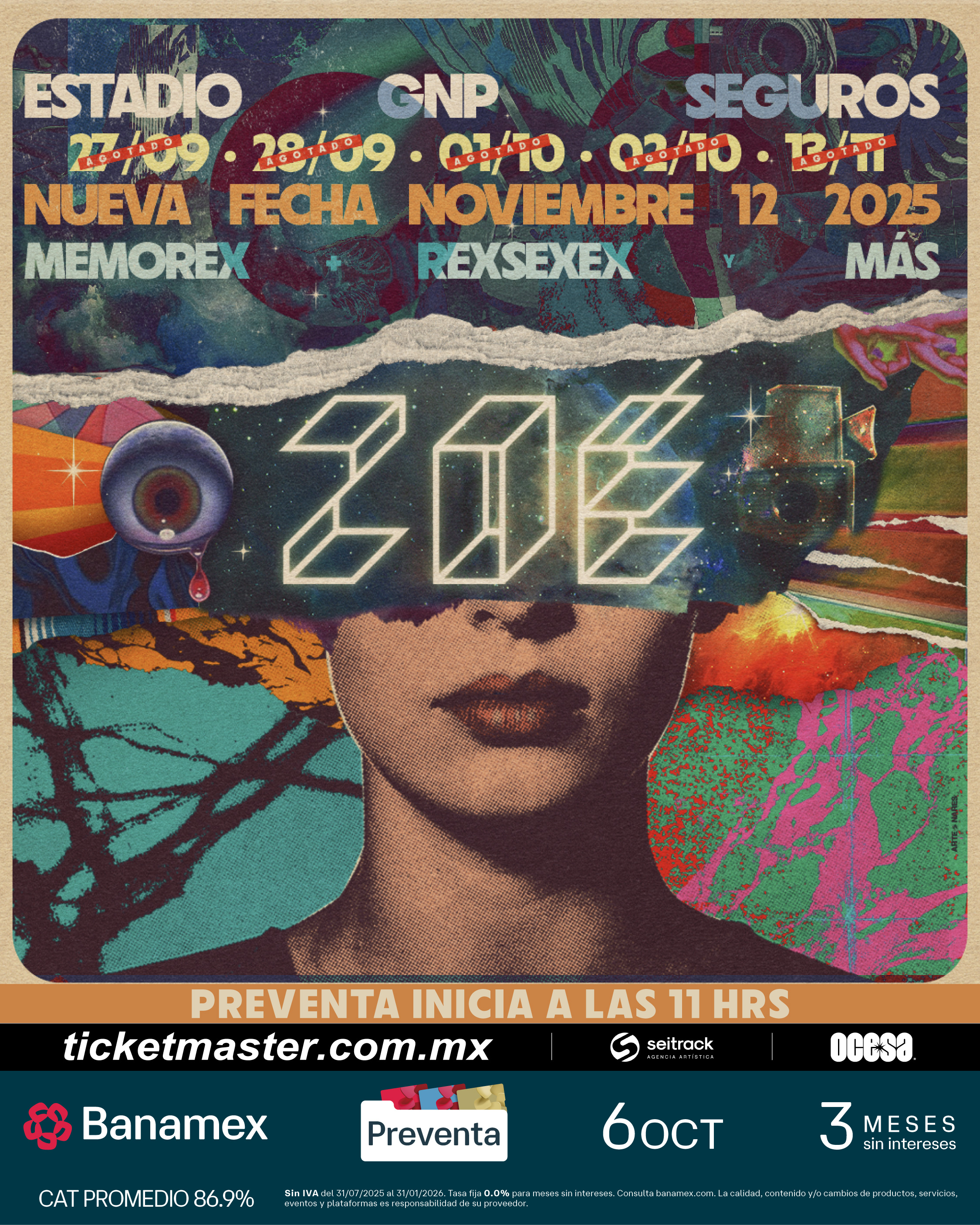 Si alguna vez has amado, sanado o soñado con las letras de Zoé, esta es tu oportunidad de volver a vivirlo o de experimentarlo por primera vez en un concierto que ya es historia viva de la música en México. Adquiere tus boletos para la nueva fecha en la preventa Banamex el 6 de octubre, y un día después los podrás adquirir en las taquillas del inmueble o a través de www.ticketmaster.com.mx.