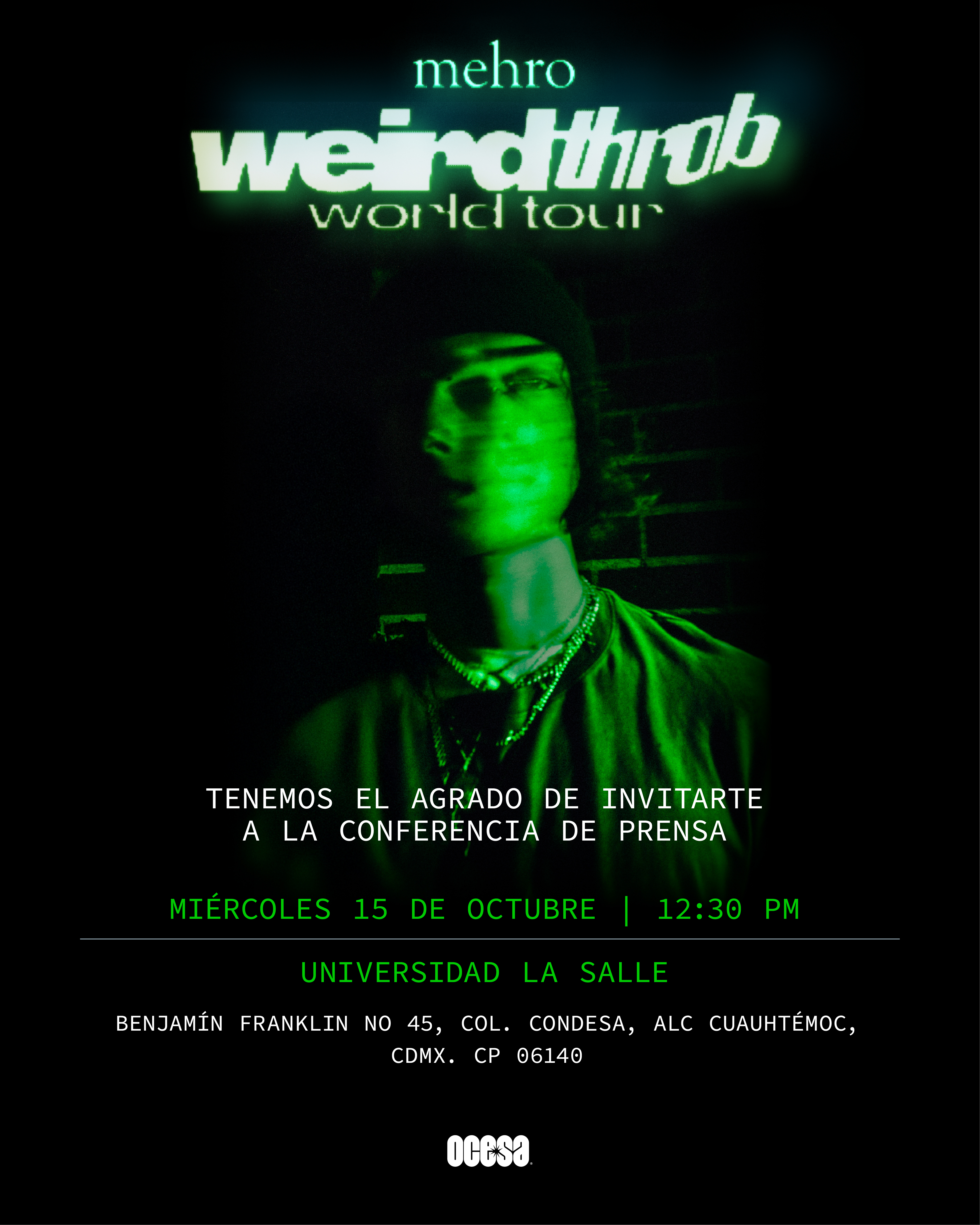 Les invitamos cordialmente a la conferencia de prensa con mehro, joven artista originario de Los Ángeles que compartirá detalles de su más reciente disco, Weirdthrob, así como de su gira, misma que lo trae de regreso a la CDMX para presentarse este 8 de diciembre en el Auditorio BB.