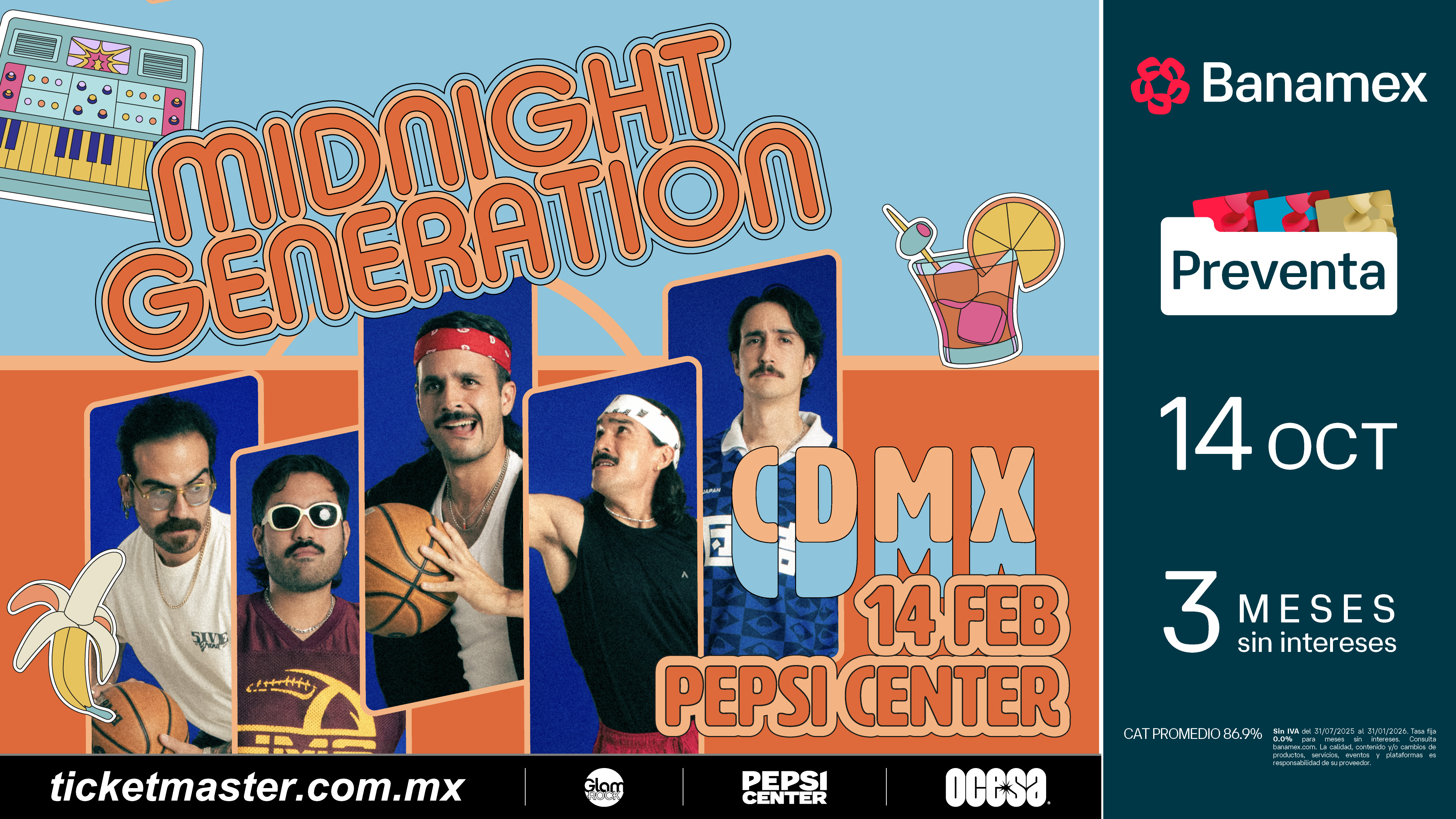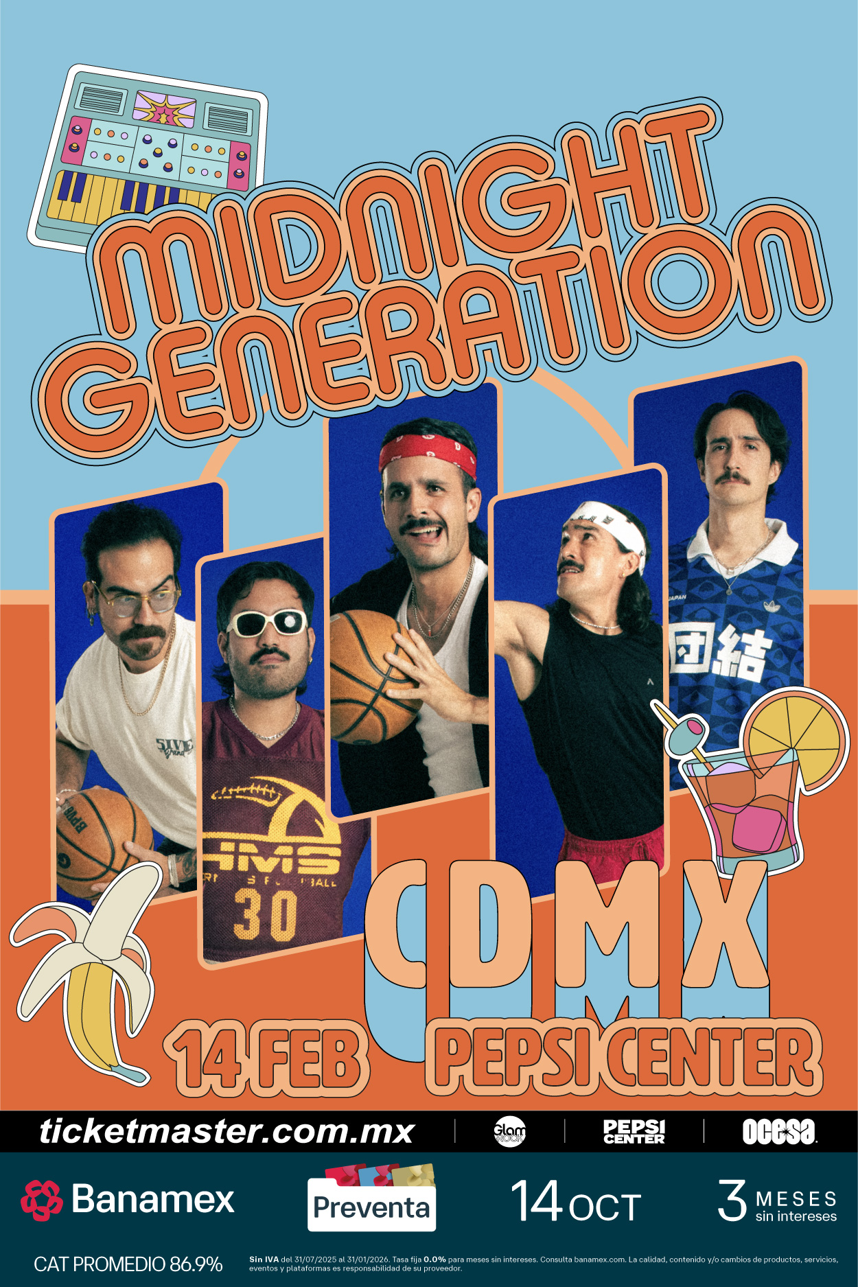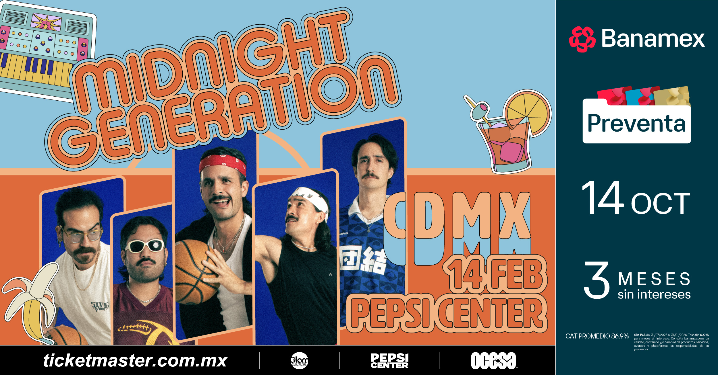 ¡Funk hecho en México, señores! Una de las bandas de electrofunk más importantes de nuestro país está de vuelta en casa. Después de conquistar Europa y agotar fechas en Estados Unidos, Midnight Generation –los mismísimos Daft Punk mexicanos– regresan con más groove, sintetizadores retro y todo ese mood que nos hace bailar hasta que duelan los pies. Prepárense para una noche increíble de electrofunk en la selva de asfalto el próximo 14 de febrero en el Pepsi Center.