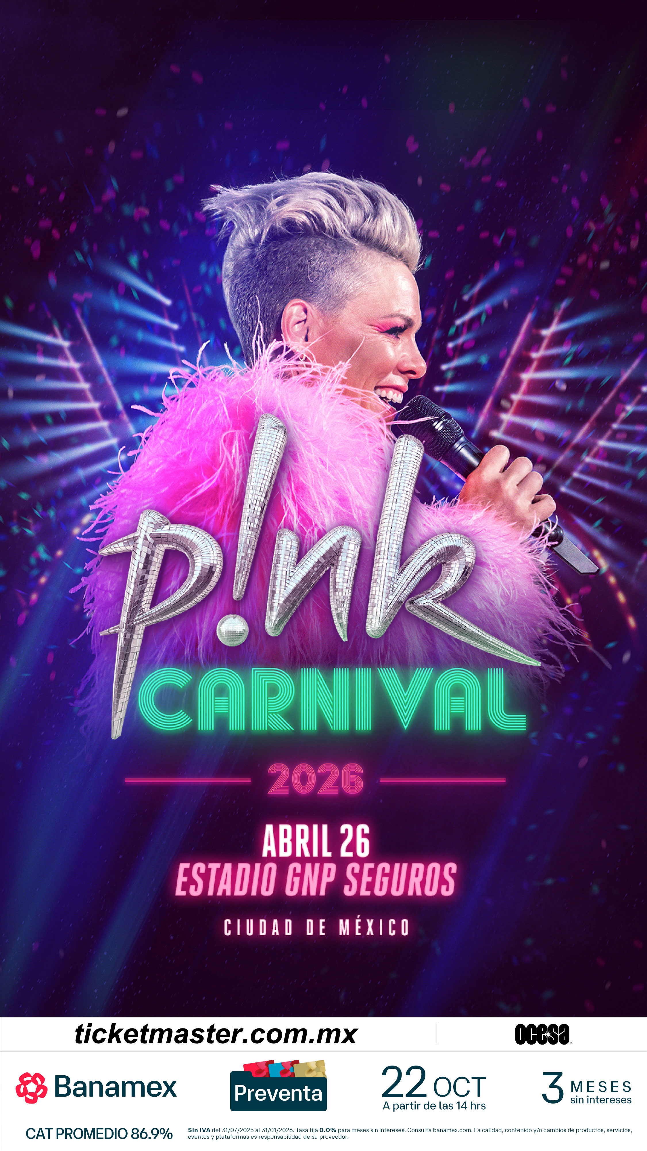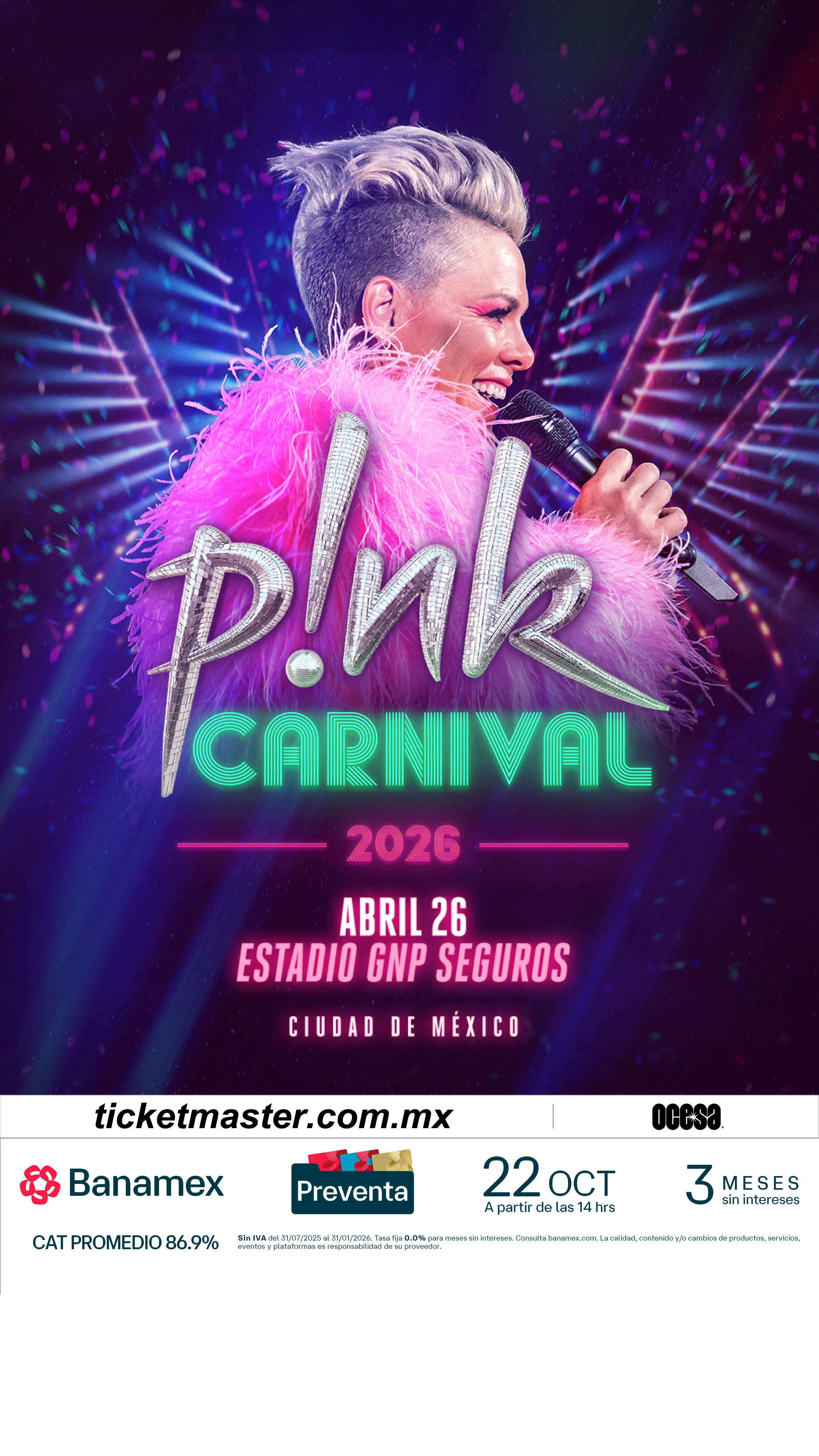 La cantante, intérprete, icono del pop internacional y ganadora de tres premios Grammy, P!NK, anuncia hoy su esperado show en México. La gira Carnival Tour llegará al Estadio GNP Seguros de la Ciudad de México, el próximo 26 de abril de 2026.