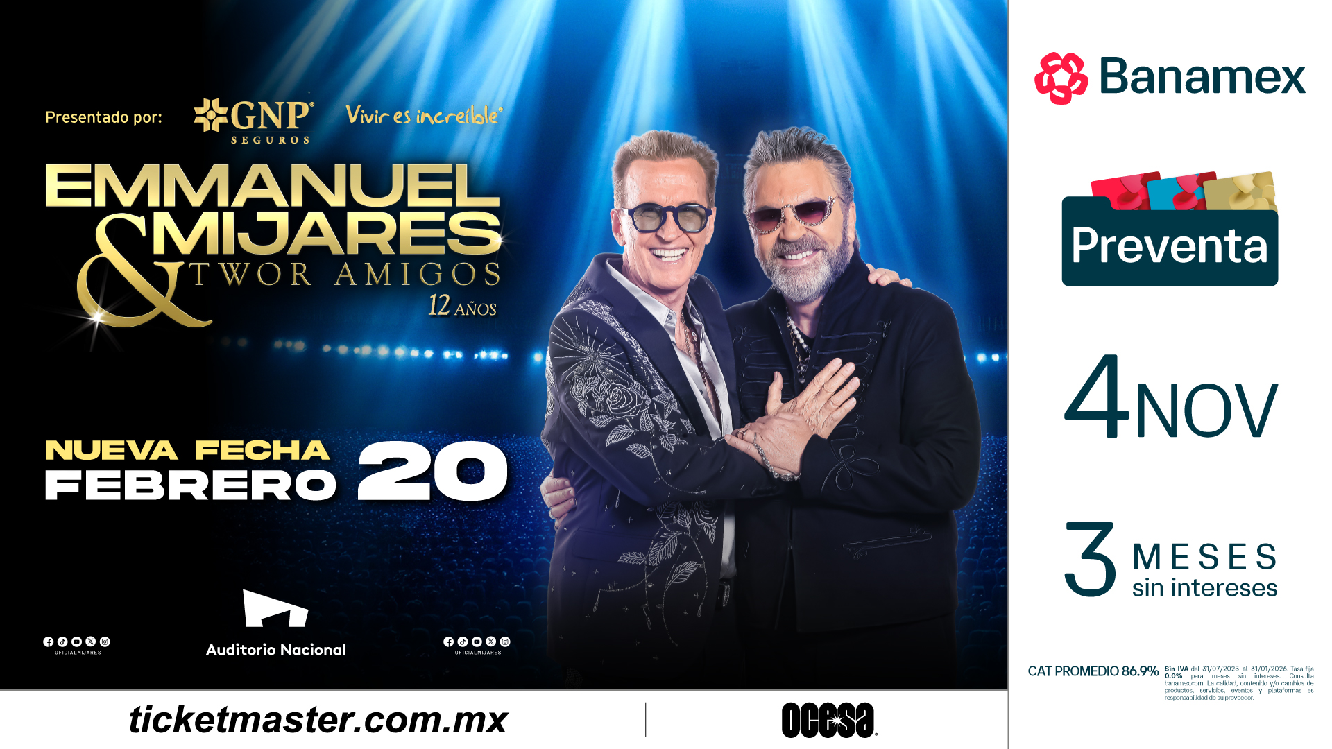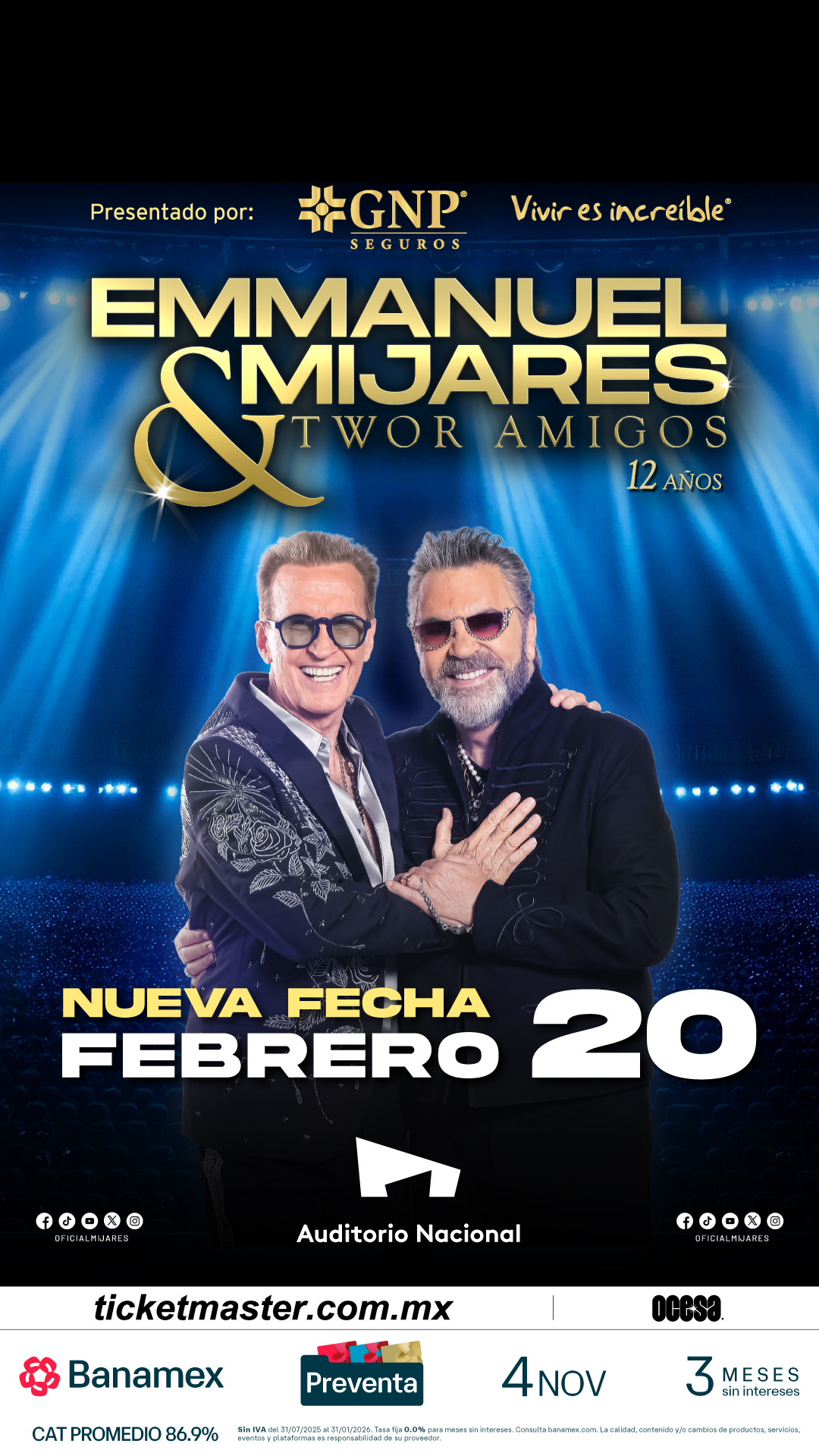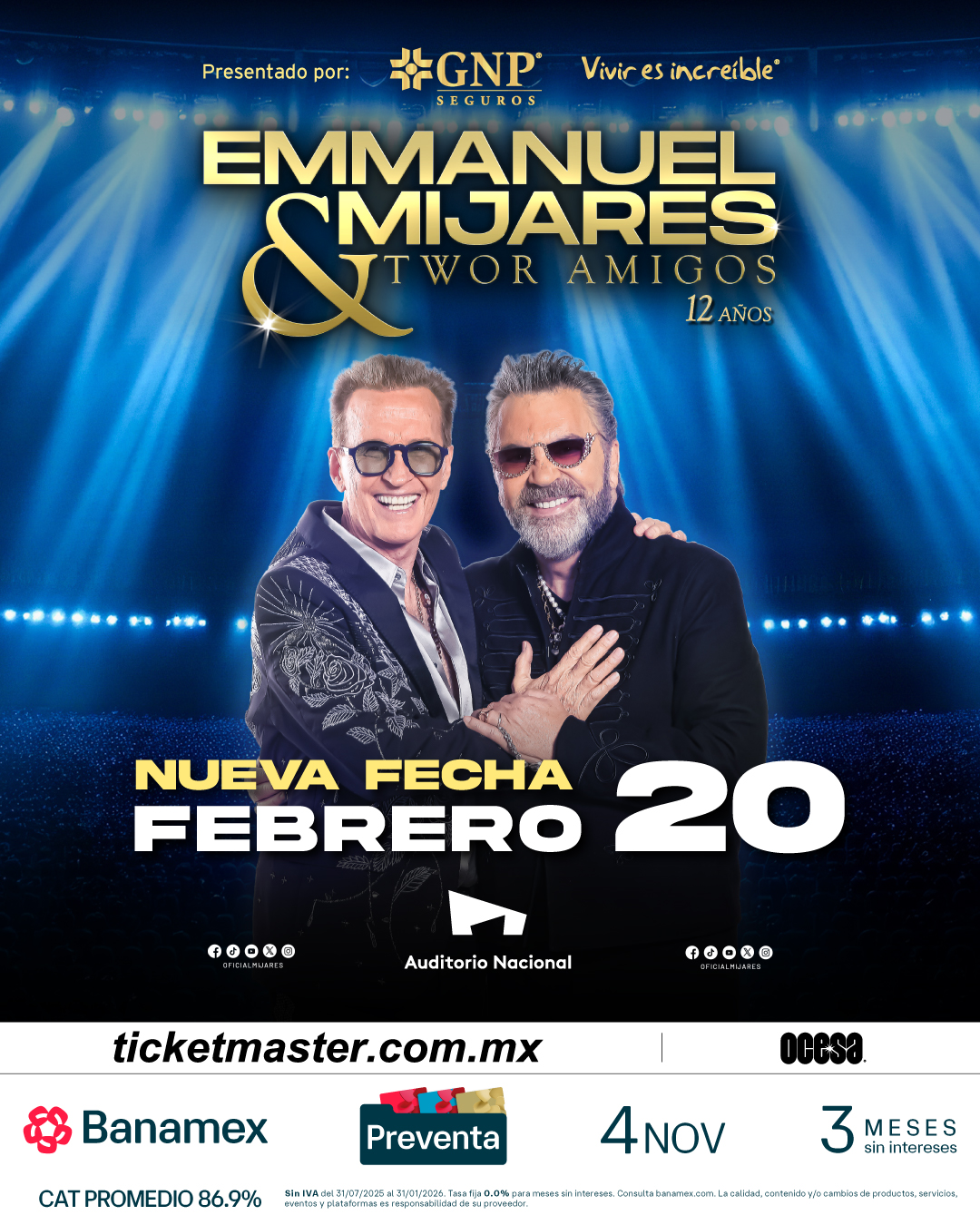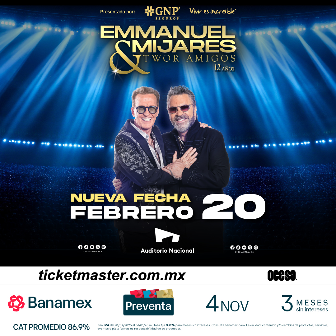La dupla más exitosa y querida de la música en español está de vuelta con un show más. No hace falta mencionar que Emmanuel & Mijares regresarán al máximo escenario de Reforma para continuar la serie de conciertos que ya se ha convertido en una verdadera historia musical. La cita es en el emblemático Auditorio Nacional el próximo 20 de febrero de 2026. ¡Prepárense para vivir uno de los espectáculos más exitosos de los últimos 10 años!