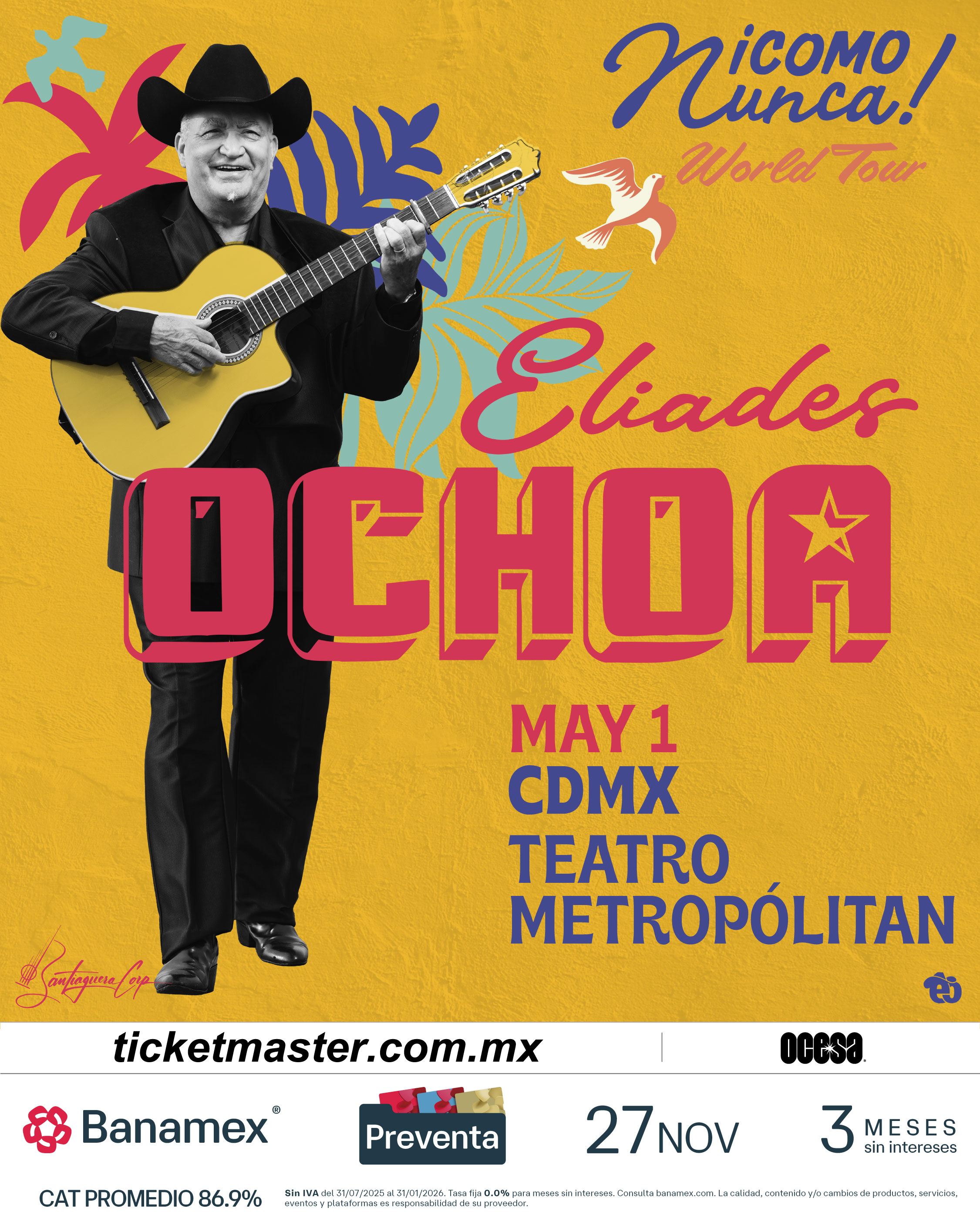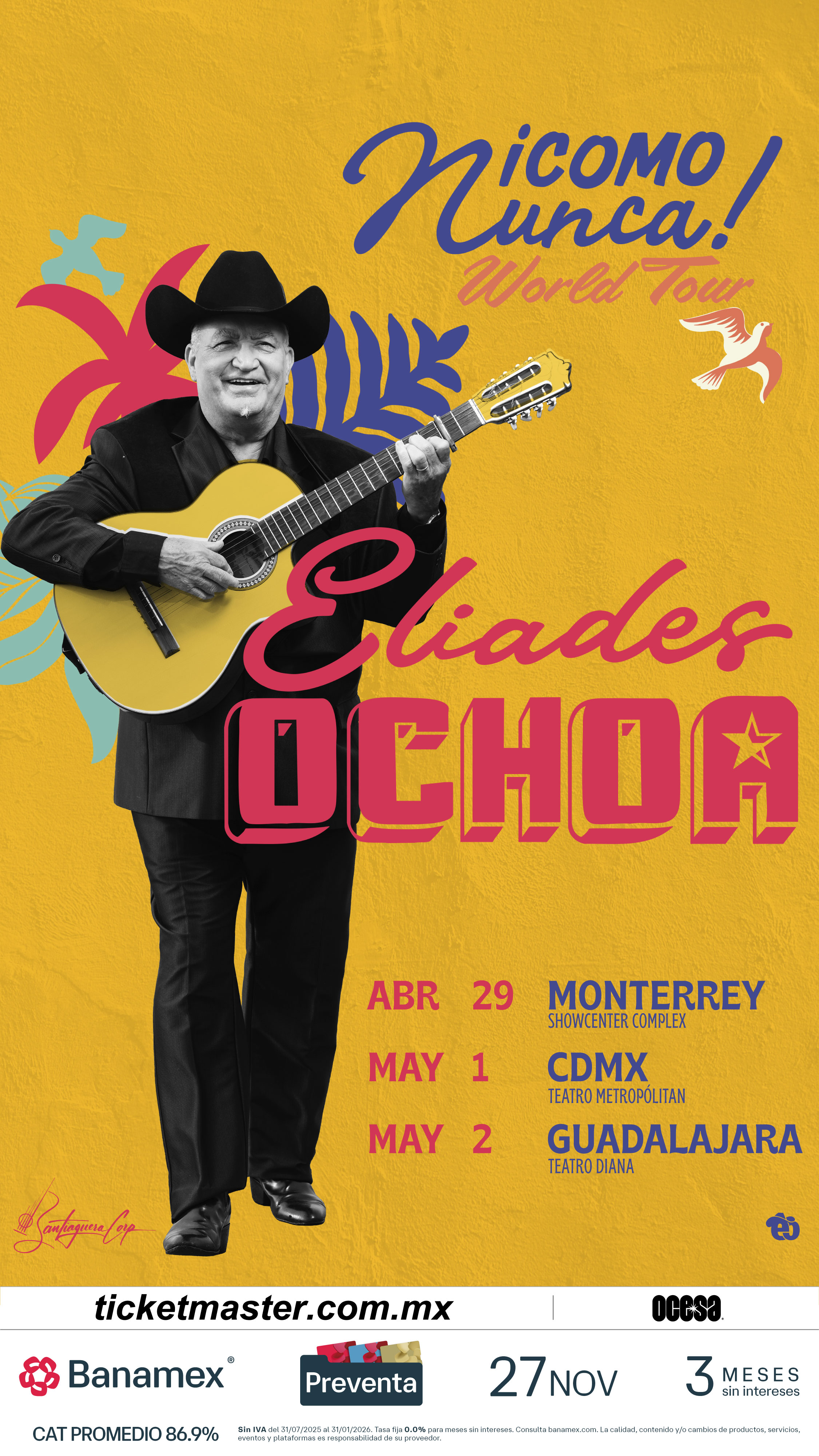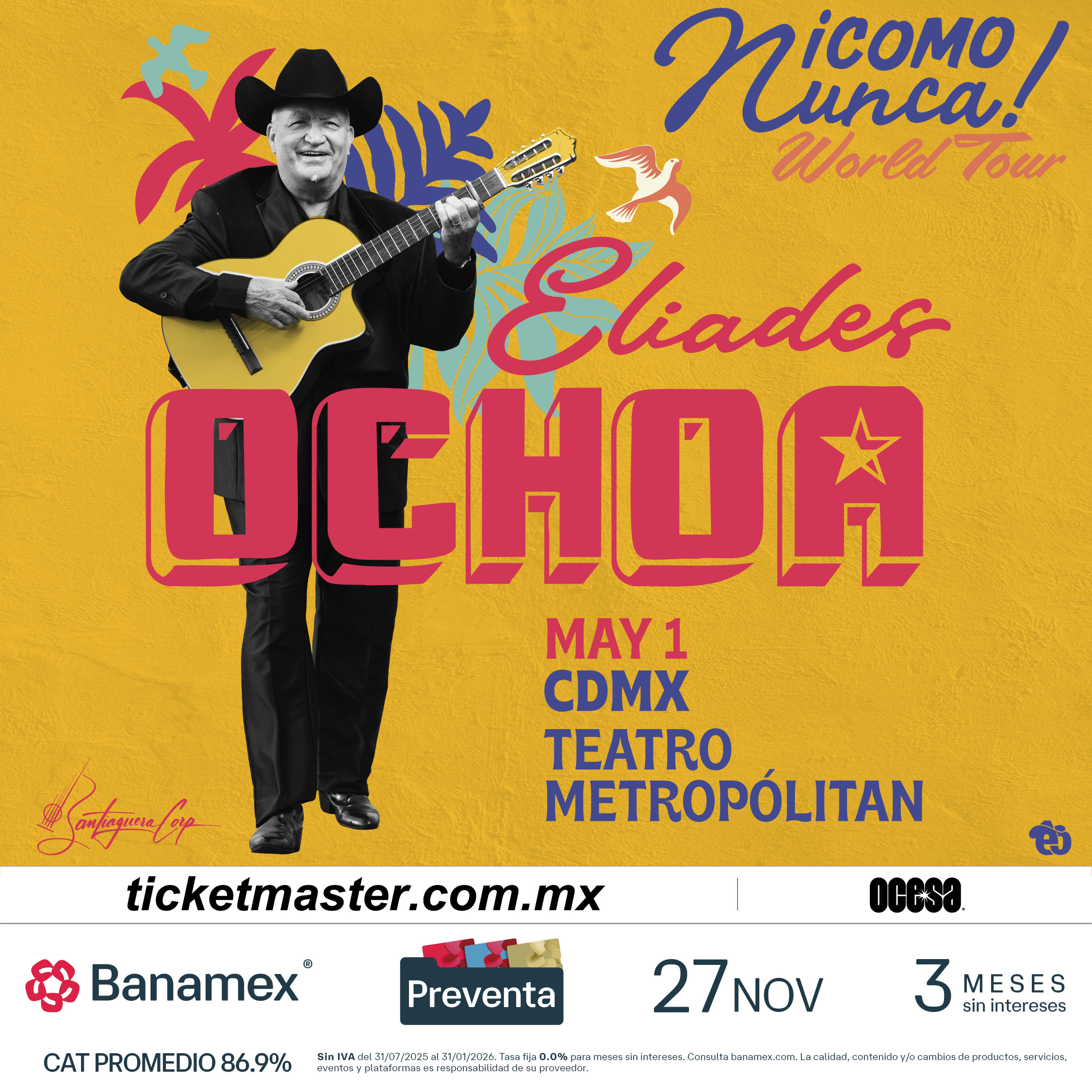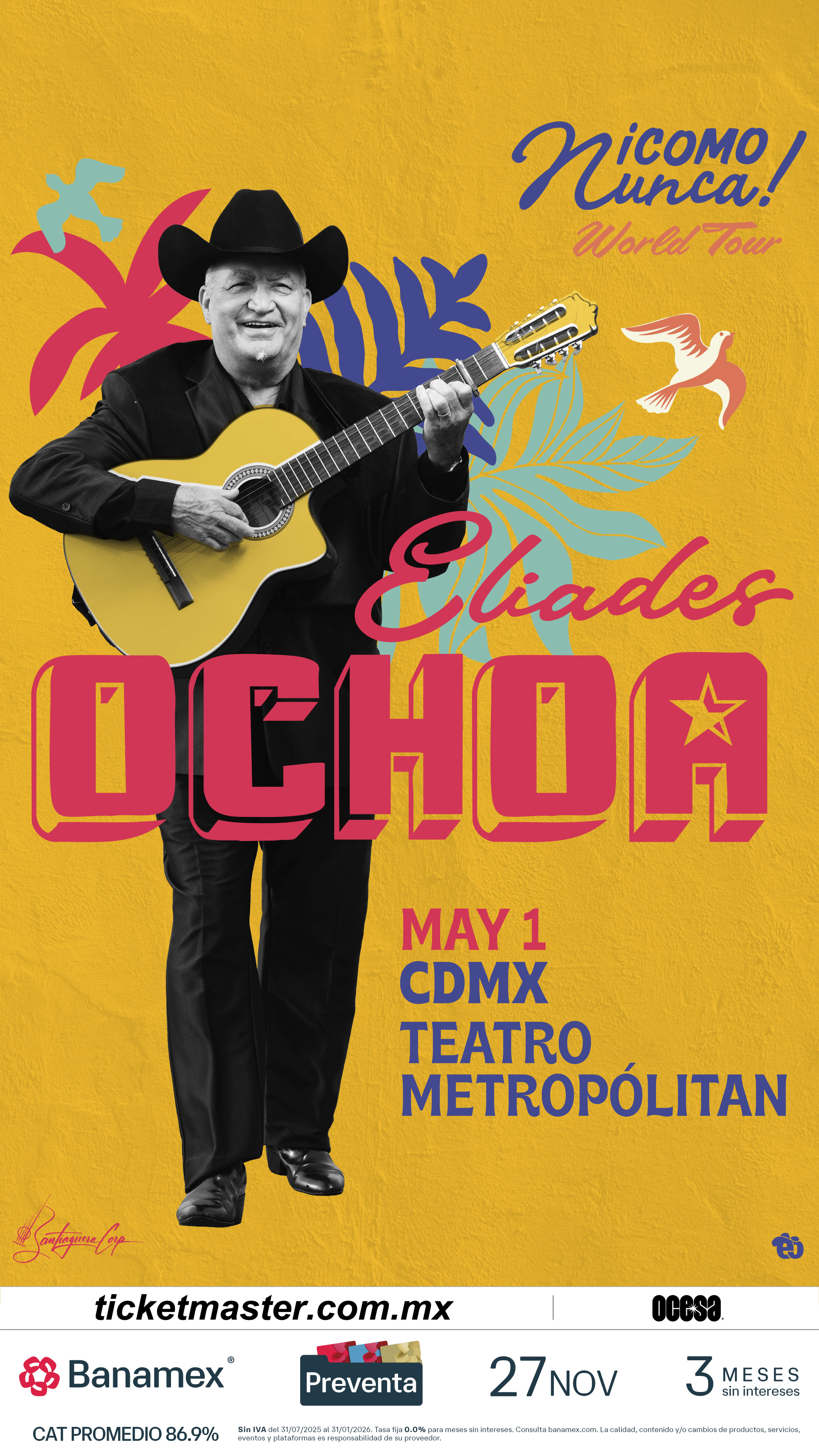 La leyenda viva de la música tradicional cubana, Eliades Ochoa, anuncia tres fechas en nuestro país el próximo 29 de abril en el Showcenter Complex, MTY; 1 de mayo en Teatro Metropólitan, CDMX y Teatro Diana en GDL el 2 de mayo. Prometiendo un concierto único que reúne más de cinco décadas de historia, virtuosismo y tradición sonora como parte de su gira internacional ¡Como Nunca!, misma, que atraviesa ciudades como Londres, Madrid, Vancouver, Ámsterdam, entre otras.
