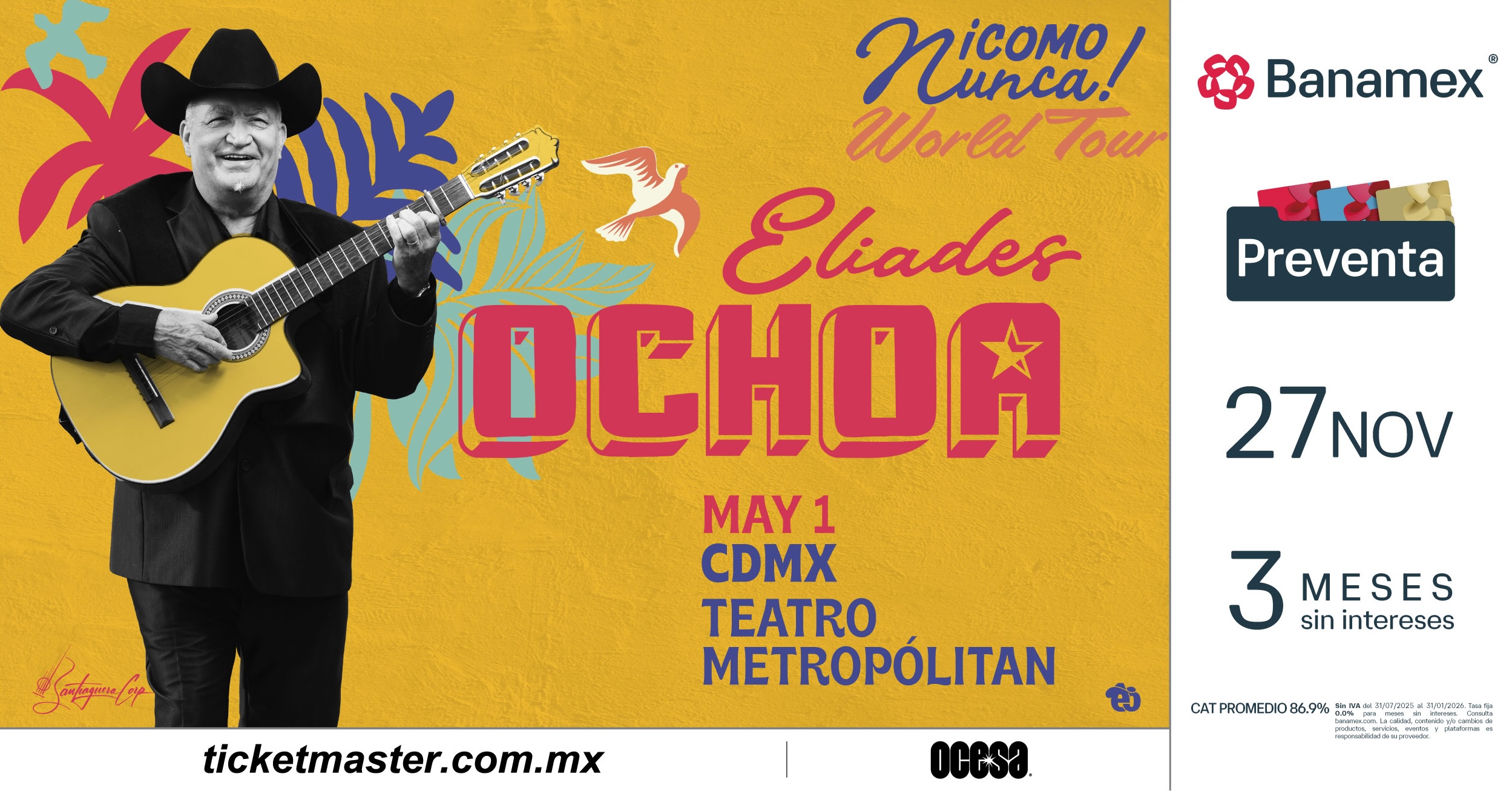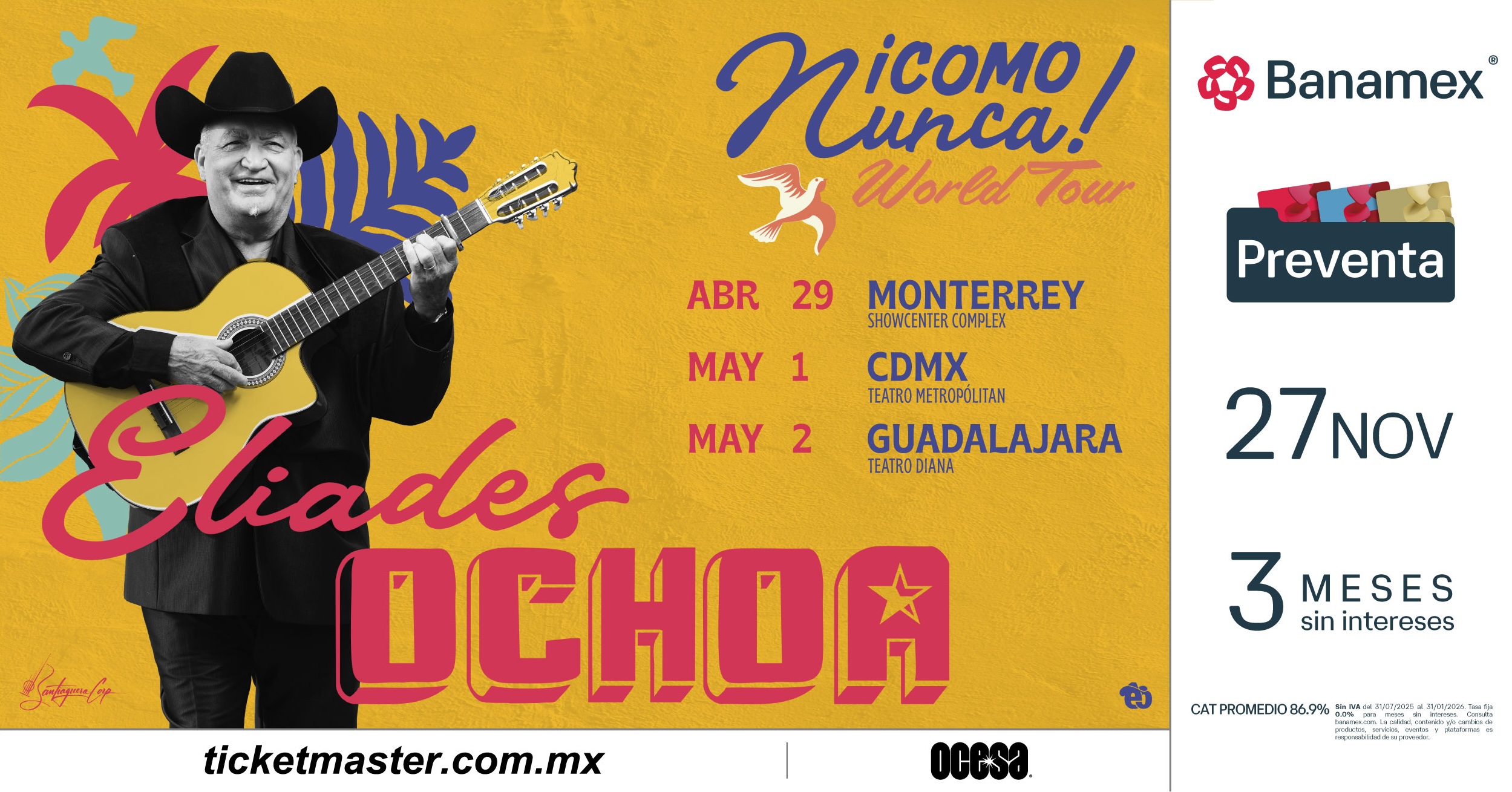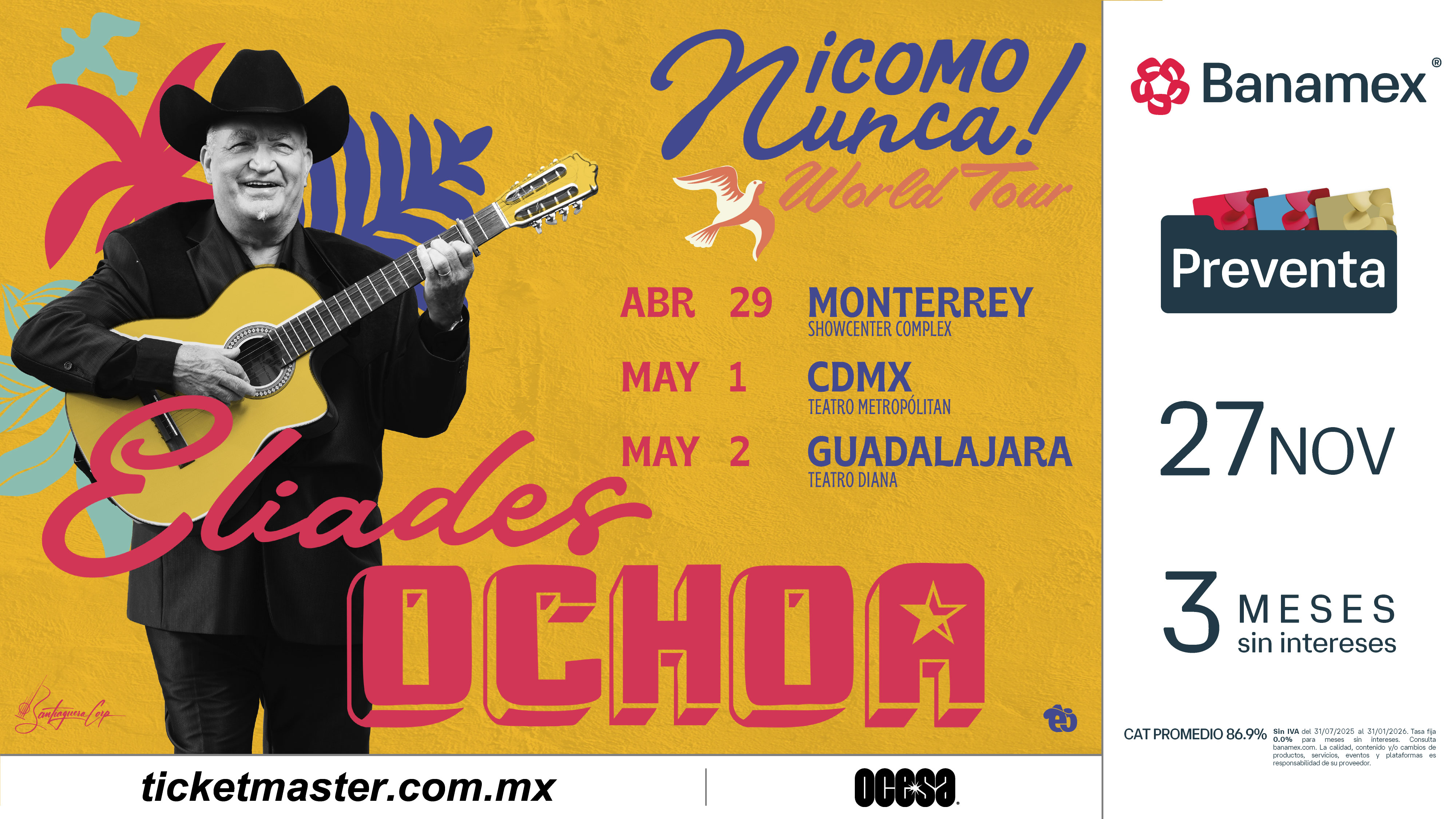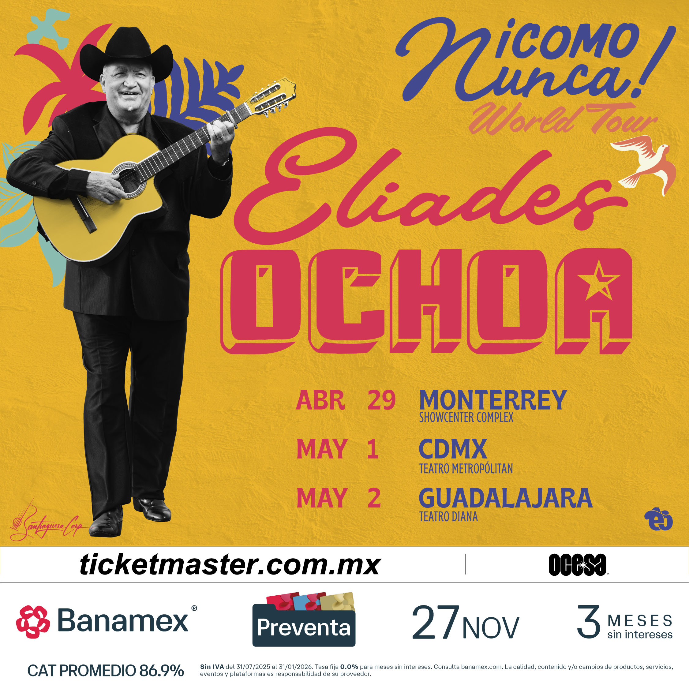 La leyenda viva de la música tradicional cubana, Eliades Ochoa, anuncia tres fechas en nuestro país el próximo 29 de abril en el Showcenter Complex, MTY; 1 de mayo en Teatro Metropólitan, CDMX y Teatro Diana en GDL el 2 de mayo. Prometiendo un concierto único que reúne más de cinco décadas de historia, virtuosismo y tradición sonora como parte de su gira internacional ¡Como Nunca!, misma, que atraviesa ciudades como Londres, Madrid, Vancouver, Ámsterdam, entre otras.