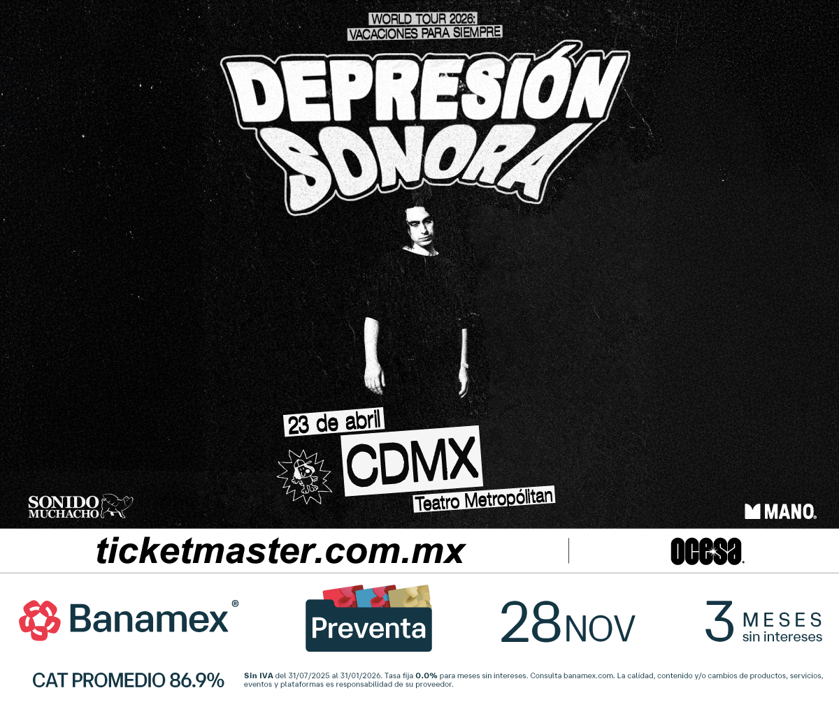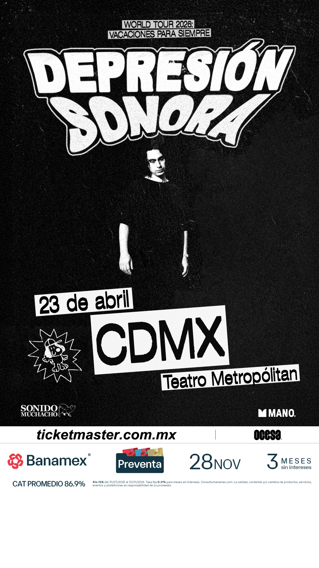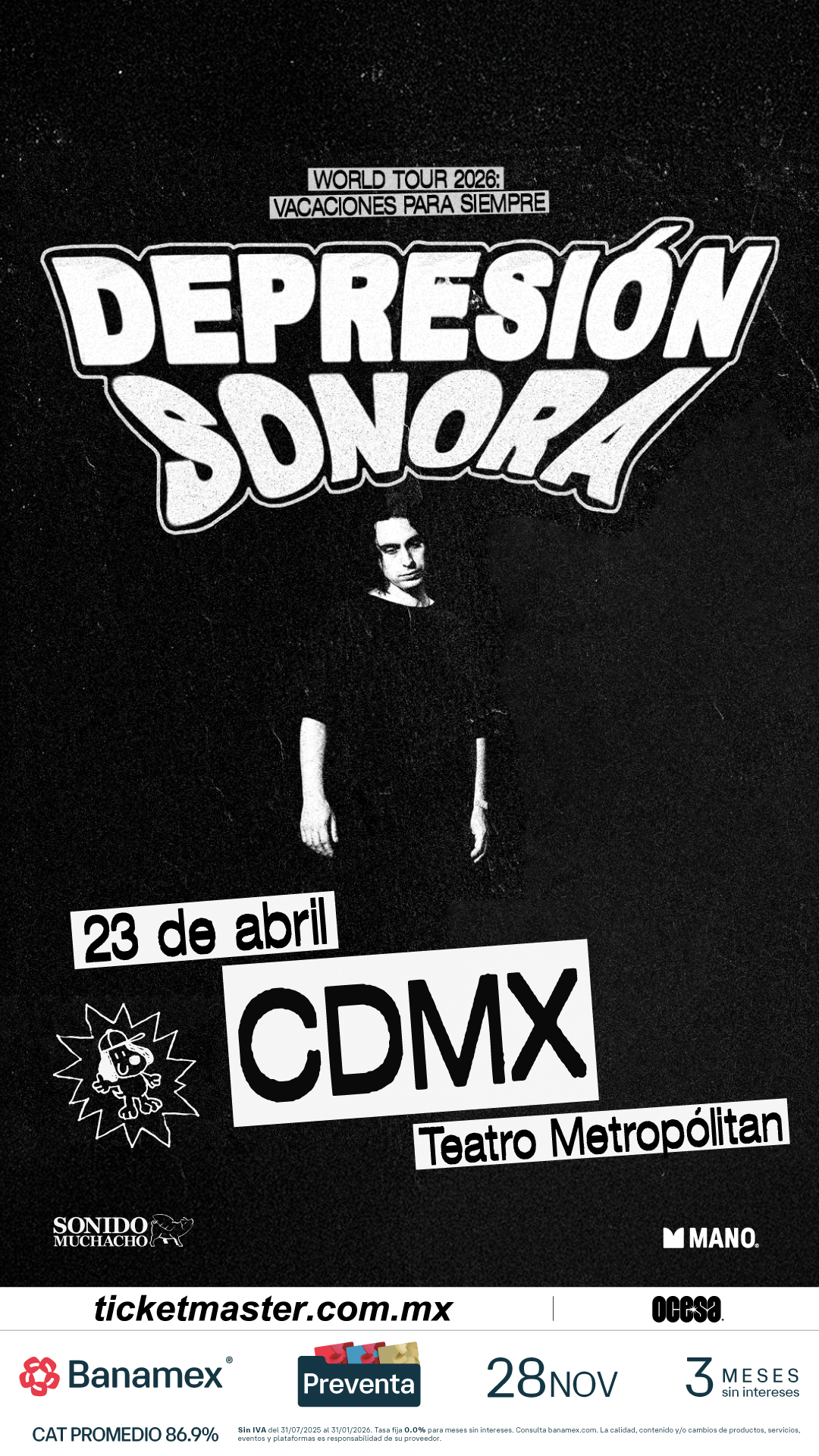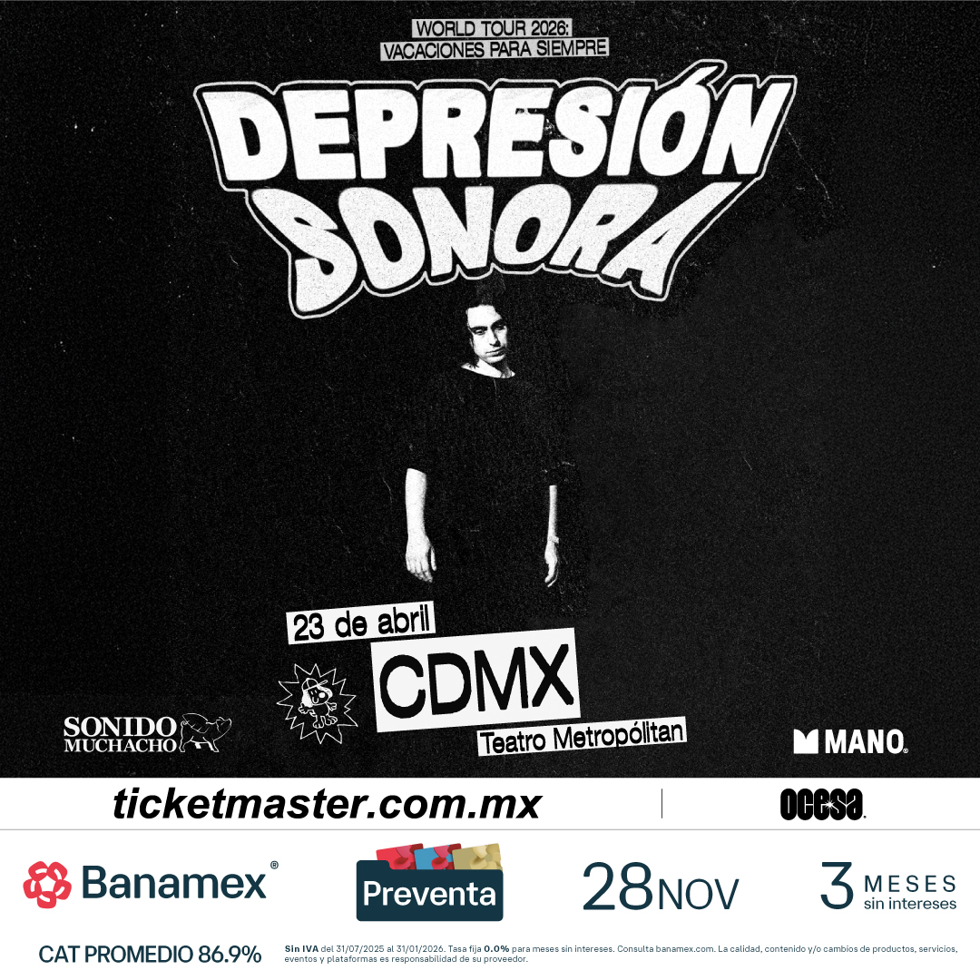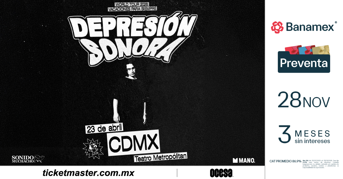 Súmate a la revolución de Depresión Sonora asegurando tus boletos durante la Preventa Banamex el próximo 28 de noviembre o bien, en la Venta General que se liberará un día después, el 29 de noviembre, a través de Ticketmaster o en la taquilla del inmueble.