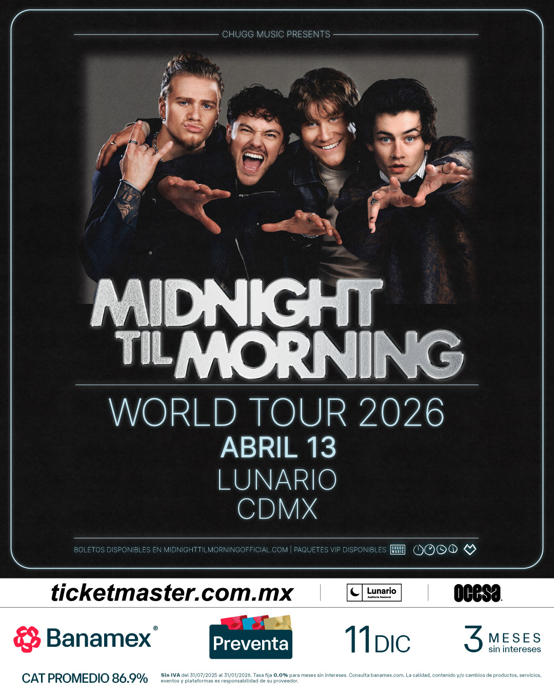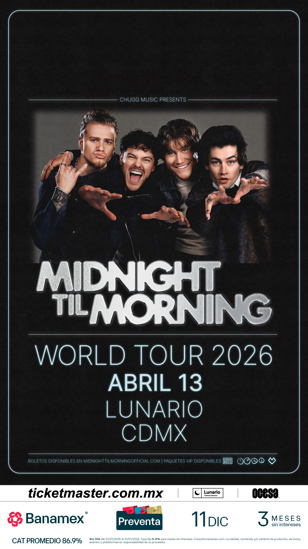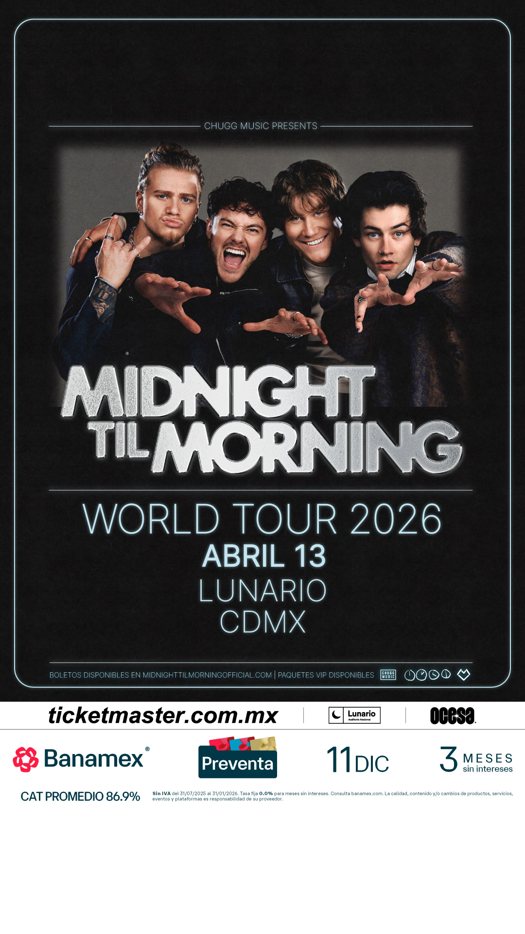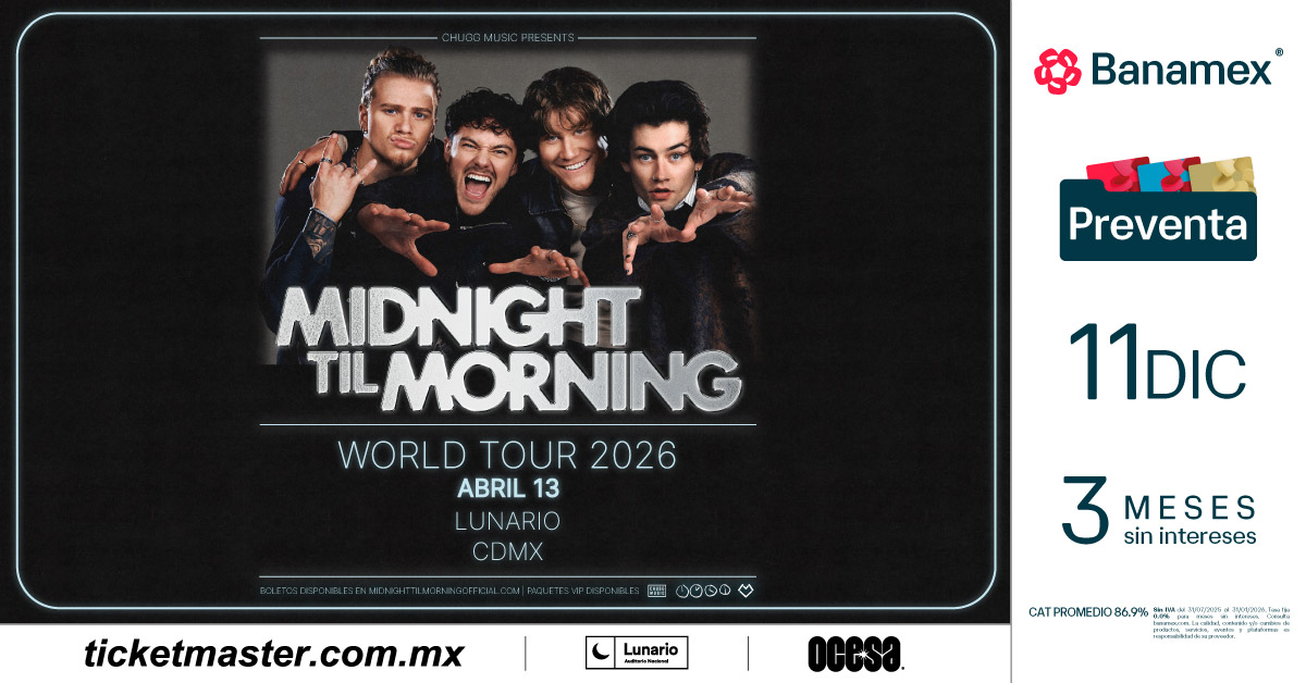 Forma parte del comienzo de Midnitght Til Morning, el grupo que está forjando su historia en la música. ¡No dudes más en asegurar tus boletos! Aprovecha la Preventa Banamex el 11 de diciembre o la Venta General que se liberará un día después, el 12 de diciembre a través de Ticketmaster o en la taquilla del inmueble.