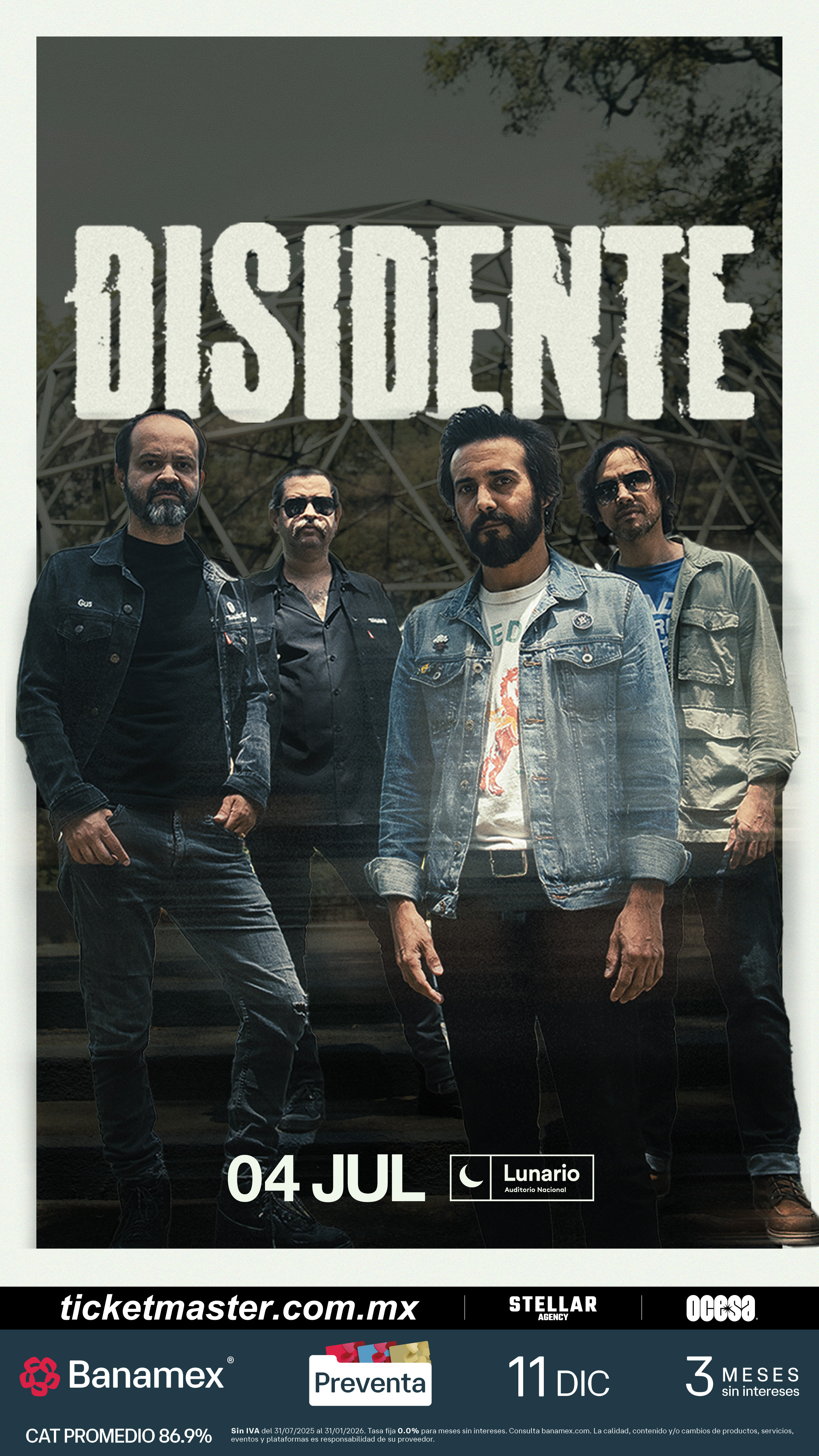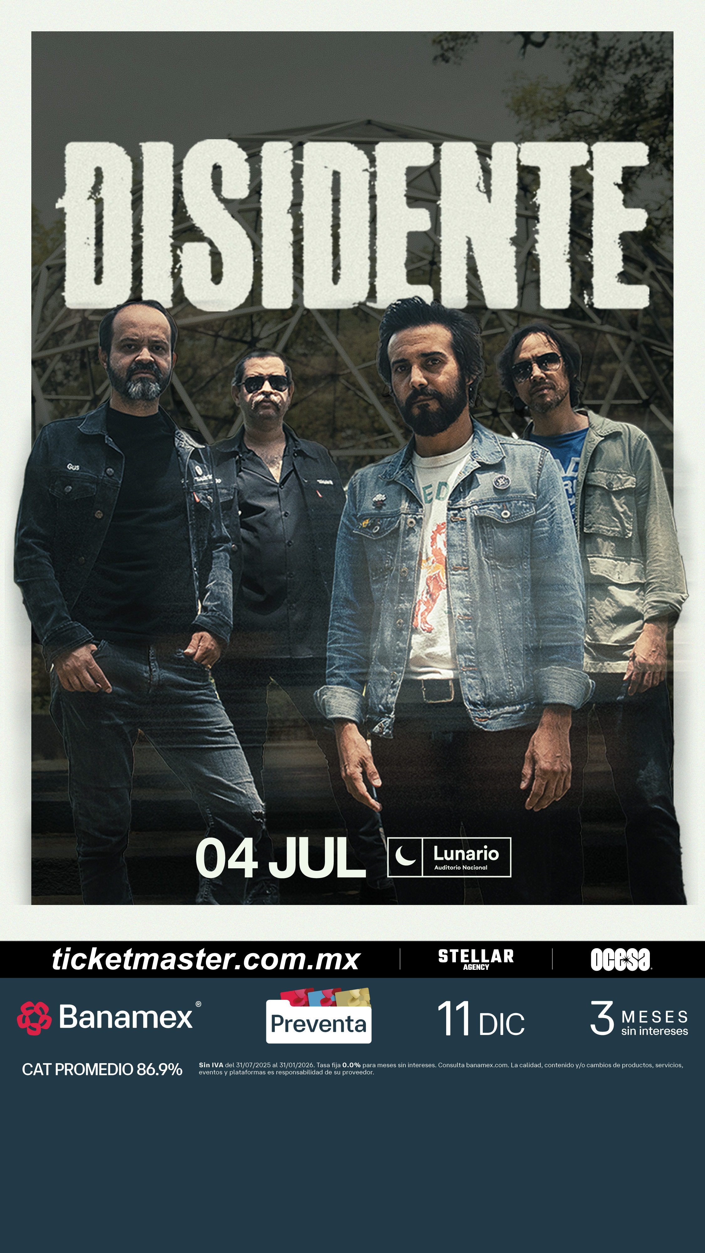 Prepárate para una noche cargada de energía y emociones, porque Disidente, una de las bandas más representativas del rock mexicano, llega el 4 de julio de 2026 a la Ciudad de México, para conquistar el escenario del Lunario del Auditorio Nacional. Con más de 20 años de trayectoria, el grupo originario de Guadalajara ha sabido combinar guitarras potentes y melodías profundas, creando un estilo que fusiona la actitud del indie rock post-garage con un universo creativo que sólo ellos dominan.