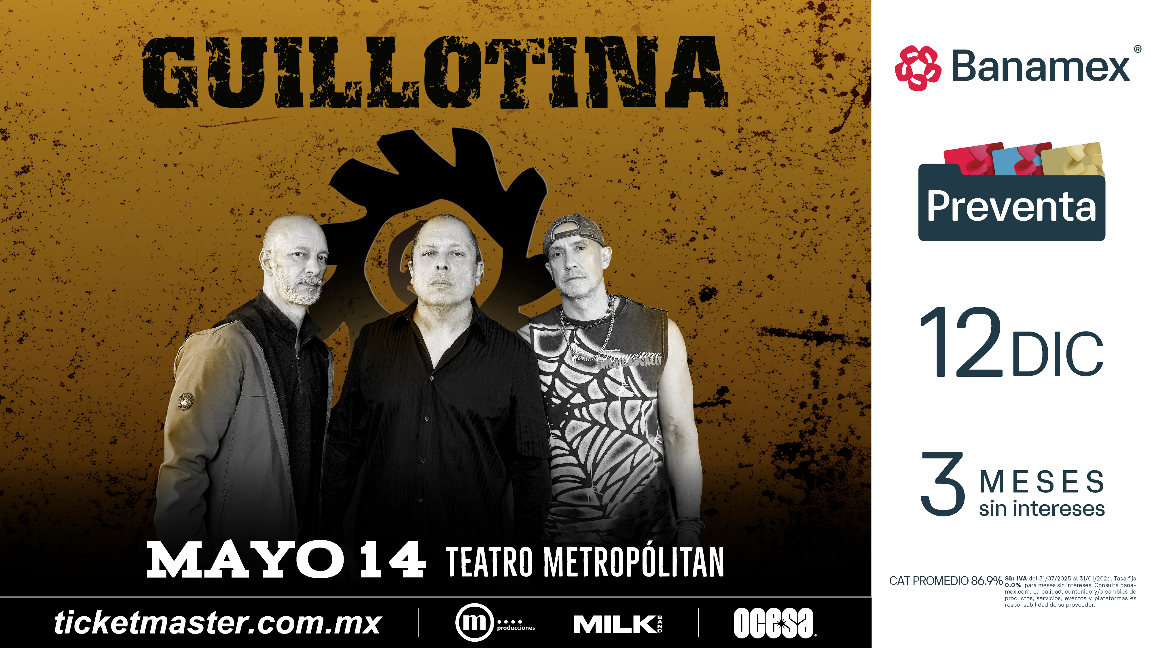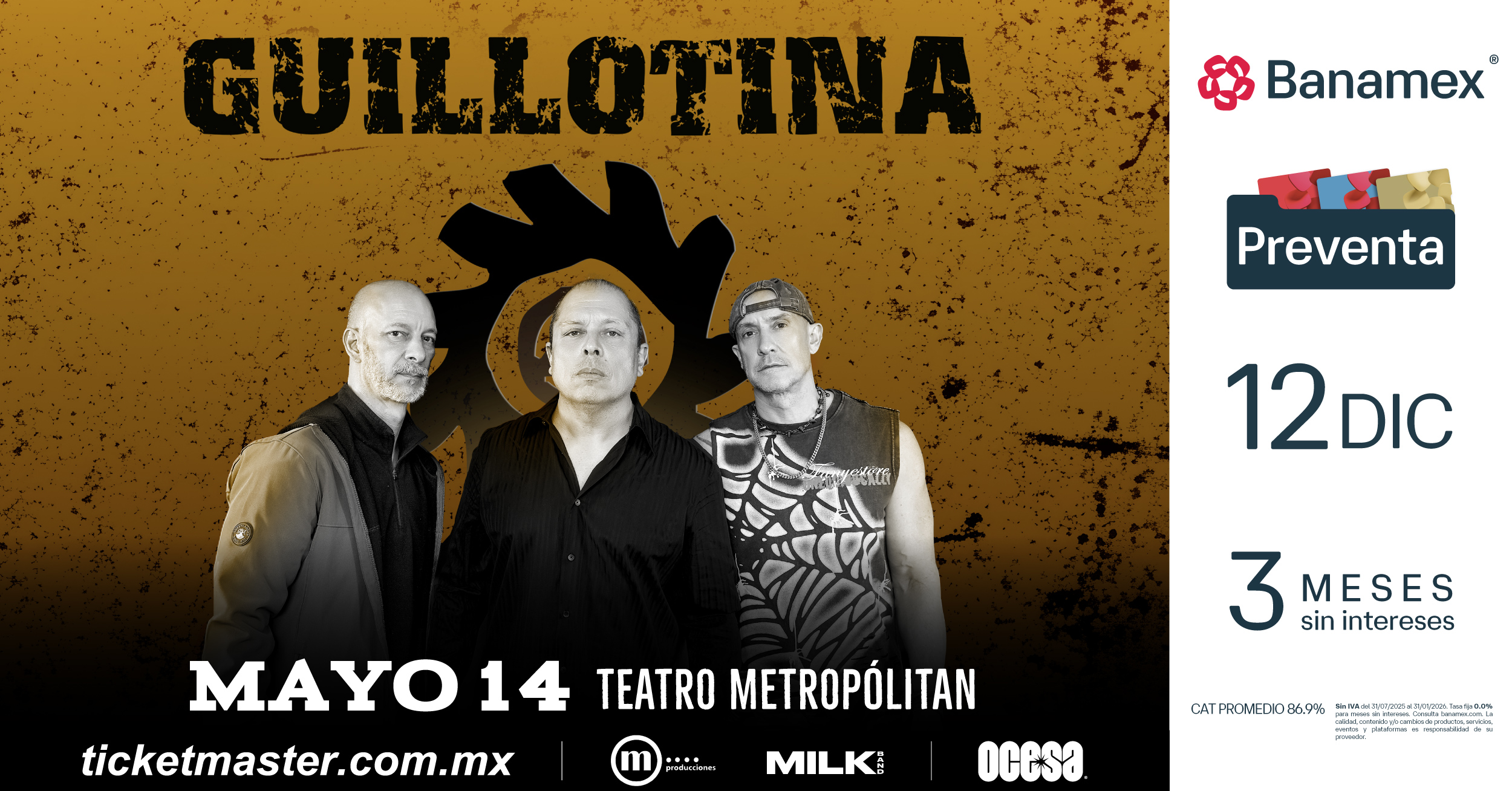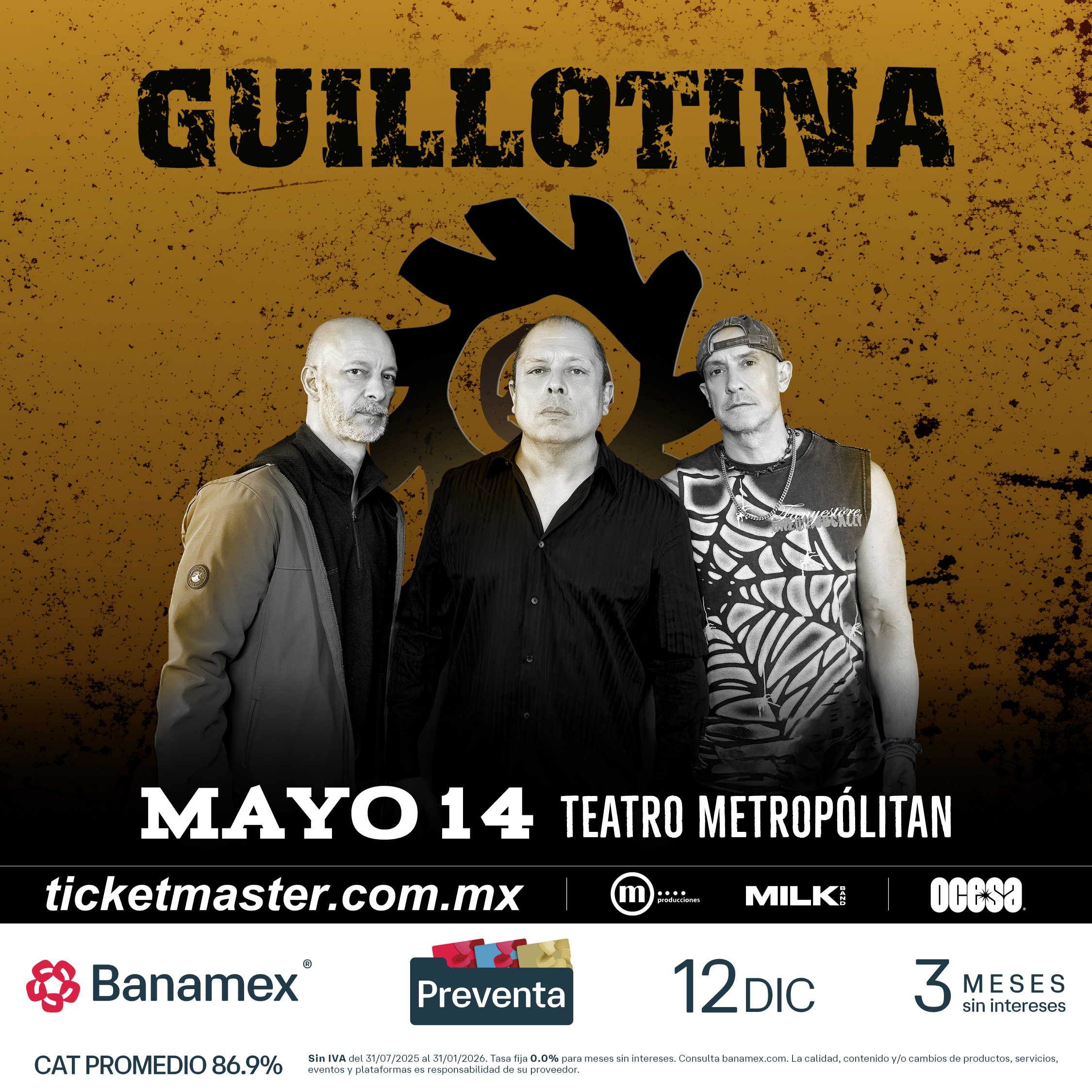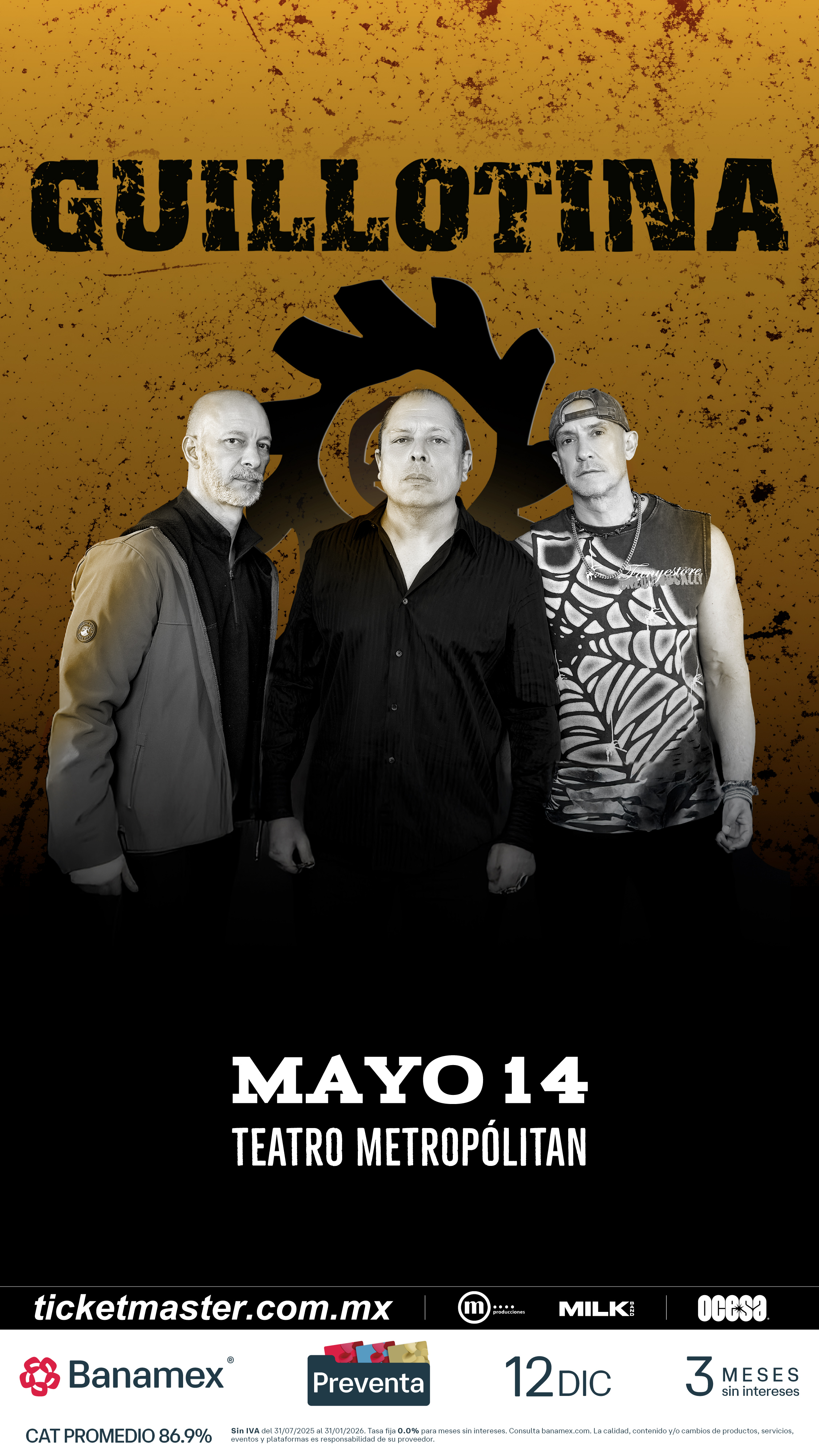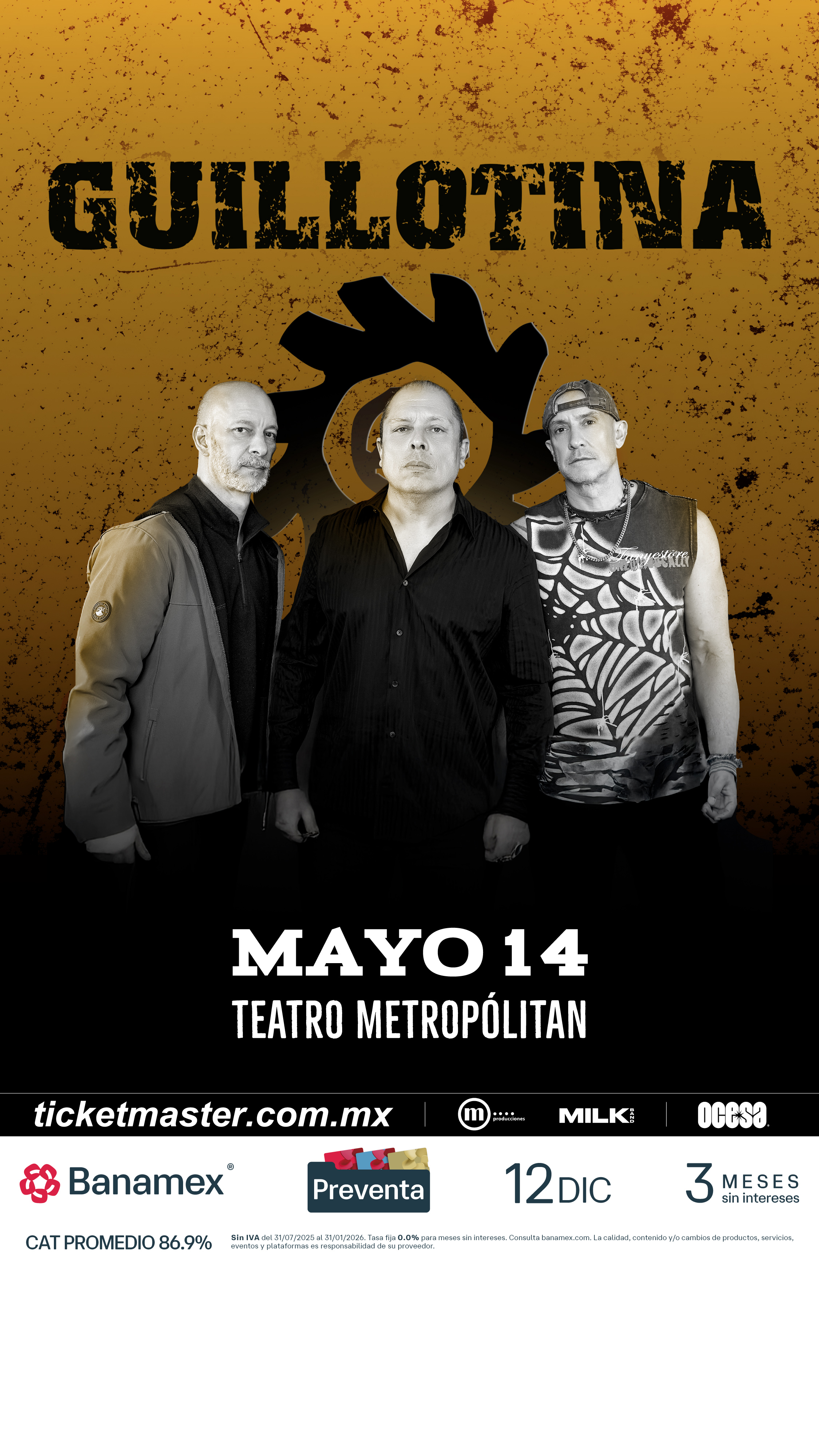 Con más de tres décadas de historia y un legado que permanece intacto, Guillotina reafirma la fuerza del rock mexicano para resistir y reinventarse desde sus raíces. Su regreso al Teatro Metropólitan, tras más de 15 años de ausencia en este escenario, representa un acontecimiento histórico. Sé parte de esto asegurando tus boletos durante la Preventa Banamex el próximo 12 de diciembre o bien, en la Venta General que se liberará el 13 de diciembre a través de Ticketmaster o en la taquilla del inmueble.