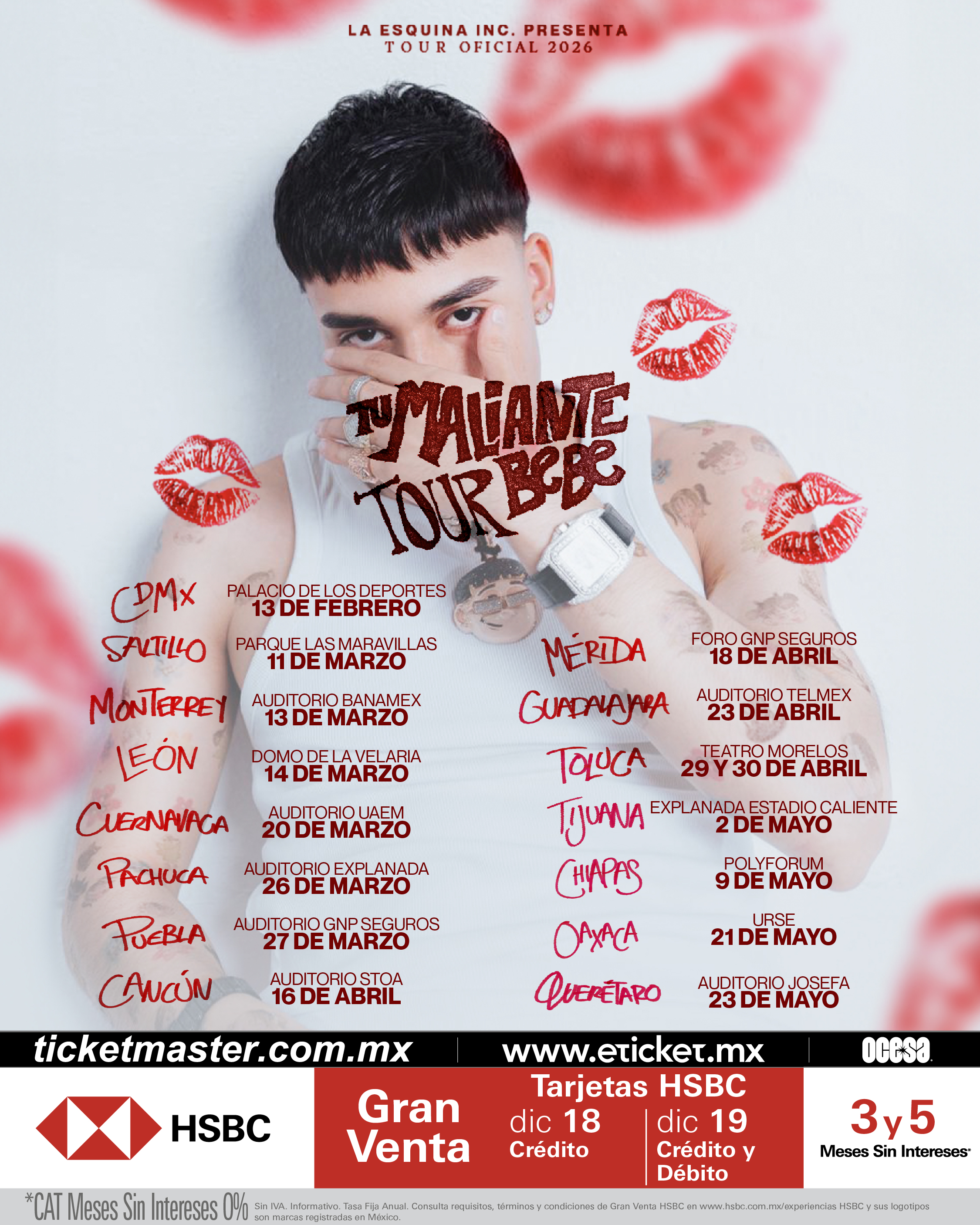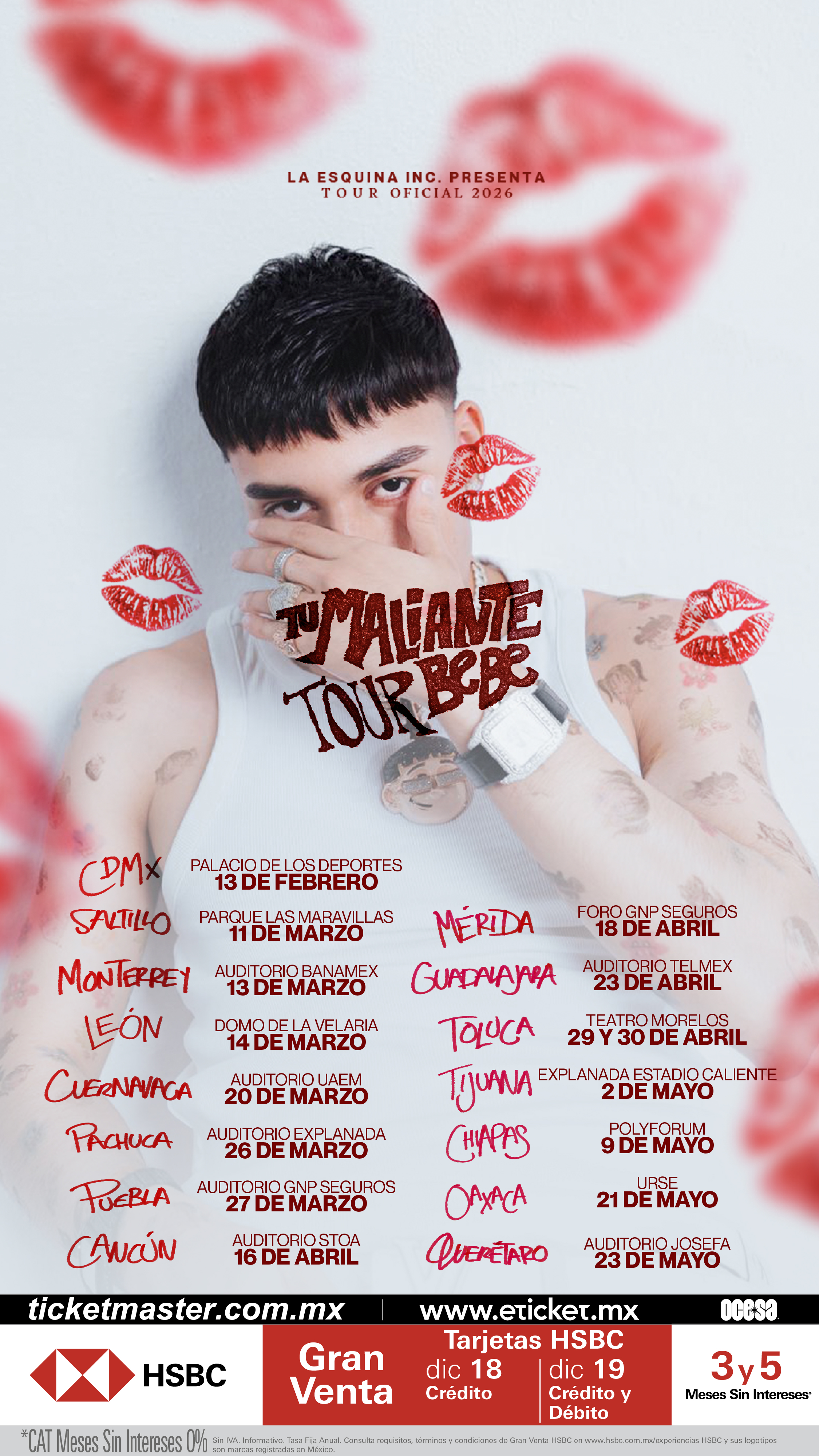 Esta es tu oportunidad de vivir la experiencia completa de TU MALIANTE BEBE TOUR, una serie de show irrepetibles para que disfrutes al poeta del reggaetón mexa. Disfruta de la Gran Venta HSBC los días 18 y 19 de diciembre (para CDMX, MTY y GDL) a través de Ticketmaster; en el caso del resto de las ciudades, encontrarás tus boletos en E-Ticket. La Venta General estará disponible un día después. ¡Sé parte de esta versión de El Malilla con el perreo más romántico!
