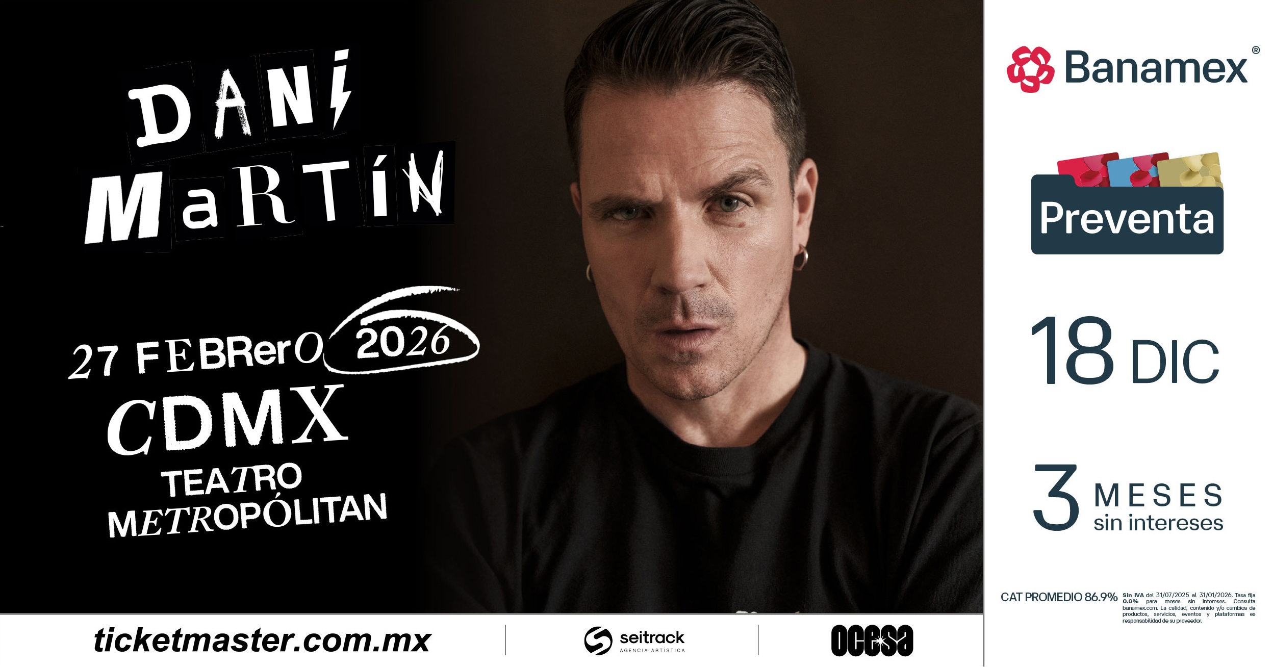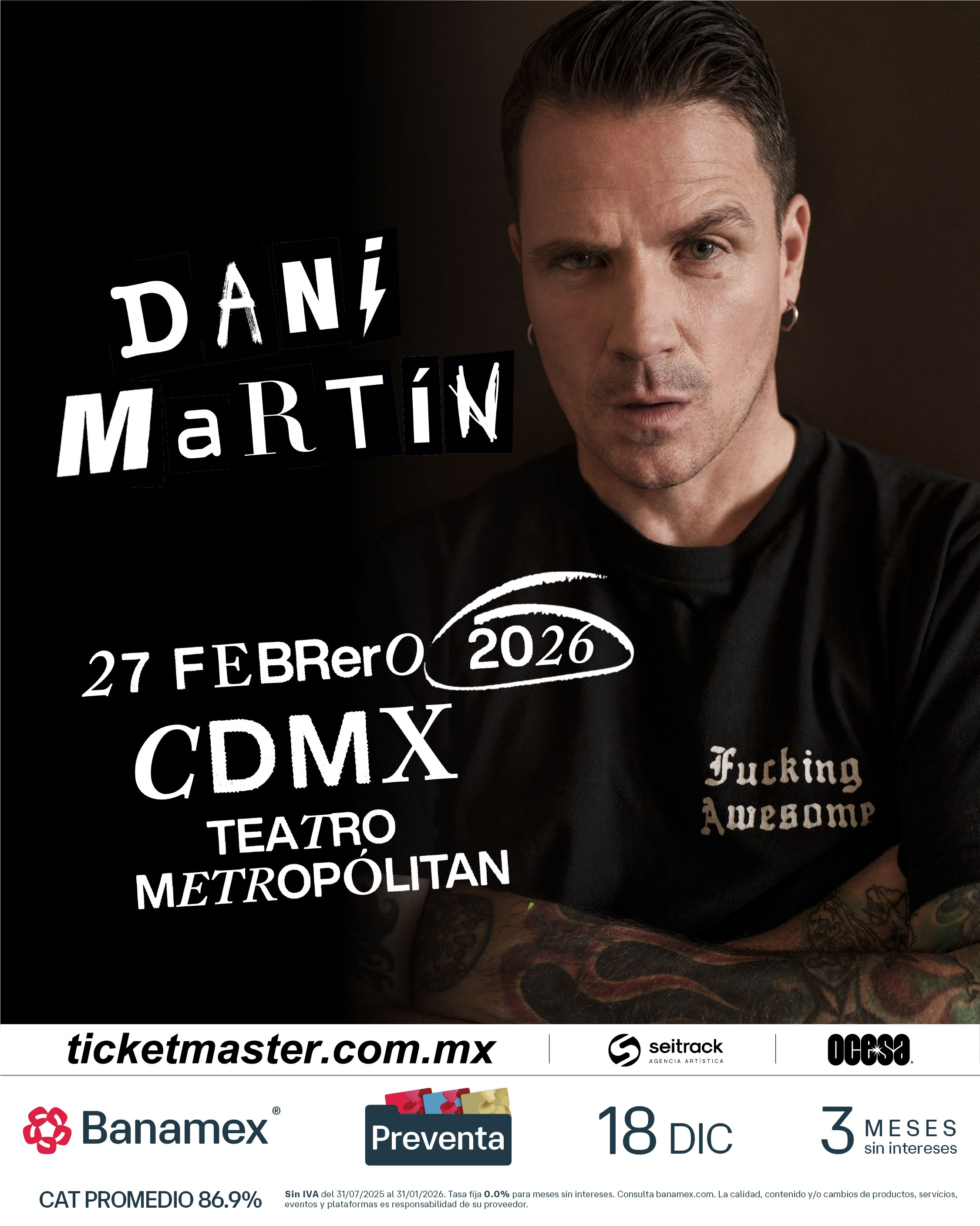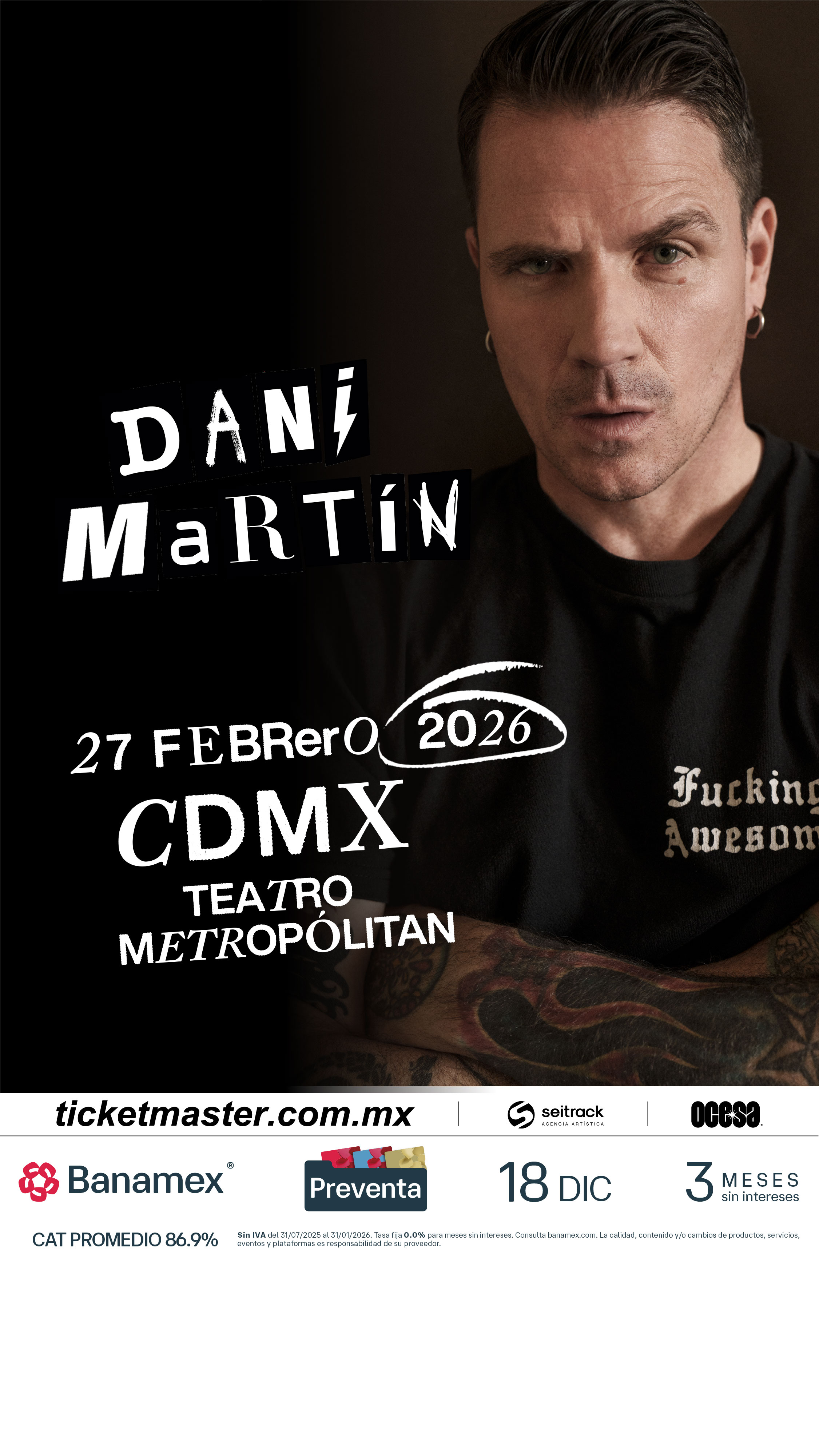 Dani Martín estará de regreso en México para ofrecer un concierto inolvidable en el Teatro Metropólitan este 27 de febrero. Este show apunta a reunir lo mejor de su carrera: sus grandes éxitos, sus lanzamientos más recientes y la fuerza de su legado para celebrar en grande los 25 años de trayectoria.