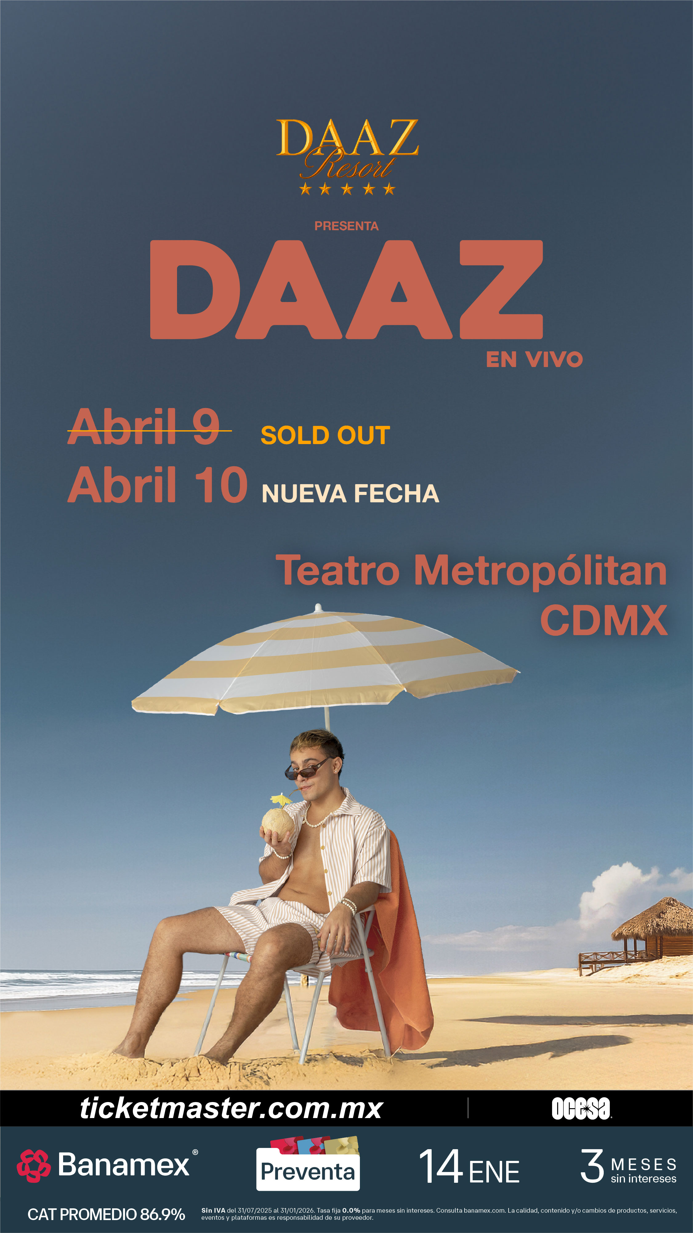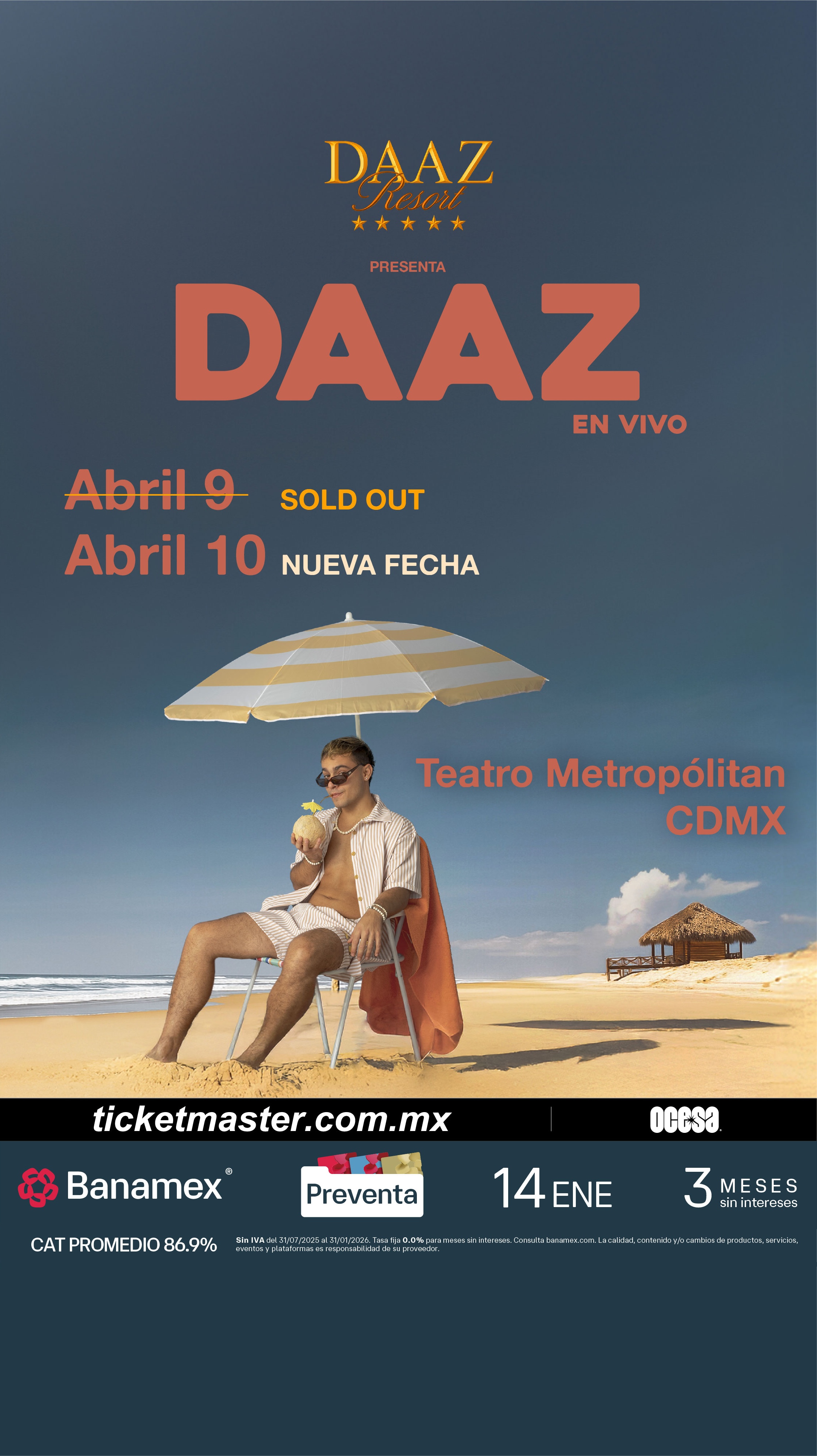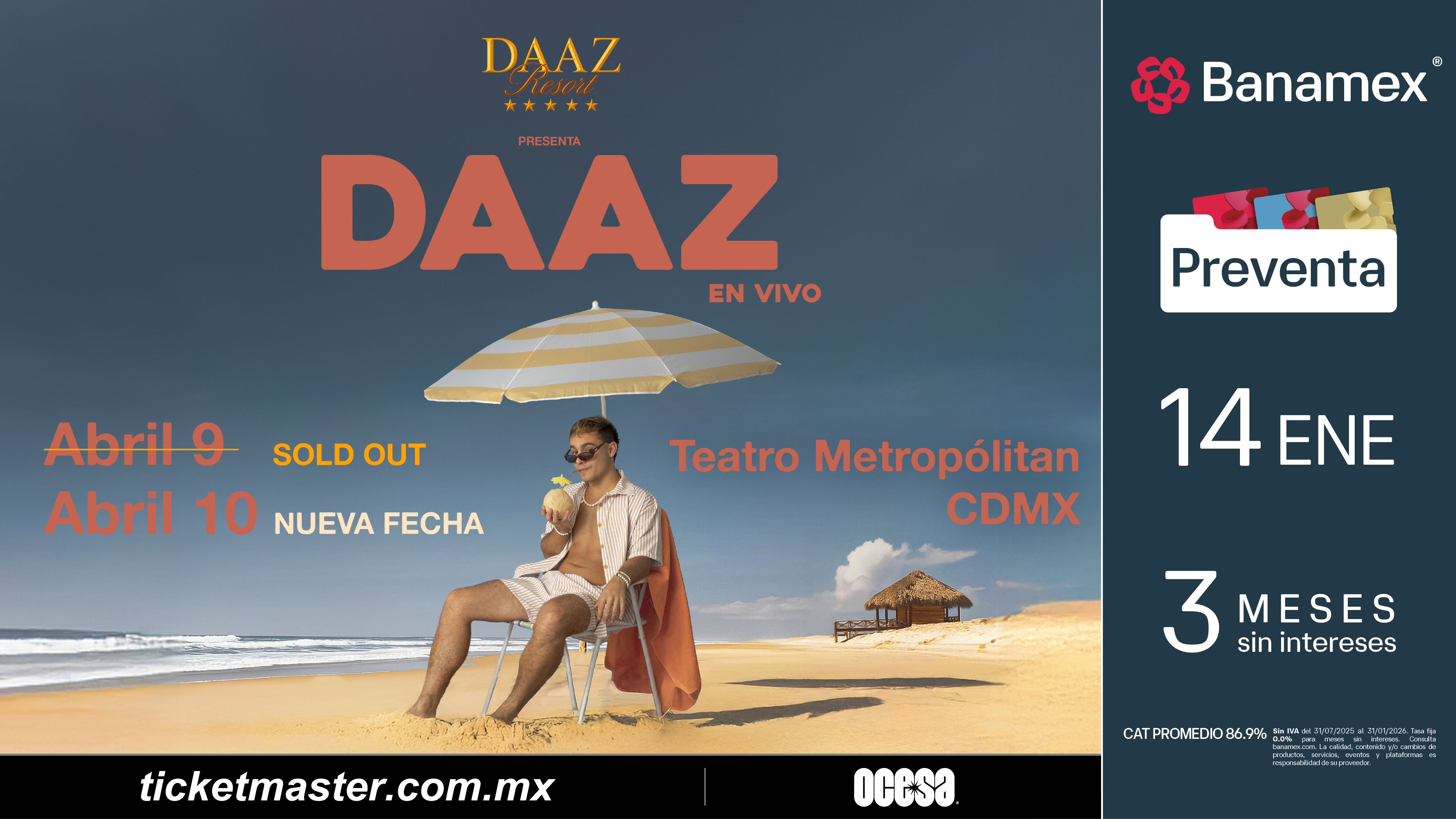 No te quedes fuera de esta segunda oportunidad para formar parte del DAAZ Resort y asegura tus boletos durante la Preventa Banamex el próximo 14 de enero o bien, en la venta general que se liberará un día después, el 15 de enero a través de Ticketmaster o en la taquilla del inmueble.