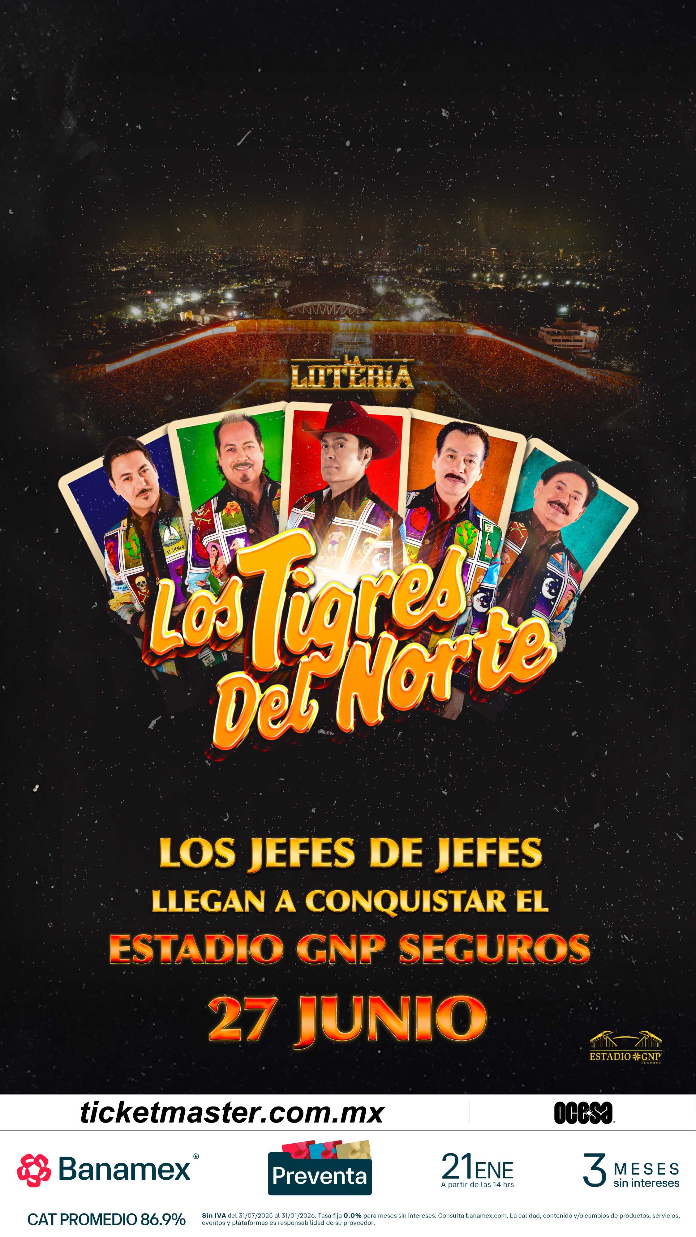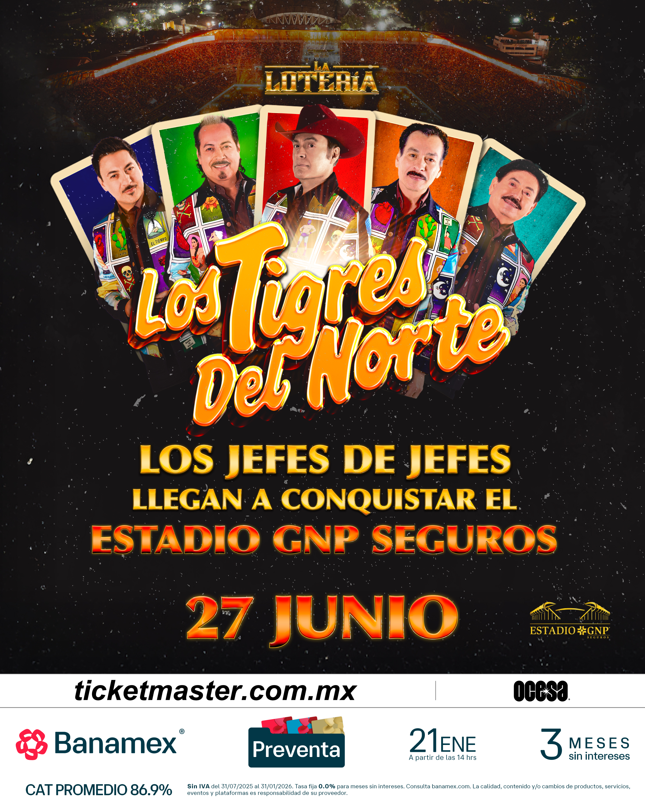 La cita para vivir la experiencia completa de Los Tigres del Norte y su gira "La Lotería" es el 27 de junio en el Estadio GNP Seguros. ¡Prepárate para cantar los himnos que han definido a nuestra cultura! Los boletos estarán en preventa Banamex el 21 de enero, y un día después los podrás adquirir en las taquillas del inmueble o a través de www.ticketmaster.com.mx.