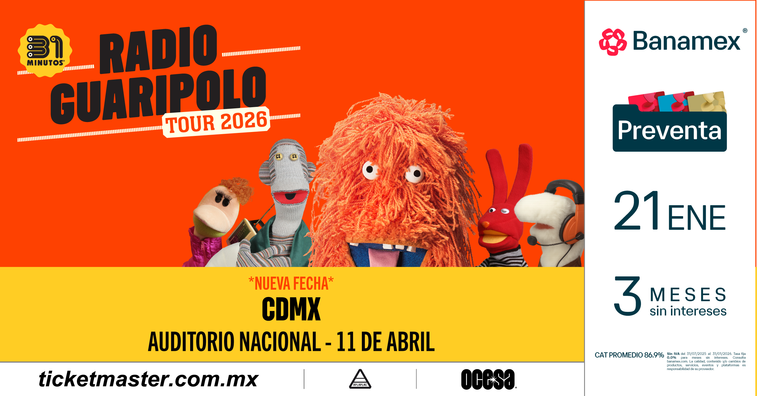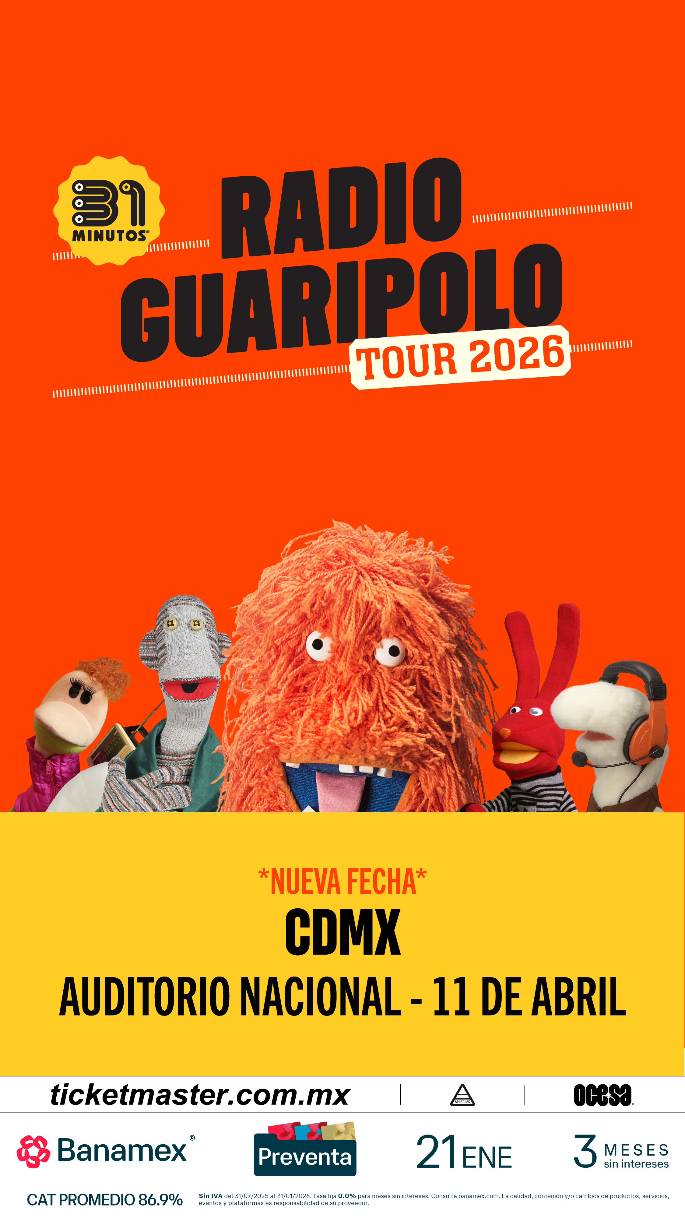 OCESAFact: La gira Radio Guaripolo II de 31 Minutos incluye seis funciones consecutivas completamente agotadas en el Teatro Metropólitan de la Ciudad de México. Un logro que reafirma cómo el proyecto ha evolucionado de ser un fenómeno televisivo a convertirse en un referente cultural en toda la región, prueba de esto, es su aclamada presentación del grupo en Tiny Desk, donde acumulan 14 millones de reproducciones desde su lanzamiento el pasado 6 de octubre.