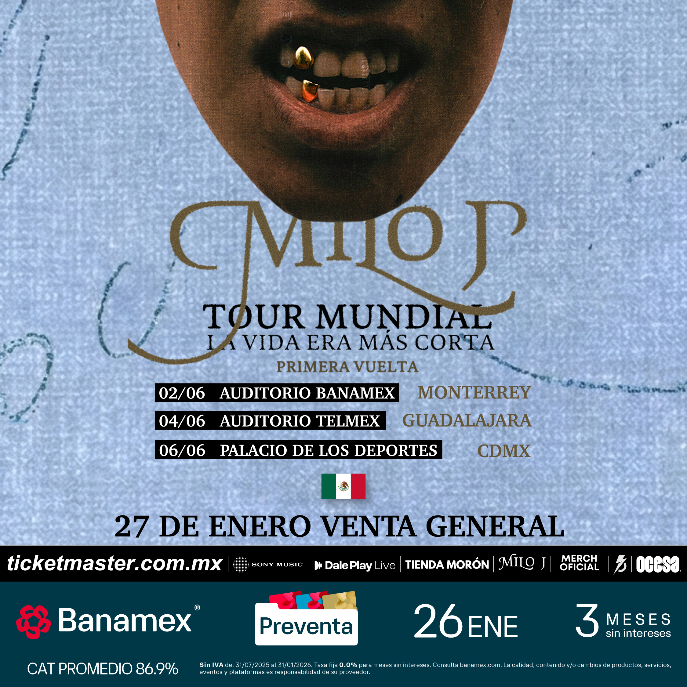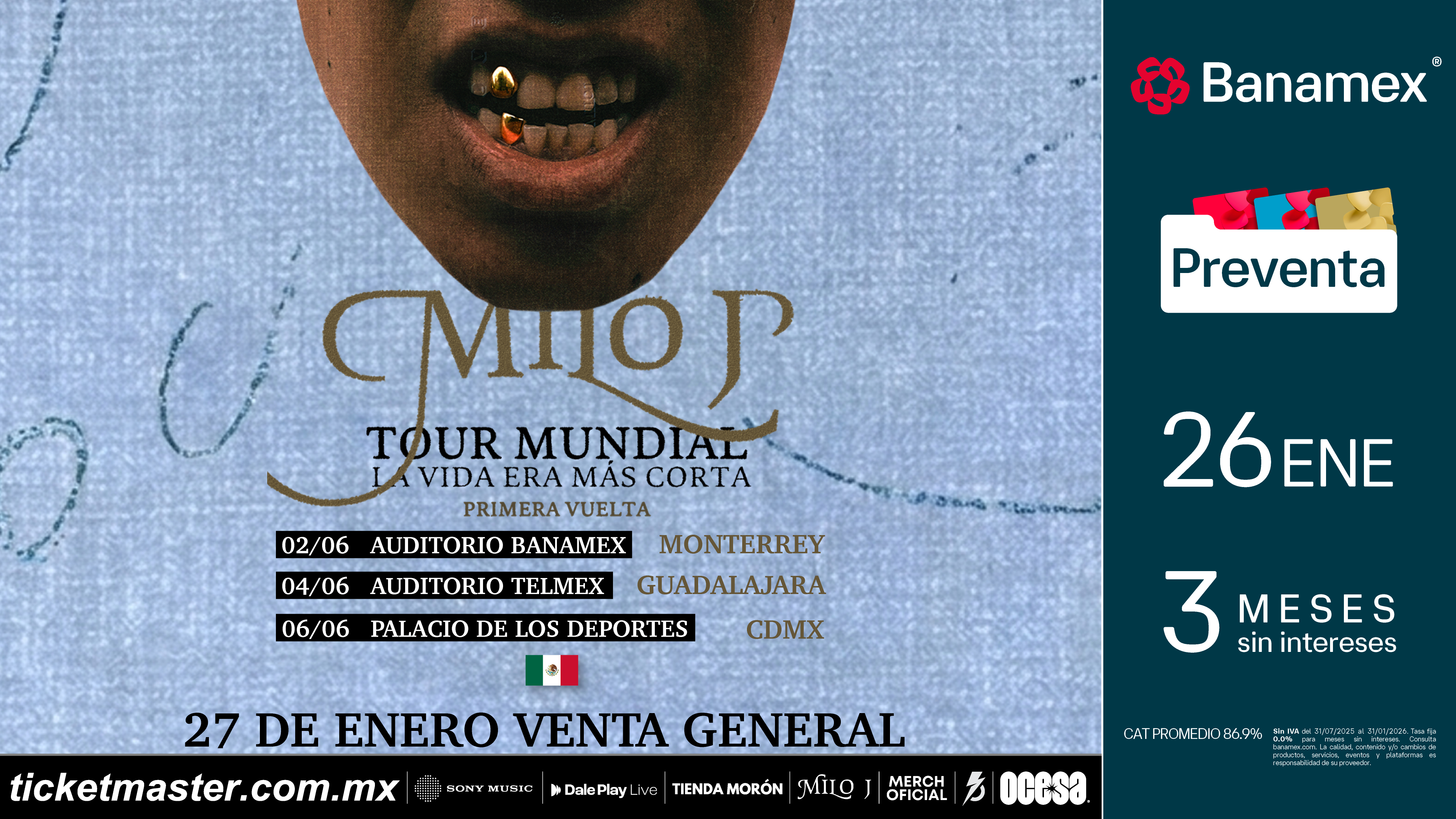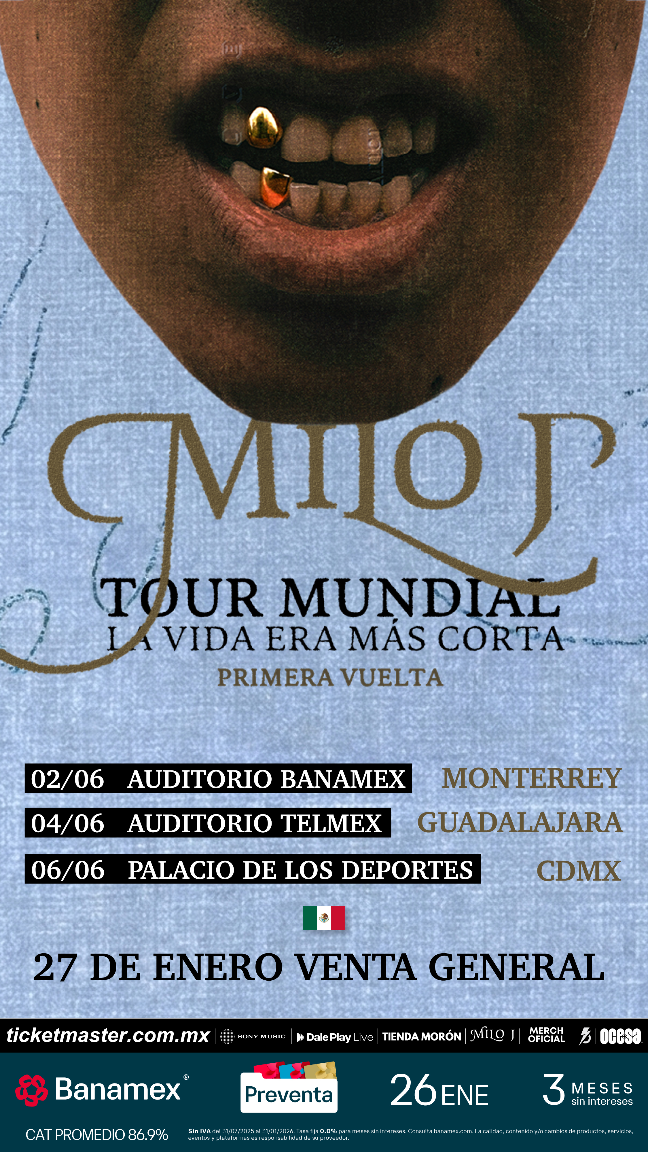 Con más de 16 millones de oyentes mensuales, Milo J se posiciona como una de las voces más relevantes del panorama musical actual, con una propuesta que combina innovación, memoria cultural y una mirada propia sobre el presente de la música latinoamericana. Su paso por México promete ser una celebración de ese recorrido, en un show que cruza generaciones, géneros y emociones. Asegura tus boletos durante la Preventa Banamex el próximo 26 de enero o bien en la venta general el 27 de enero.
