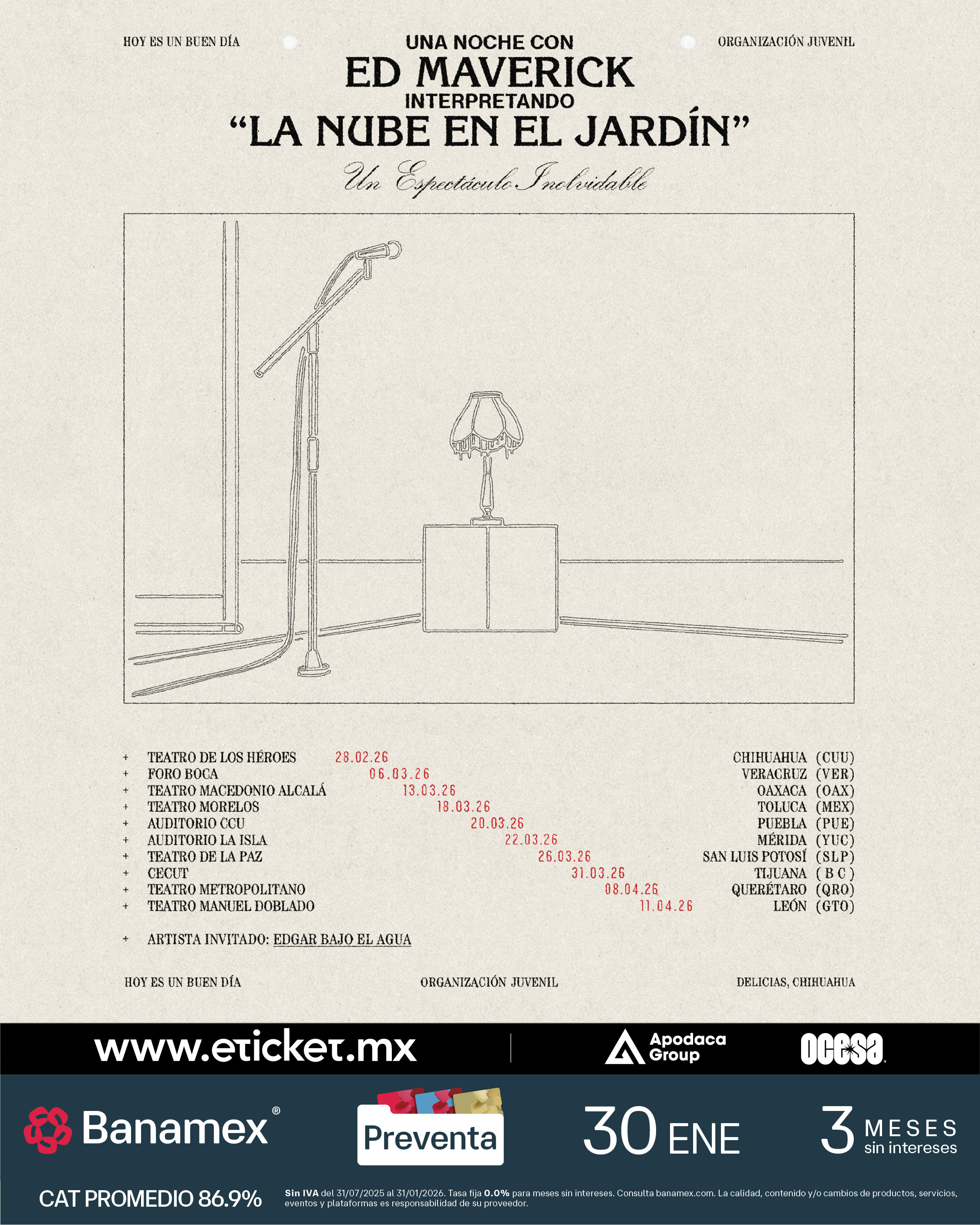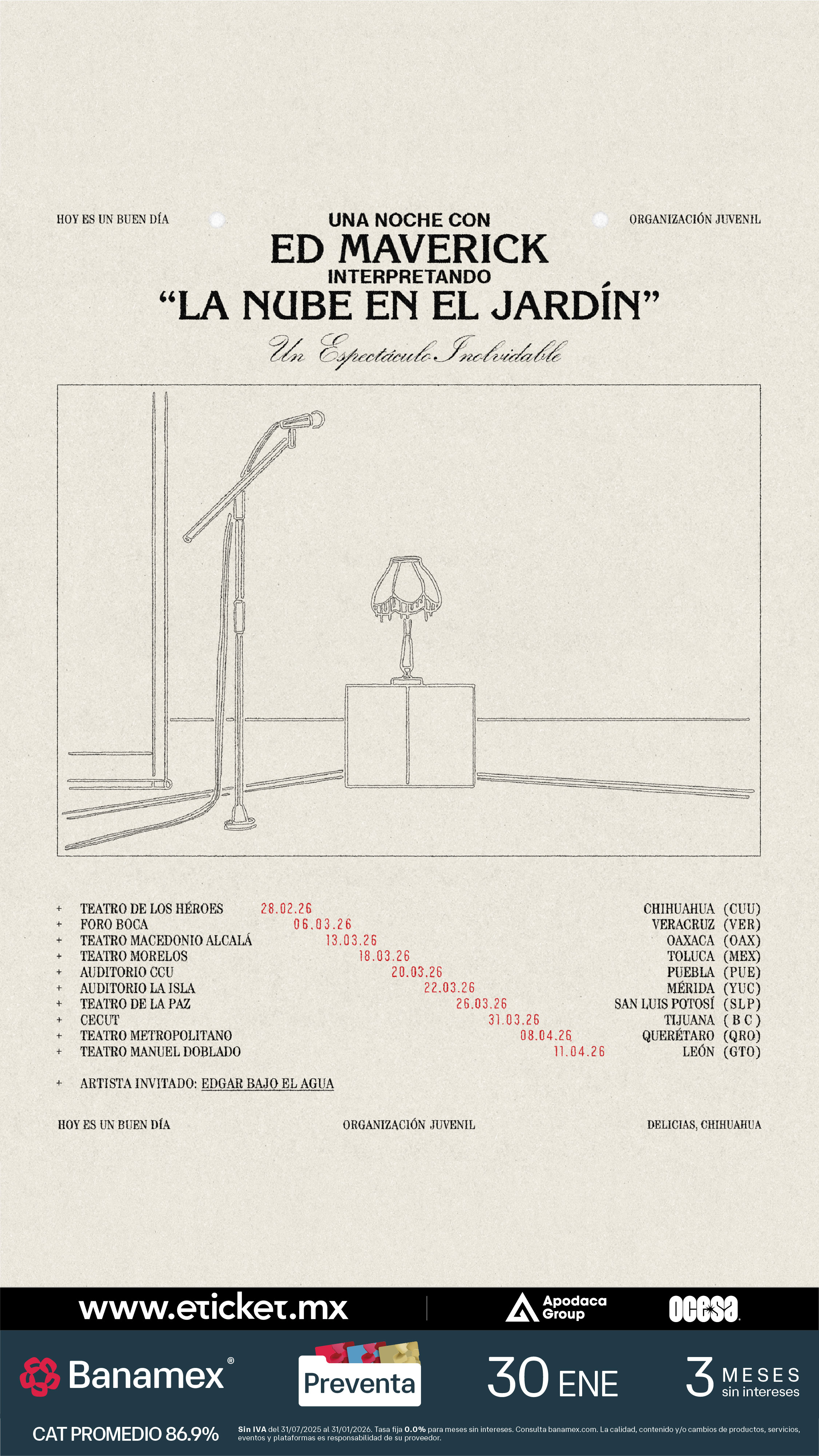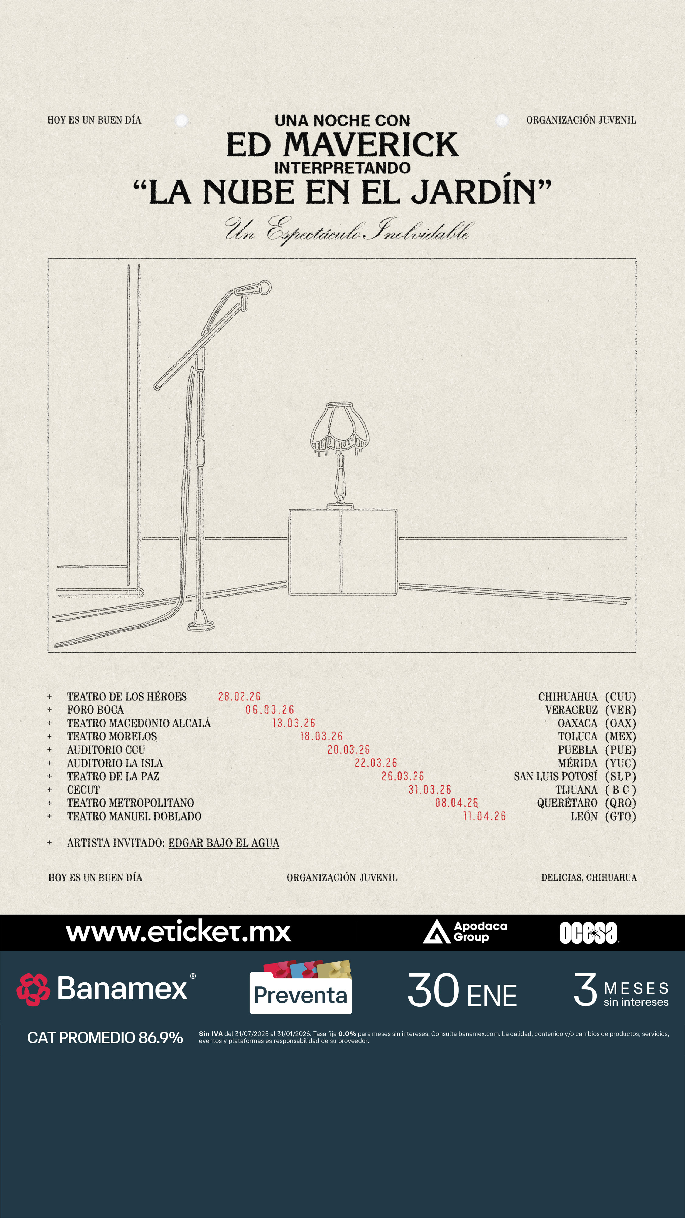 Ciudad de México, México.- El aclamado cantautor mexicano Ed Maverick se complace en anunciar la reanudación de la gira promocional de su álbum de estudio más reciente, La Nube en el Jardín.