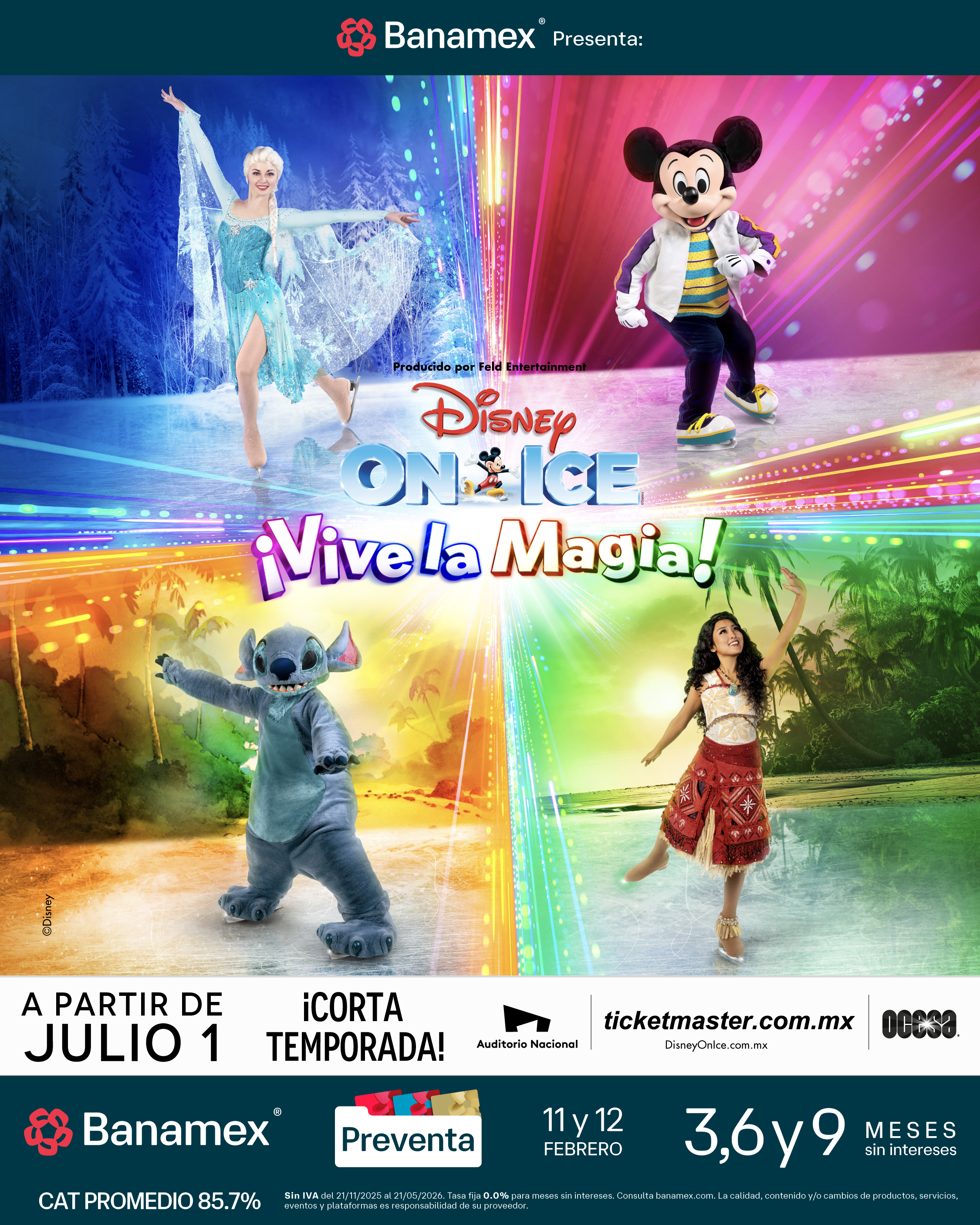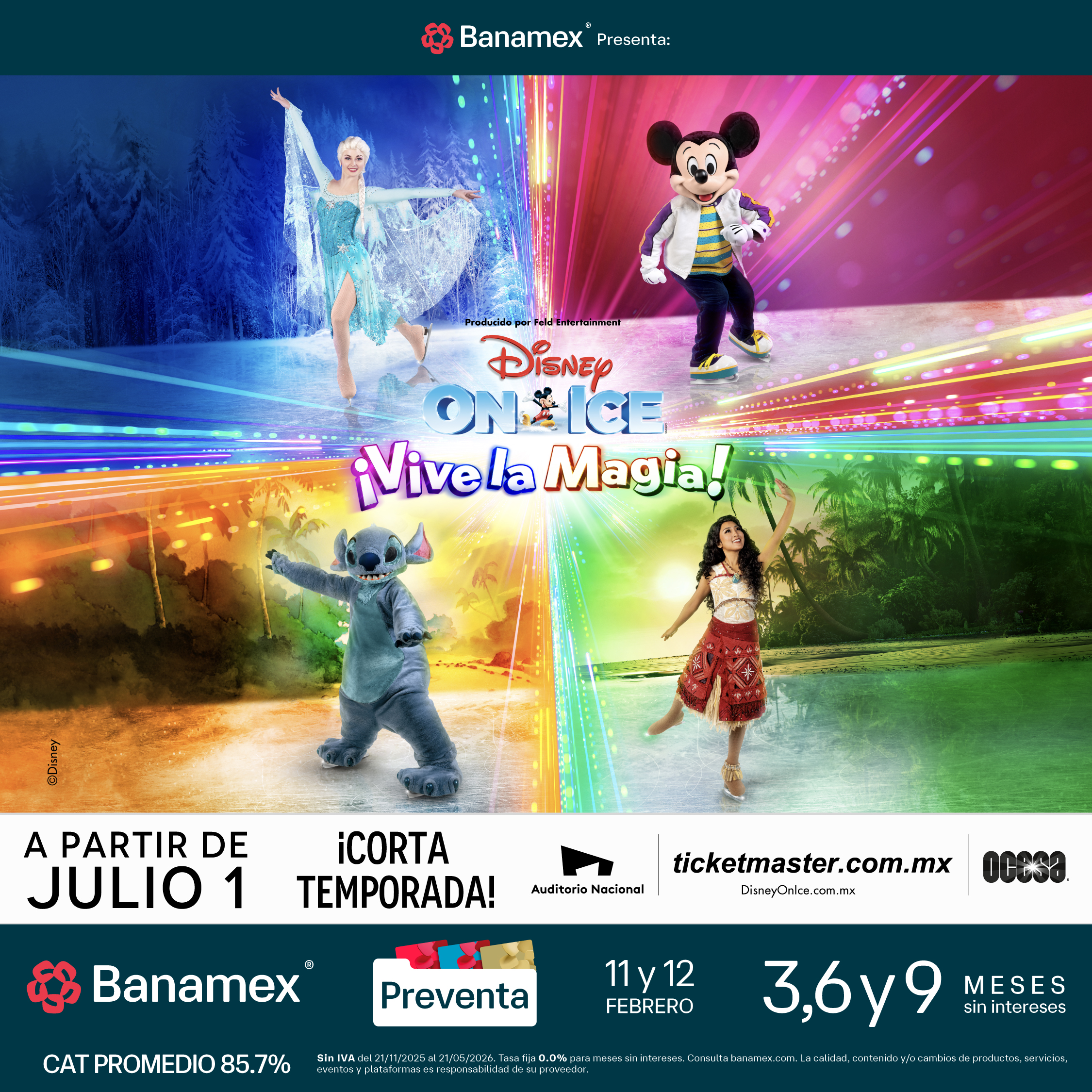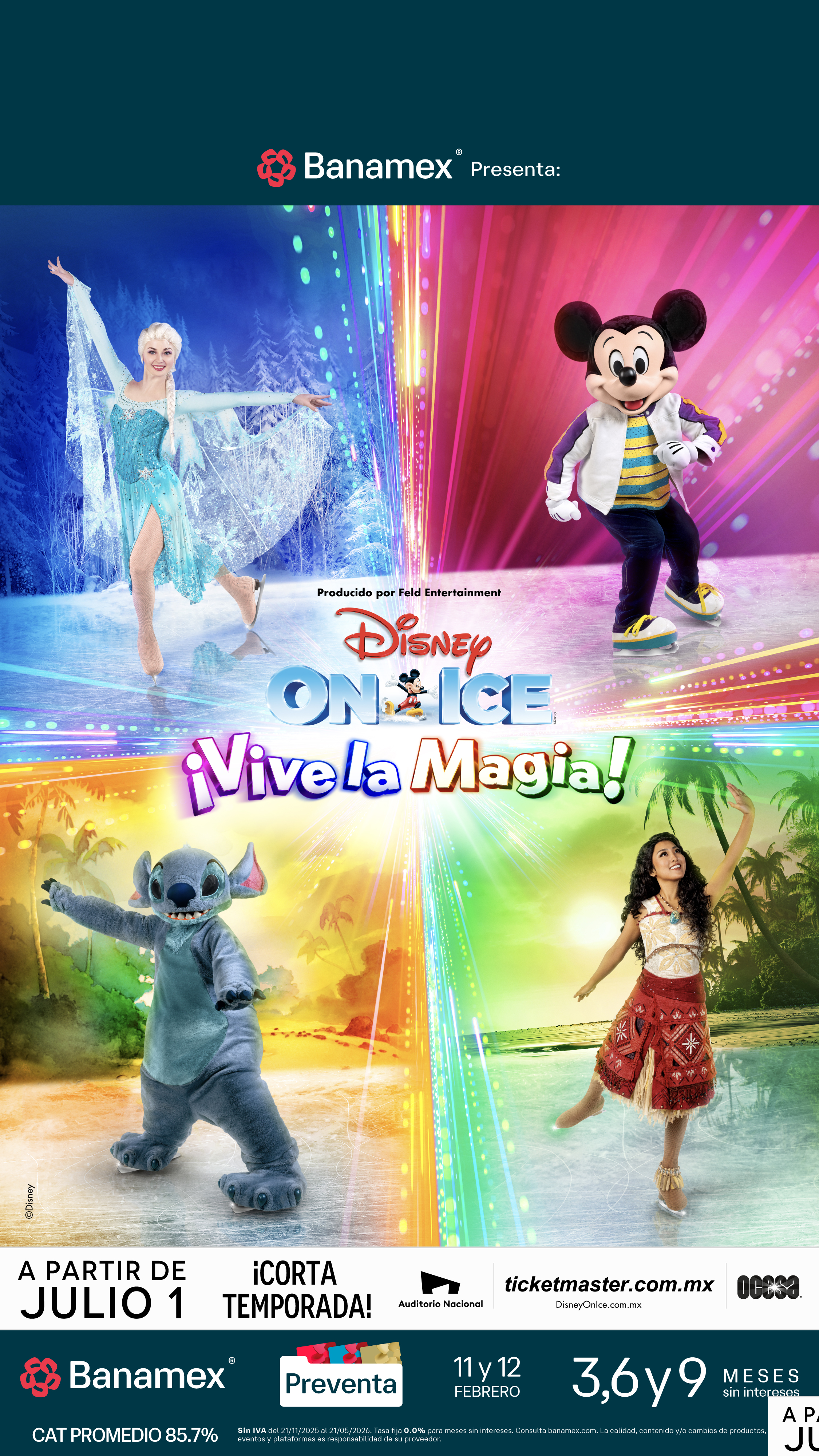(Ciudad de México, 9 de febrero) – Disney On Ice trae al Auditorio Nacional una mágica aventura con su nuevo espectáculo Disney On Ice presenta ¡Vive la magia! del 1 al 26 de julio. La aventura inicia con un toque del MousePad mágico, que llevará a toda la familia en un viaje inolvidable por los cuentos de Disney, con más de 50 personajes. Disney On Ice presenta patinaje artístico de clase mundial, acrobacias aéreas, asombrosos efectos especiales, atractivos momentos interactivos y música encantadora, que dejará a la audiencia asombrada y creará nuevos recuerdos que acompañarán a sus invitados mucho después de que el espectáculo termine.