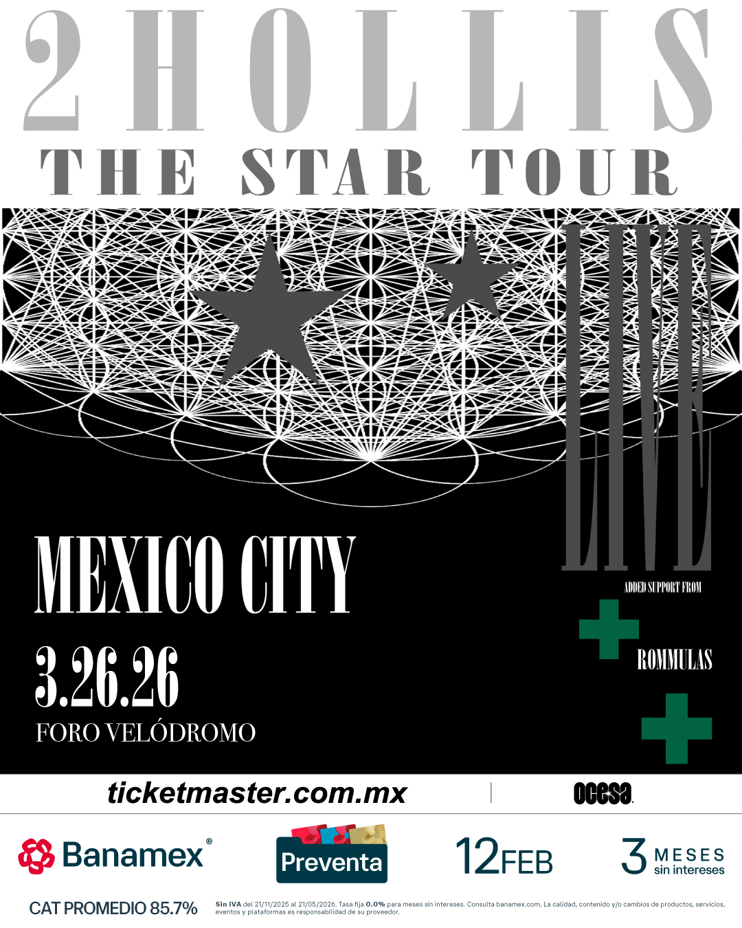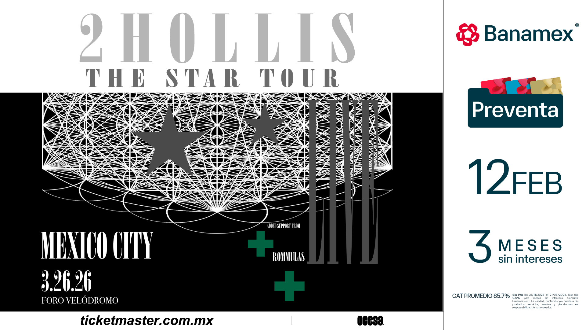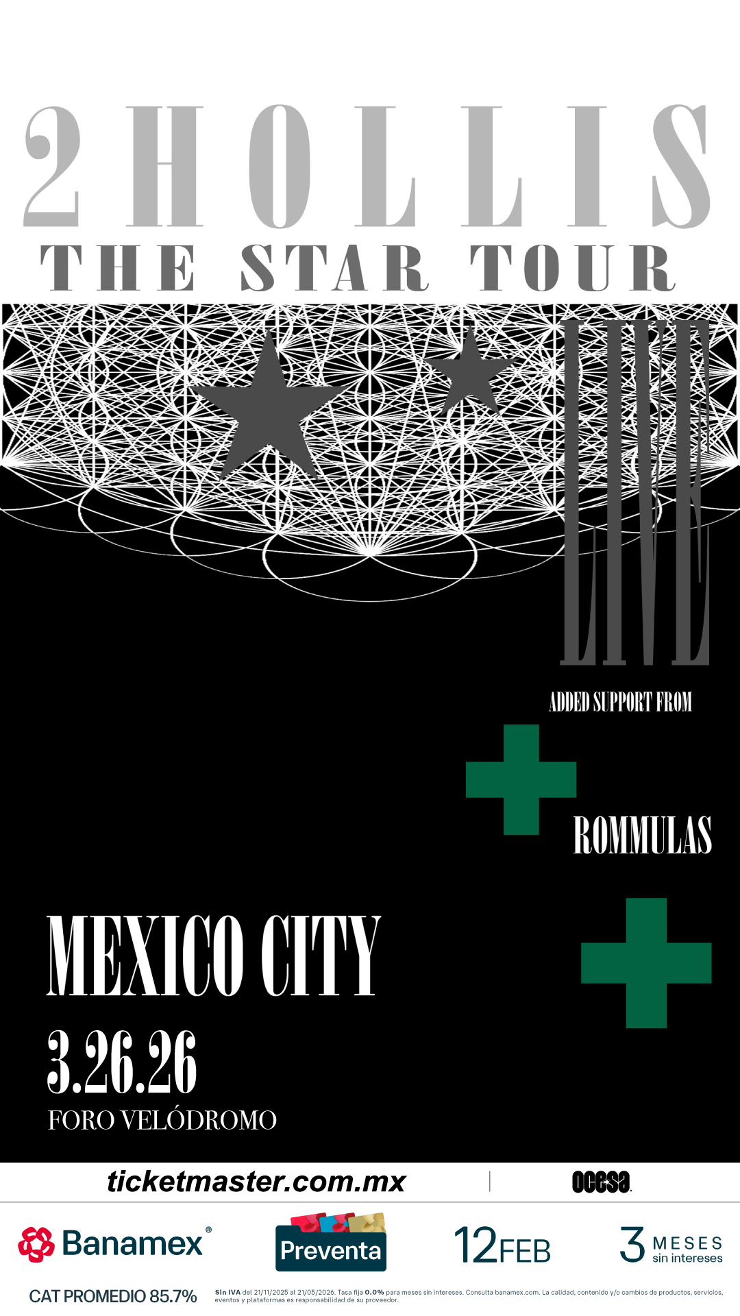 ¡No te quedes fuera de la experiencia 2hollis! Adquiere tus boletos en la preventa Banamex este 12 de febrero y un día después los podrás adquirir a través de www.ticketmaster.com.mx.