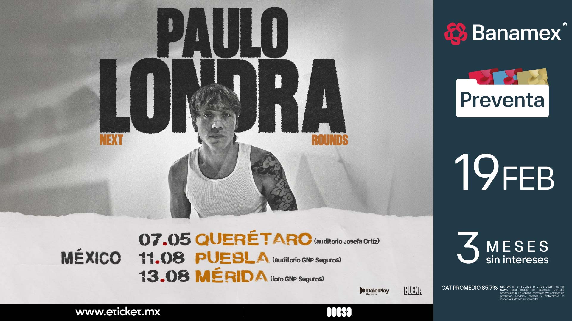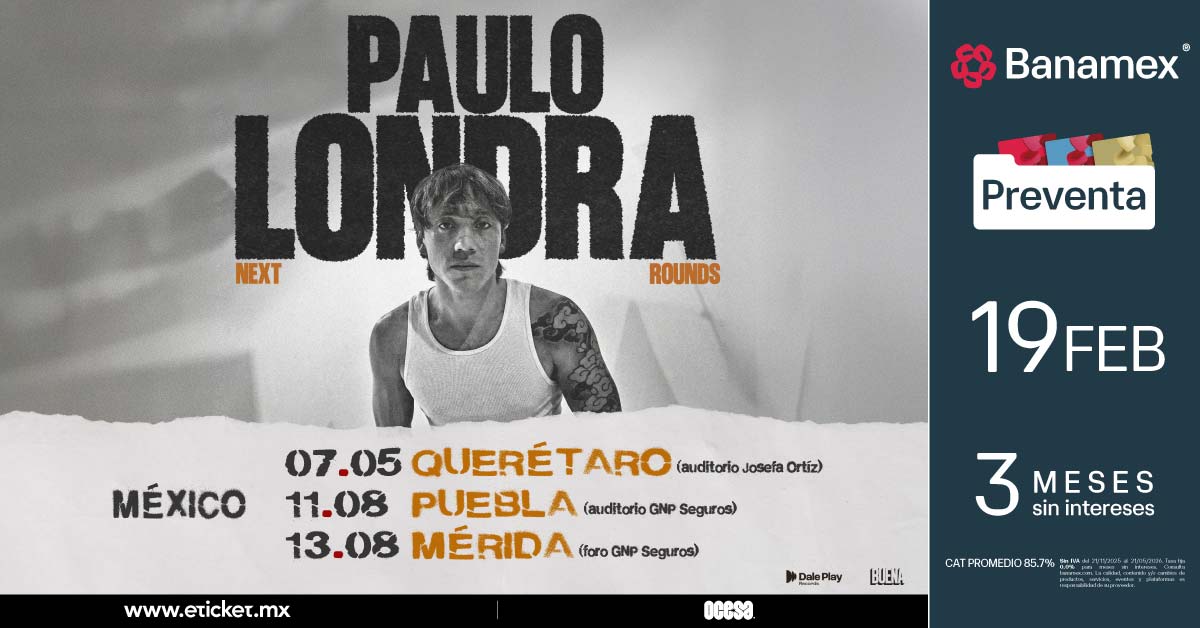 Paulo Londra ha triunfado en sus visitas a México y en esta ocasión, va a rugir en estados donde no se ha presentado anteriormente. Forma parte de los “leones con flow” que acompañarán a Paulo Londra en esta serie de conciertos. Adquiere tus boletos en la Preventa Banamex el 19 de febrero a través de E-Ticket, y la Venta General estará disponible un día después.