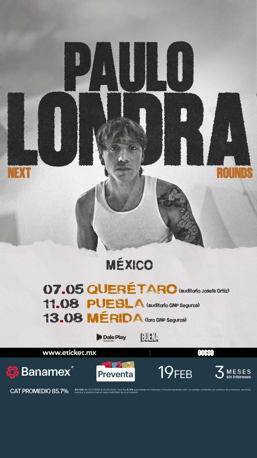 Con éxitos que han marcado una generación como “Nena Maldición”, “Adán y Eva”, “Por Eso Vine” y “Cuando Te Besé”, Paulo Londra promete noches llenas de emoción, energía y una puesta en escena al nivel de su esperado regreso en México. Además, en su repertorio escucharemos los últimos lanzamientos del artista como “1%” con Eladio Carrión, “NANAENA”, “Mujer Maravilla”, “Flashbacks CROSSOVER #9” con Big One y Wisin y “Ramen Para Dos”, que han reafirmado su posición como uno de los artistas más influyentes de Argentina.