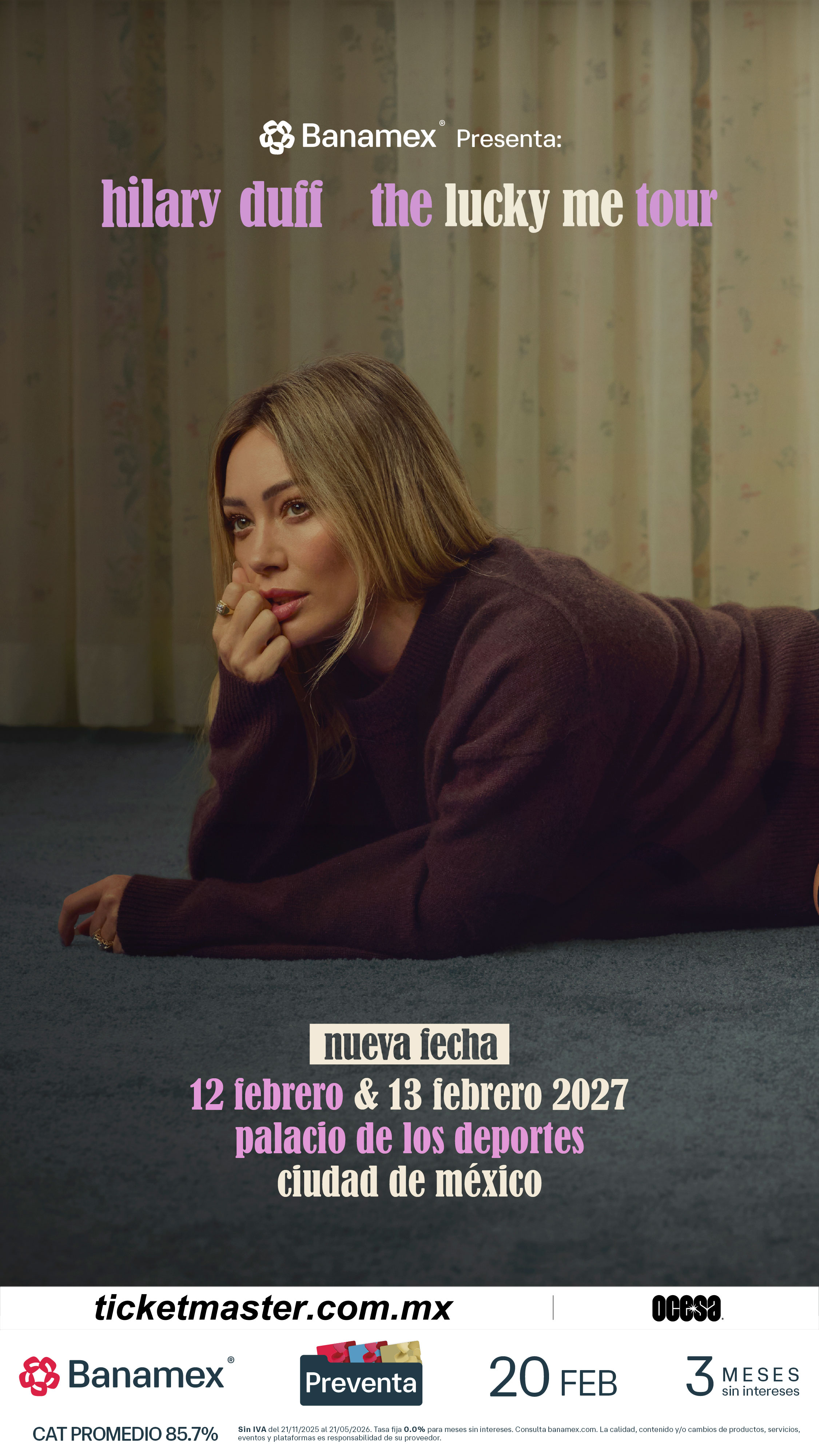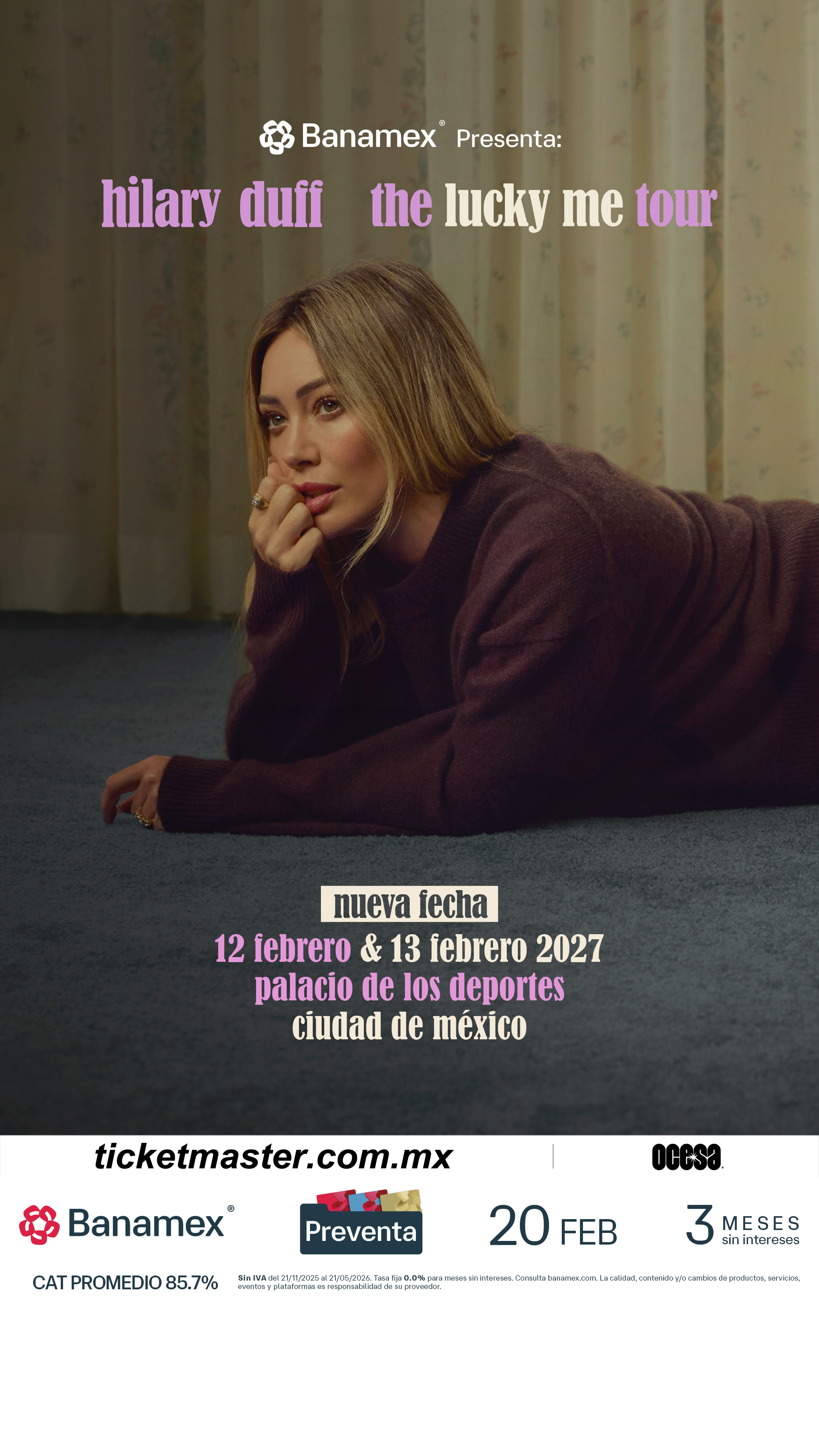 Debido a la increíble demanda de los fans, la superestrella global multiplatino Hilary Duff ha agregado segundos shows en cuatro ciudades en lucky me tour, su primera gira global como cabeza de cartel a gran escala en casi dos décadas. Los nuevos shows incluyen múltiples noches en Los Ángeles, Nueva York, Toronto y Londres en su recorrido 2026-2027. Las ventas generales en EE. UU., Canadá, Irlanda y el Reino Unido comienzan el viernes 20 de febrero a las 10 am (hora local), en México a las 11 am (hora local) y en Australia/Nueva Zelanda a la 1 pm (hora local). Para detalles completos e información de boletos, visita www.hilaryduff.com/live.