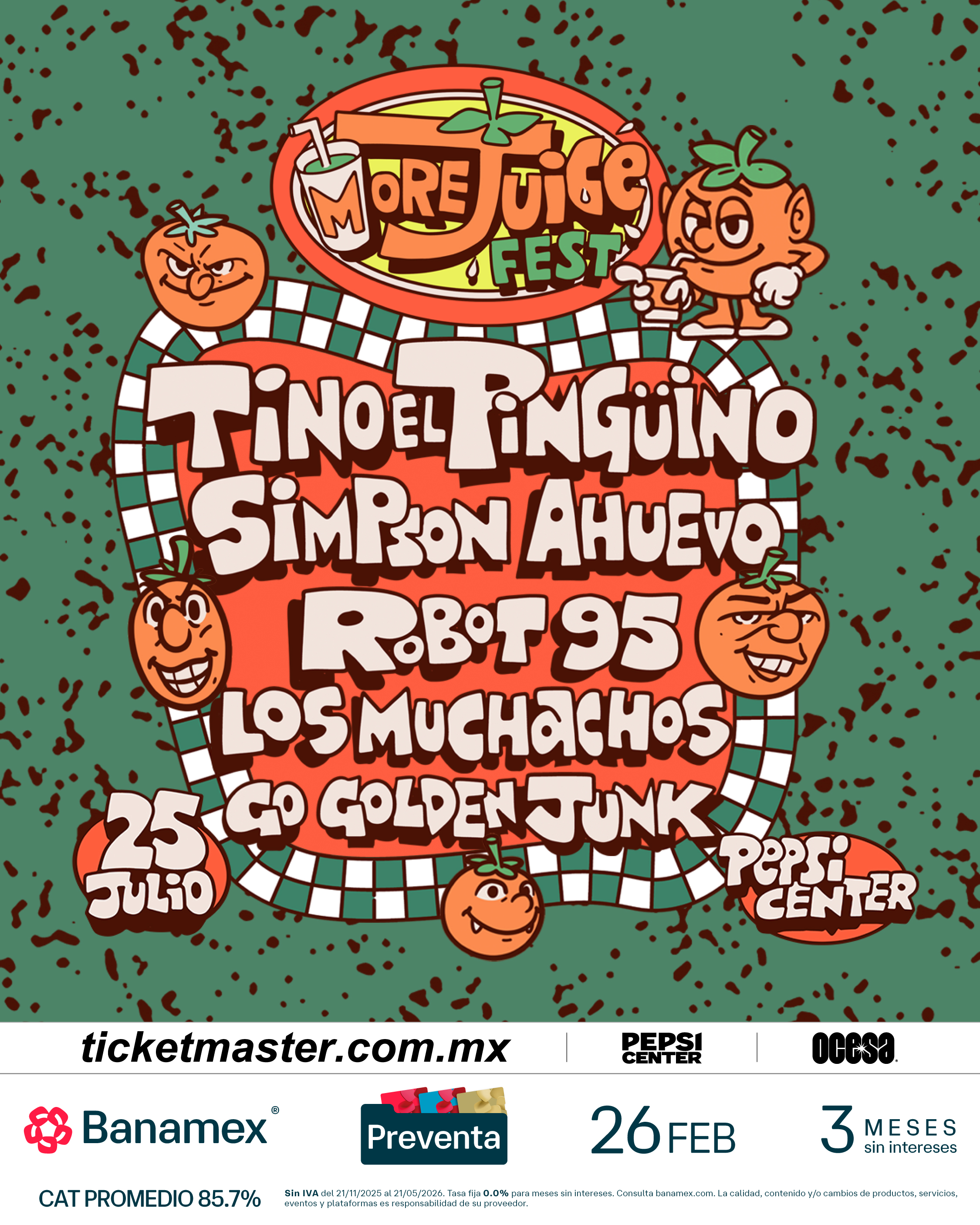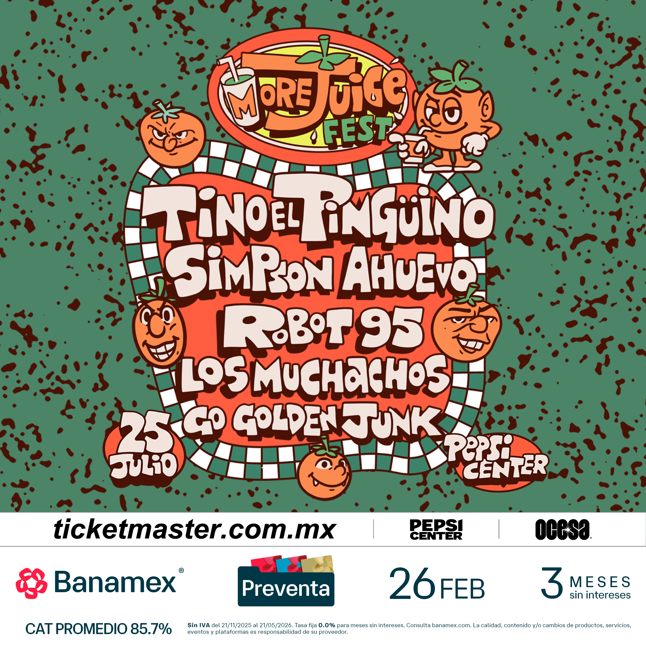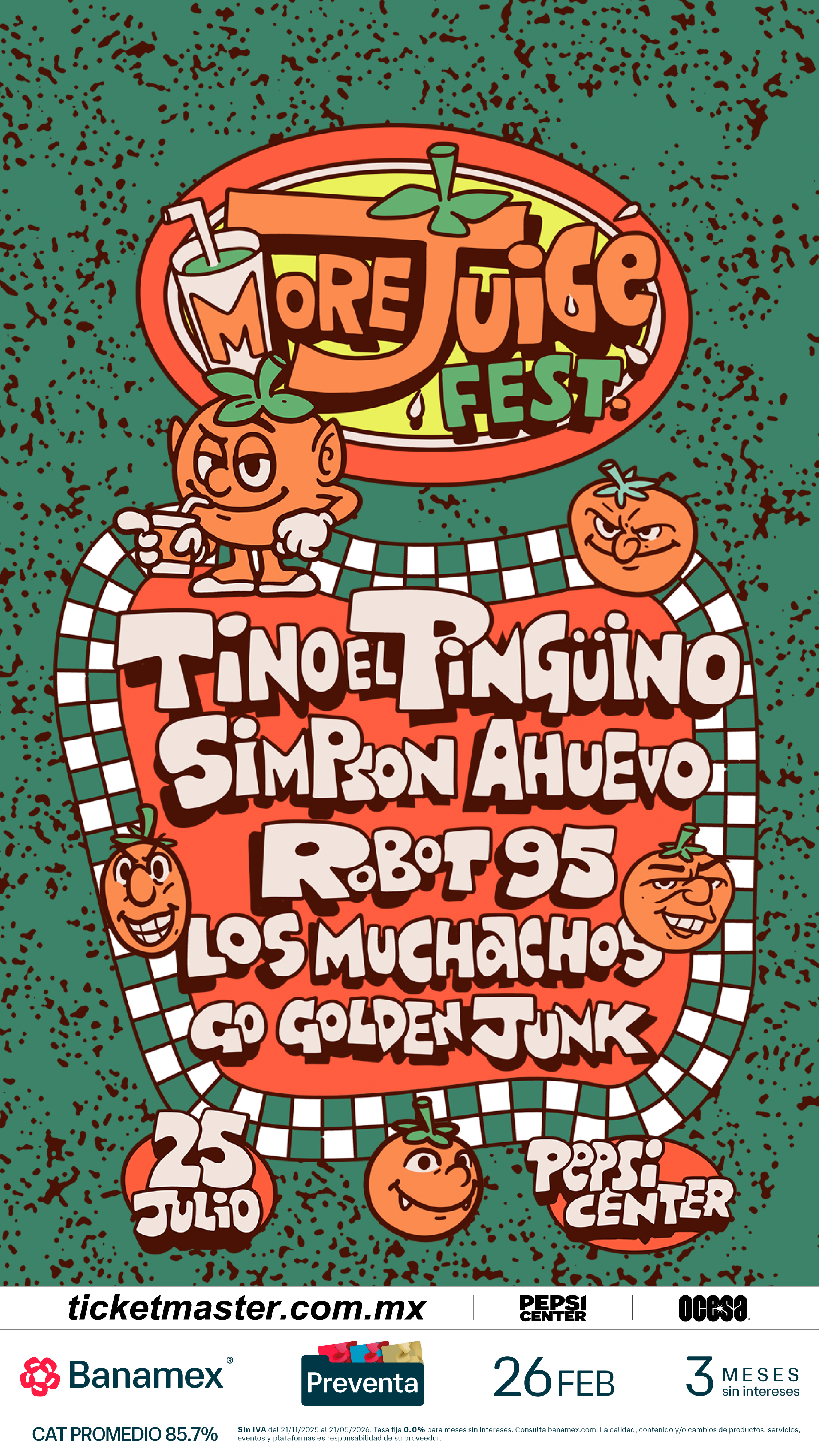 Sé parte de MoreJuice Fest y conviértete en testigo del presente y del futuro de la música. Asegura tus boletos durante la Preventa Banamex el 26 de febrero o bien, en la venta general que se liberará un día después, el 27 de febrero a través de Ticketmaster o en la taquilla del inmueble.