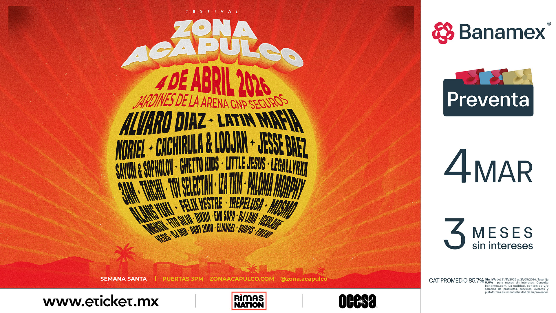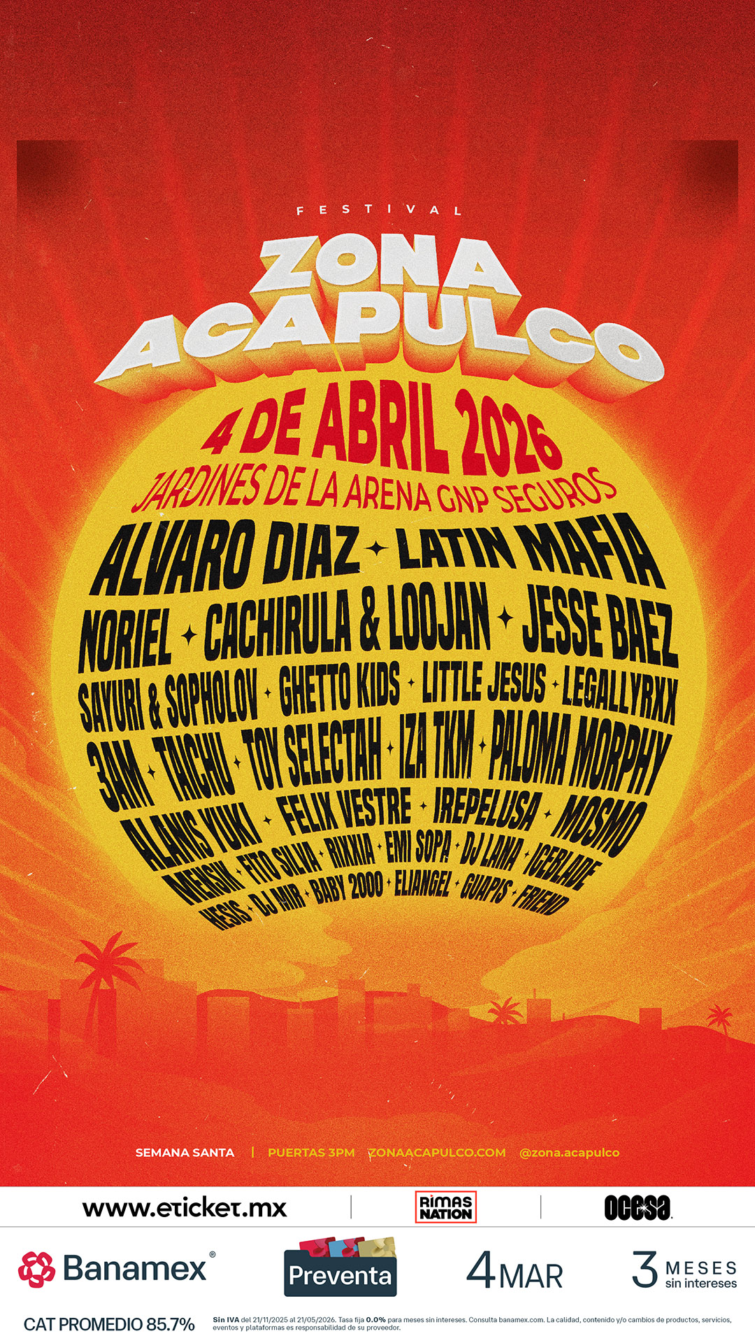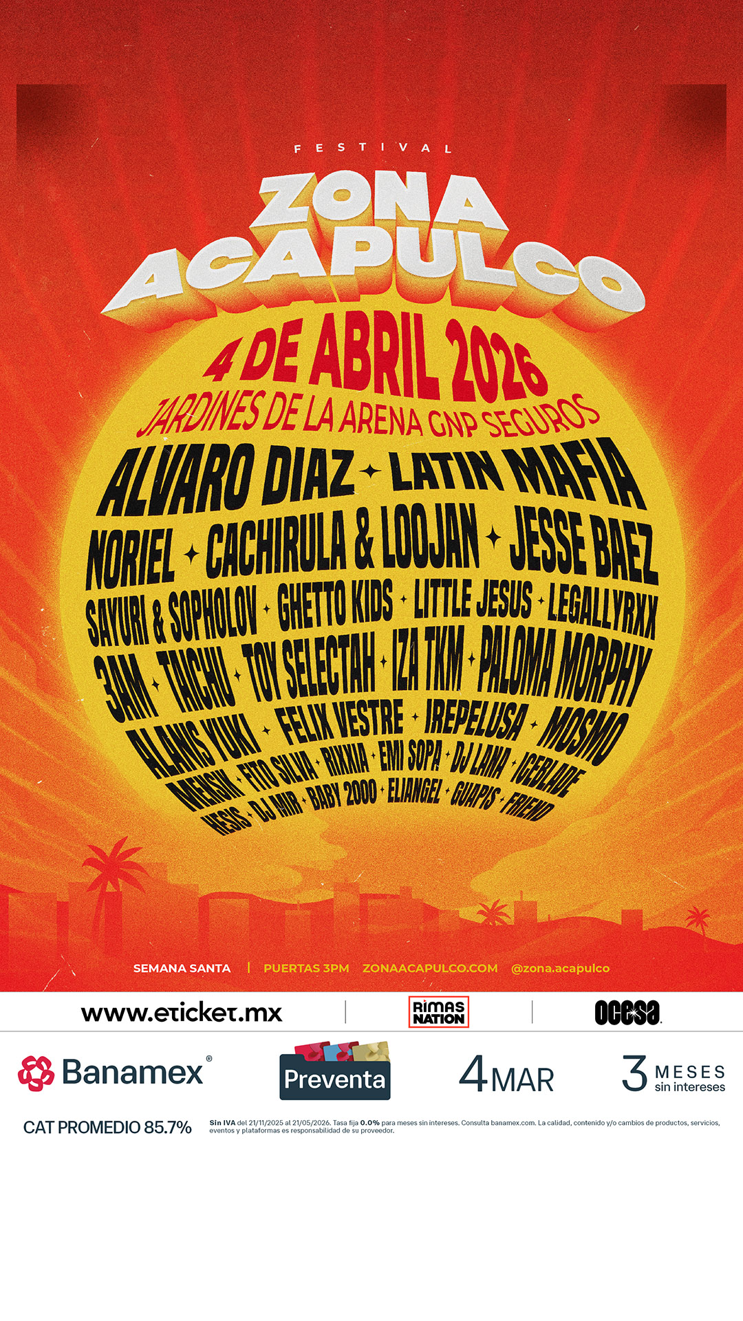 MÁS QUE UN EVENTO, UNA COMUNIDAD: ZONA ACAPULCO es la cita donde el entorno paradisíaco se encuentra con los sonidos que lideran los charts globales. Es el momento de recuperar nuestro lugar, de bailar bajo las palmeras y de demostrar que la nueva era de Acapulco es hoy.