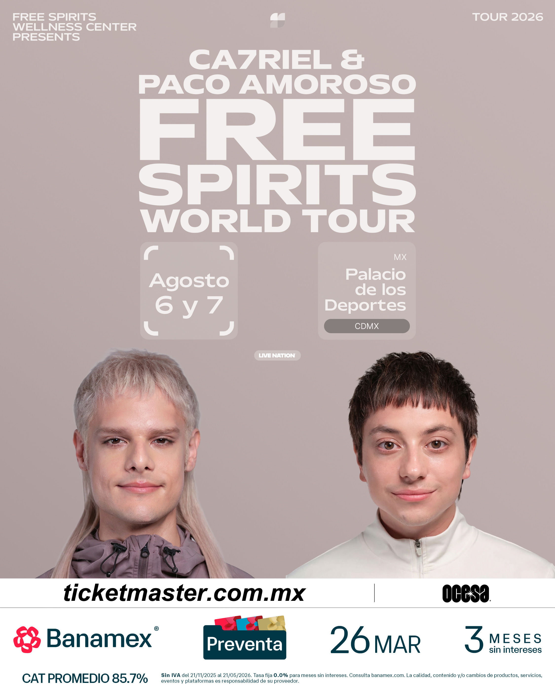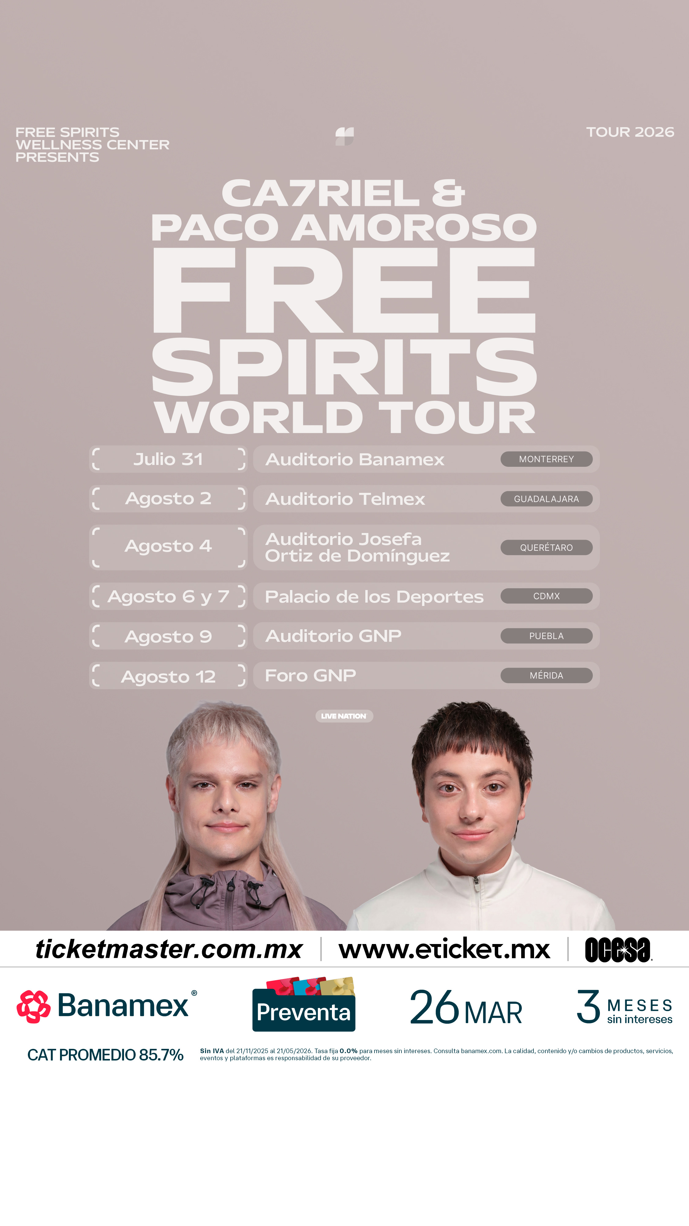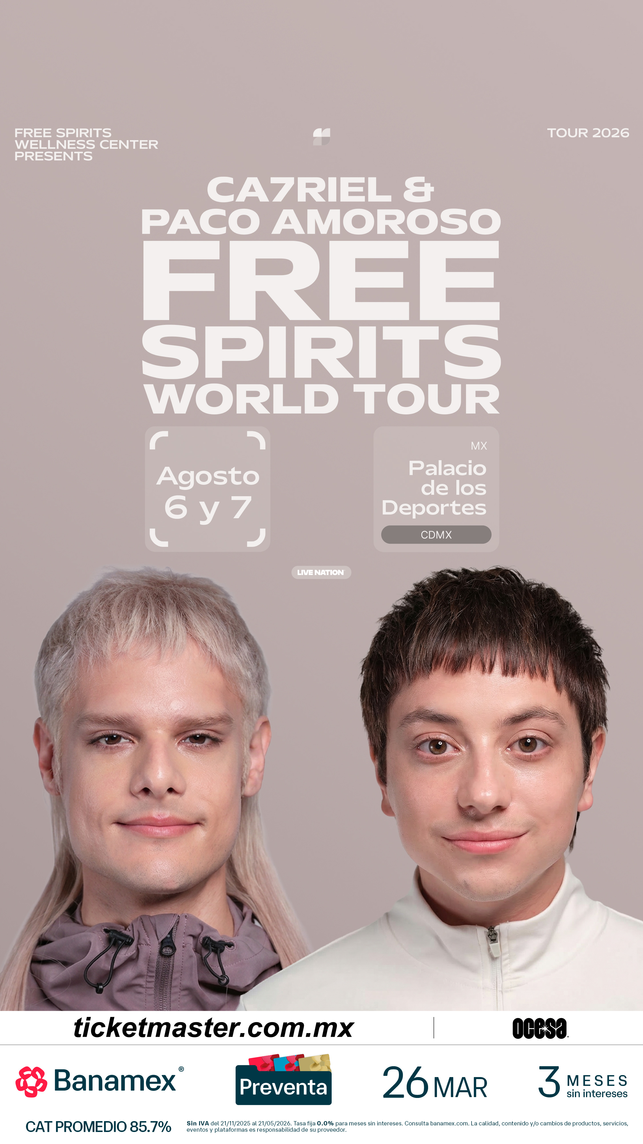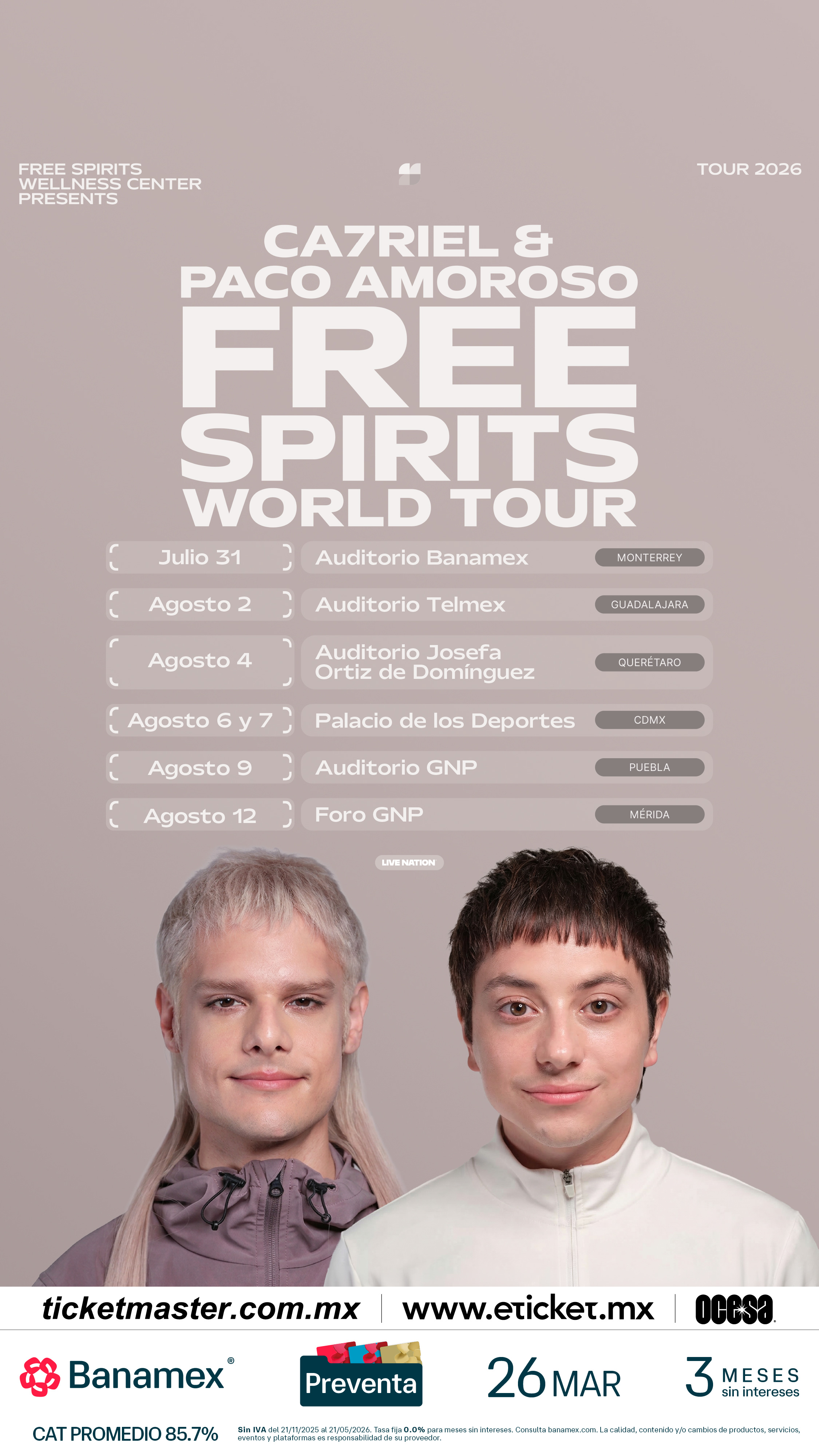 CA7RIEL & Paco Amoroso continuarán el impulso del destacado PAPOTA Tour del año pasado, embarcándose en su gira global 2026 para celebrar el lanzamiento de FREE SPIRITS. La gira comienza el 14 de mayo con un concierto especial en casa, en el Movistar Arena de Buenos Aires.
