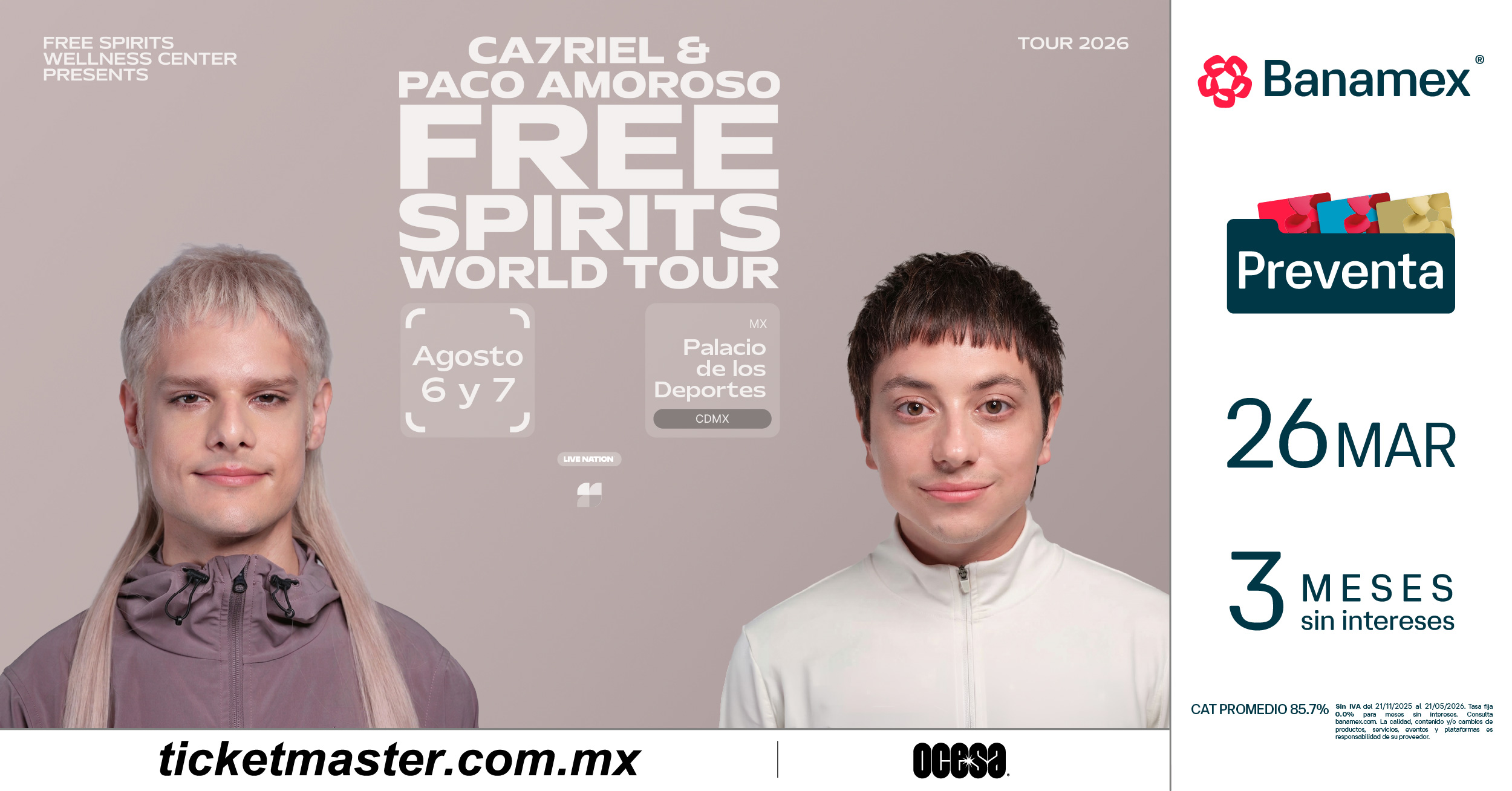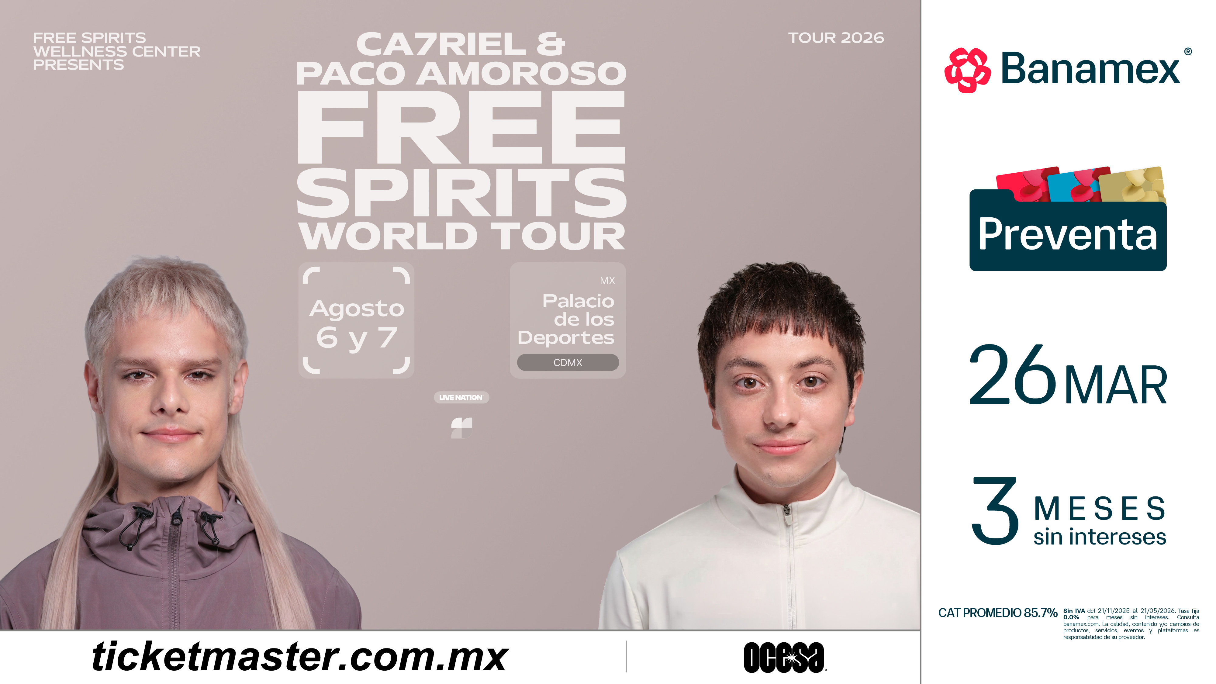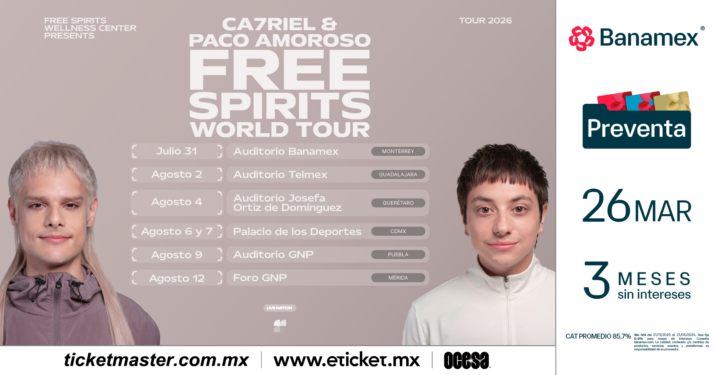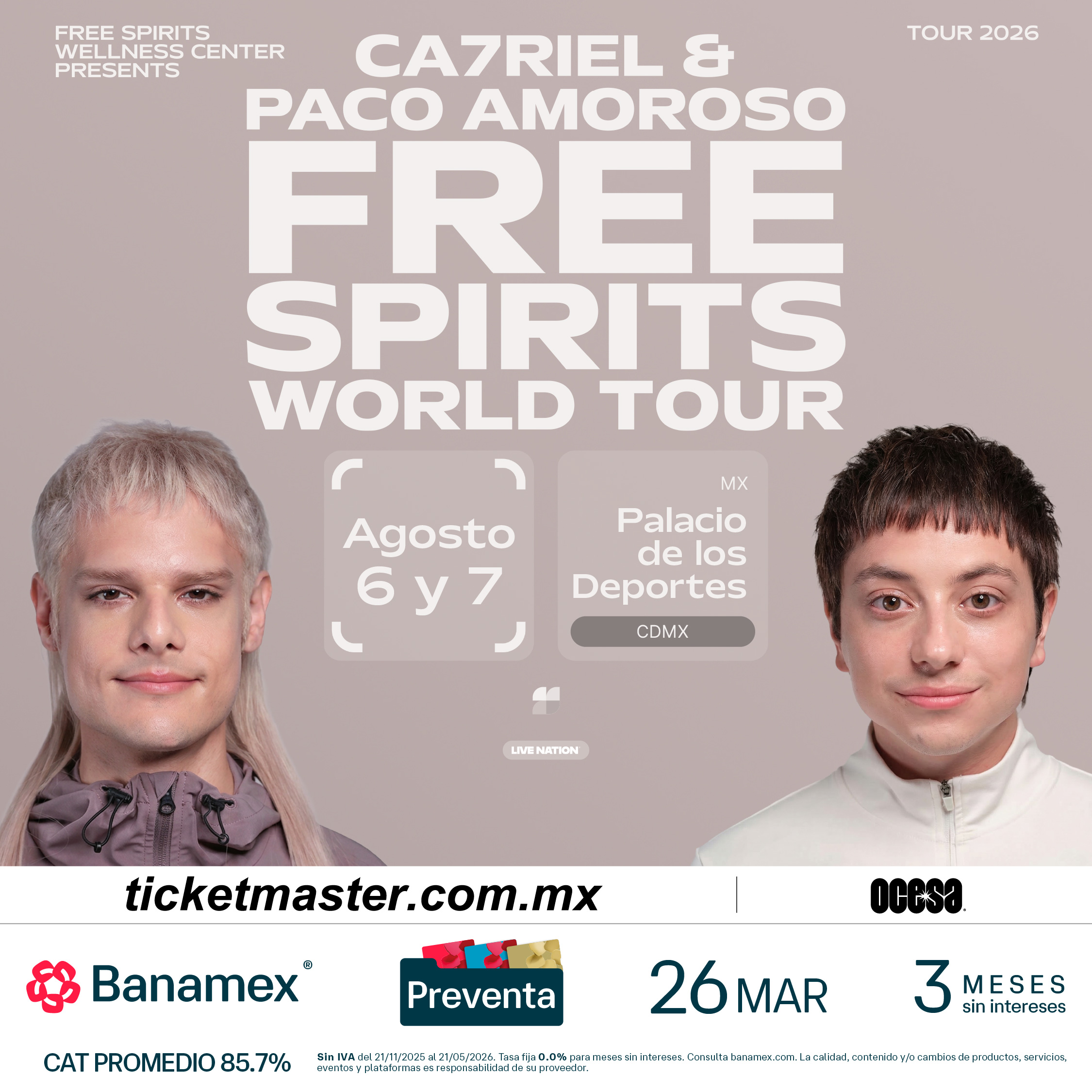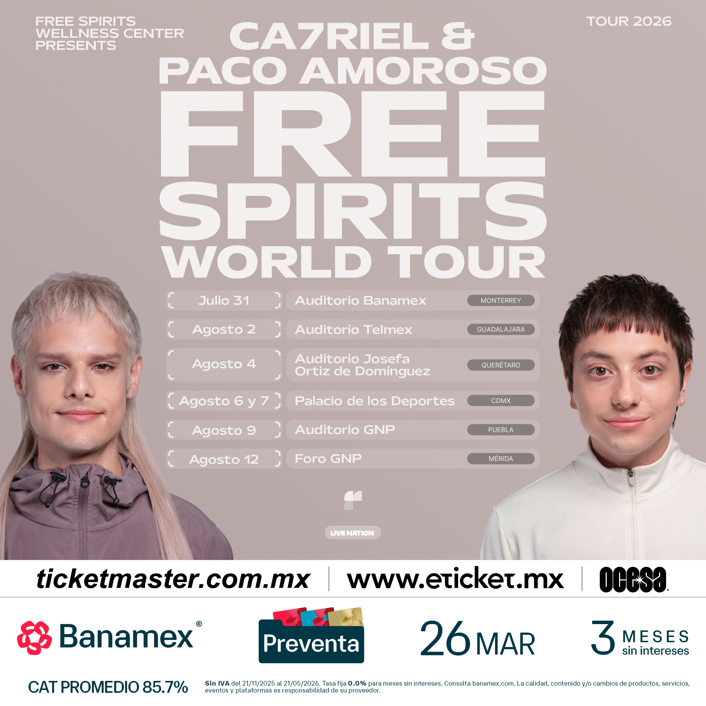 CA7RIEL & Paco Amoroso continuarán el impulso del destacado PAPOTA Tour del año pasado, embarcándose en su gira global 2026 para celebrar el lanzamiento de FREE SPIRITS. La gira comienza el 14 de mayo con un concierto especial en casa, en el Movistar Arena de Buenos Aires.