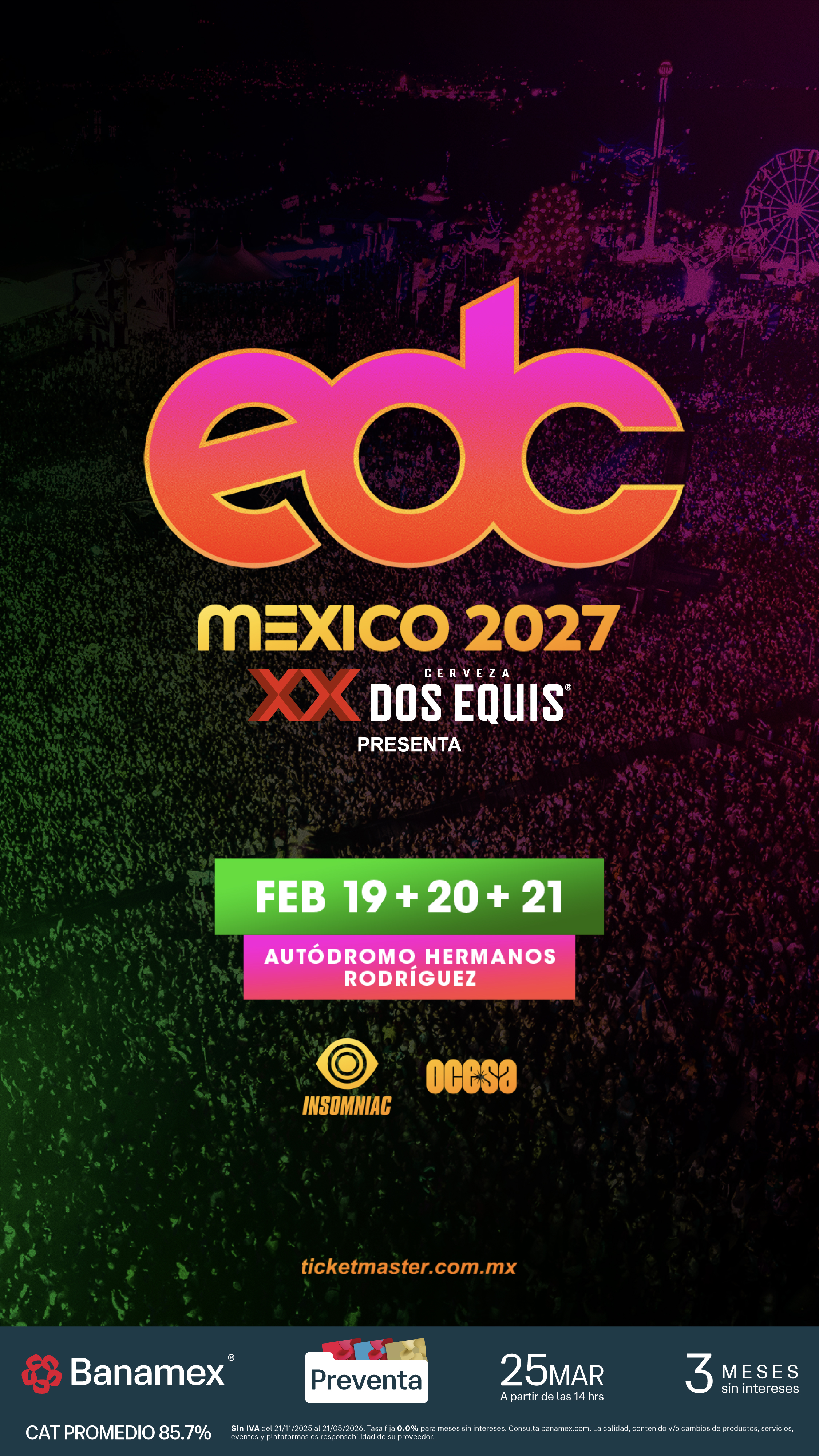 Nos entusiasma compartir que el Electric Daisy Carnival (EDC) México de Insomniac regresará del 19 al 21 de febrero de 2027 en el icónico Autódromo Hermanos Rodríguez.
