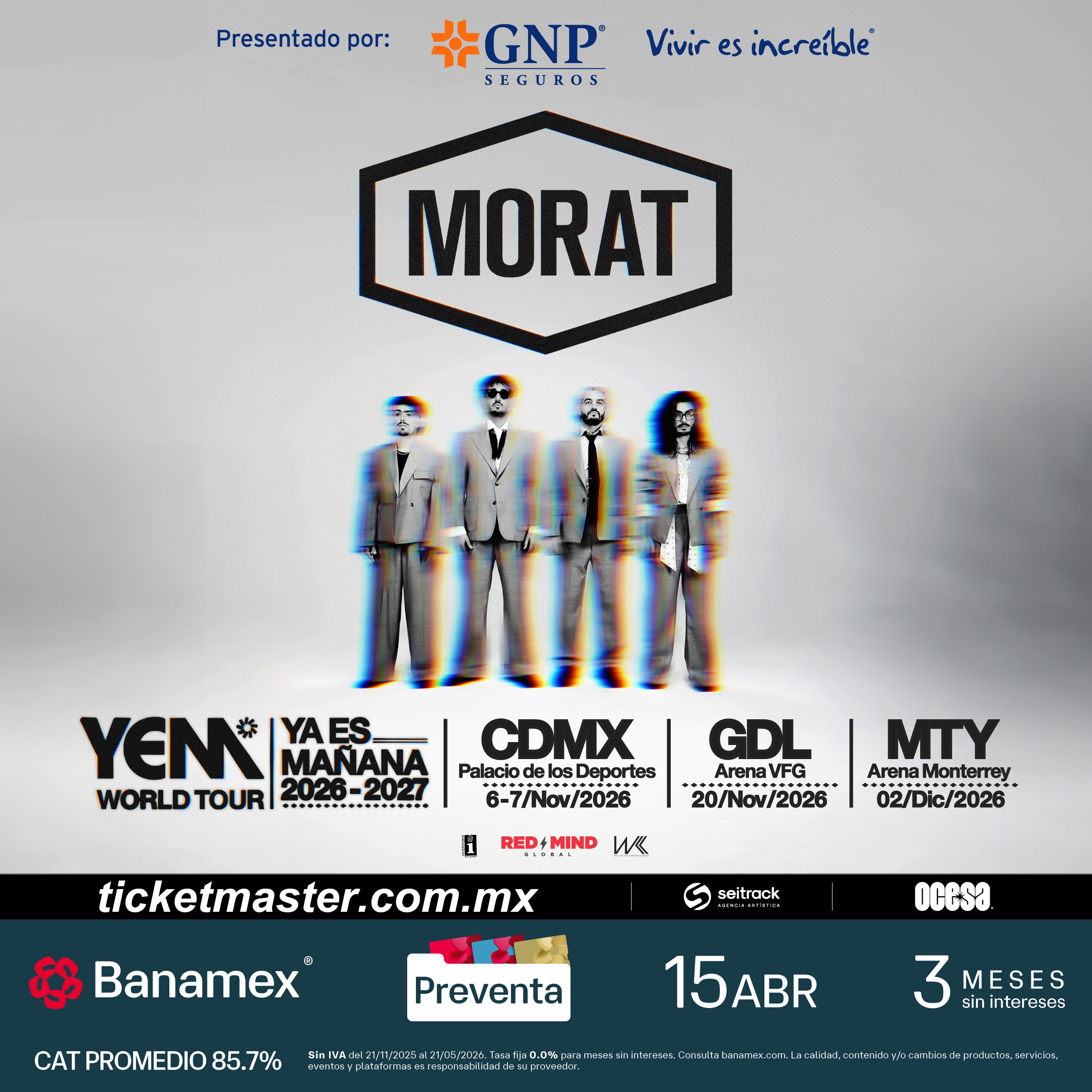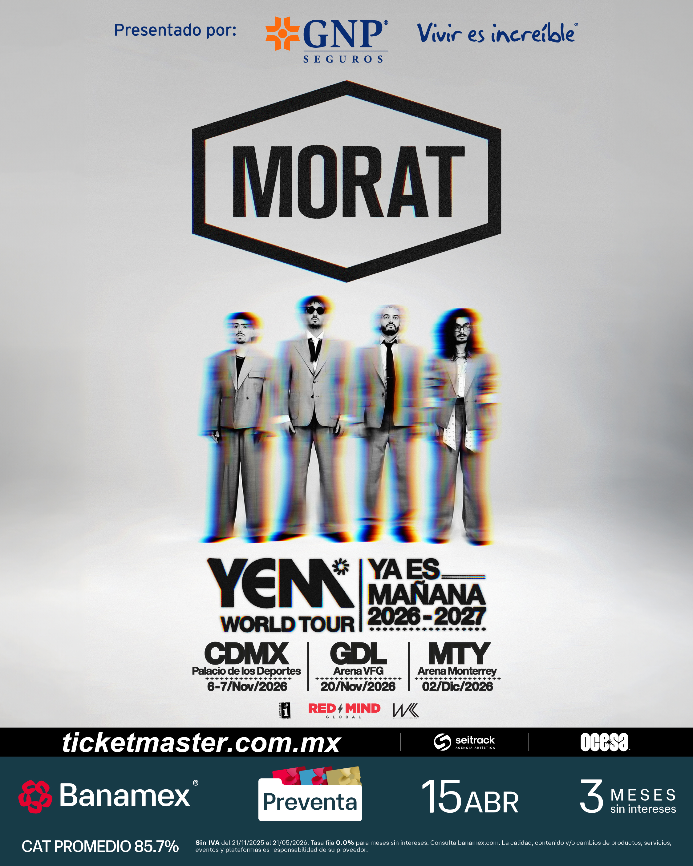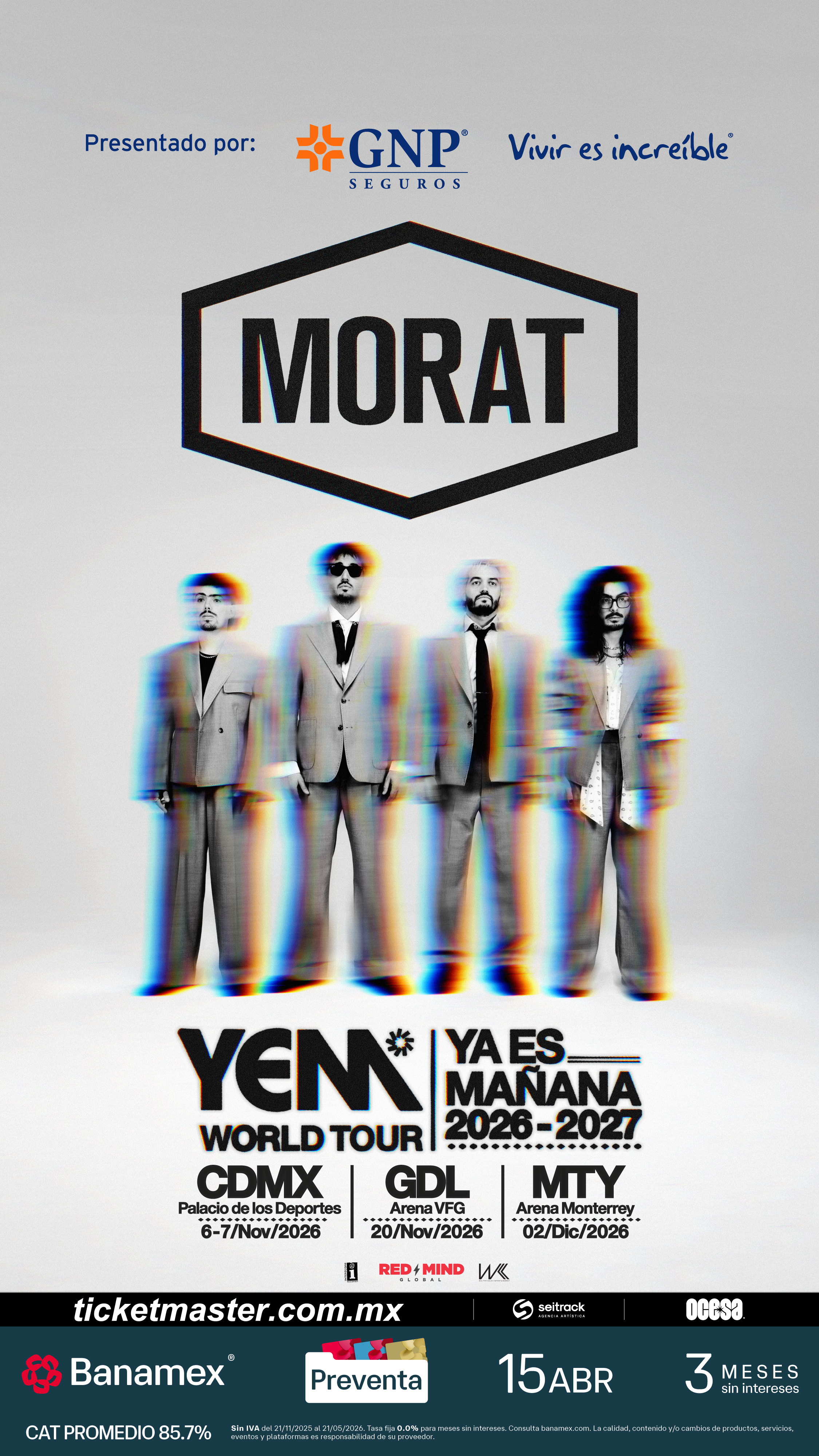 Hoy, la banda no sólo moviliza multitudes: mueve emociones, construye comunidad y deja huella en cada ciudad que pisa y en los corazones de sus seguidores. El aterrizaje del YEM World Tour en CDMX, MTY y GDL marca un momento especial tanto para la banda como para el público mexicano, uno de los más fieles y apasionados. Tras conquistar los escenarios más importantes de Latinoamérica y Europa, Morat llega más grande, más fuerte y más luminoso que nunca.
