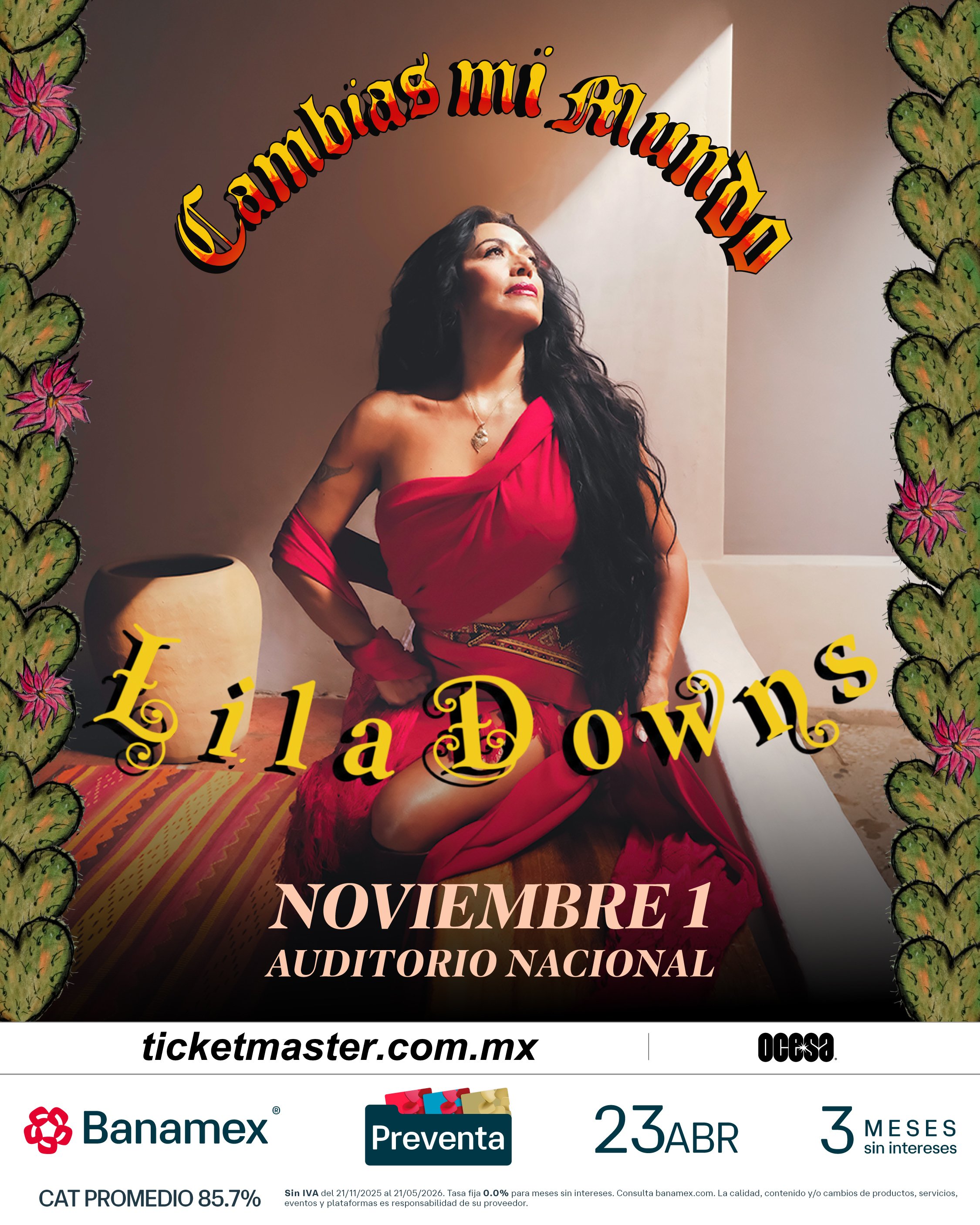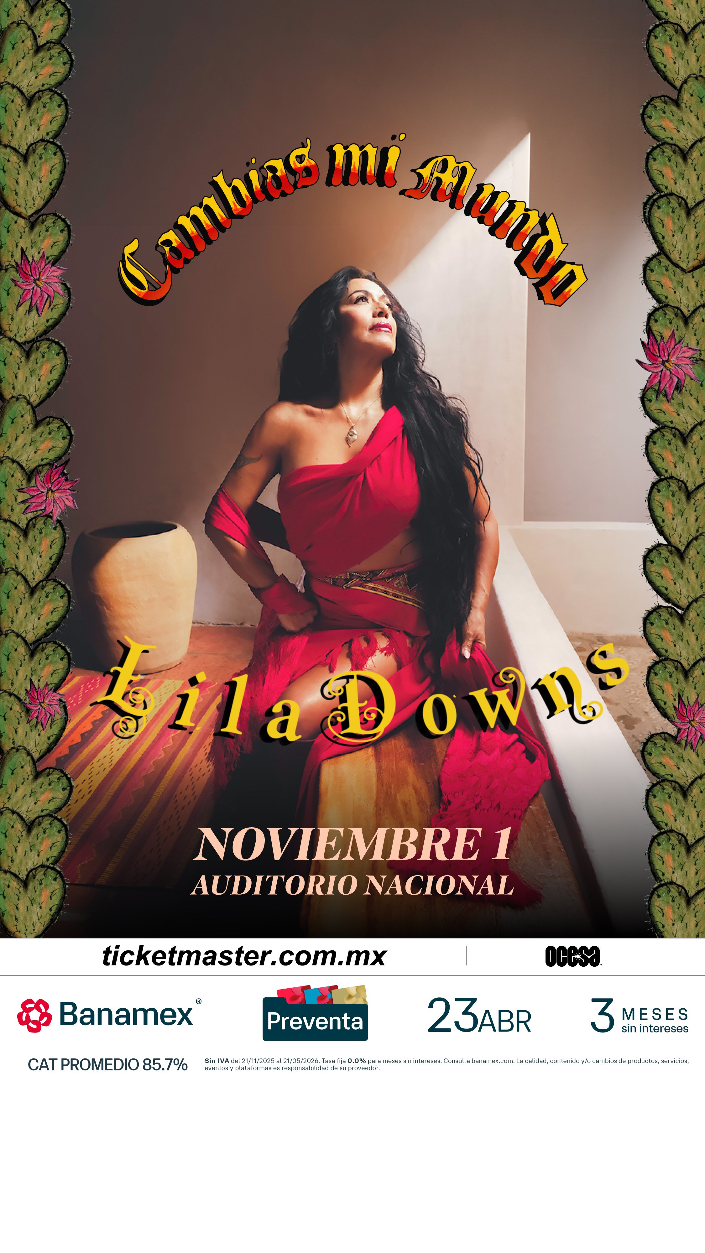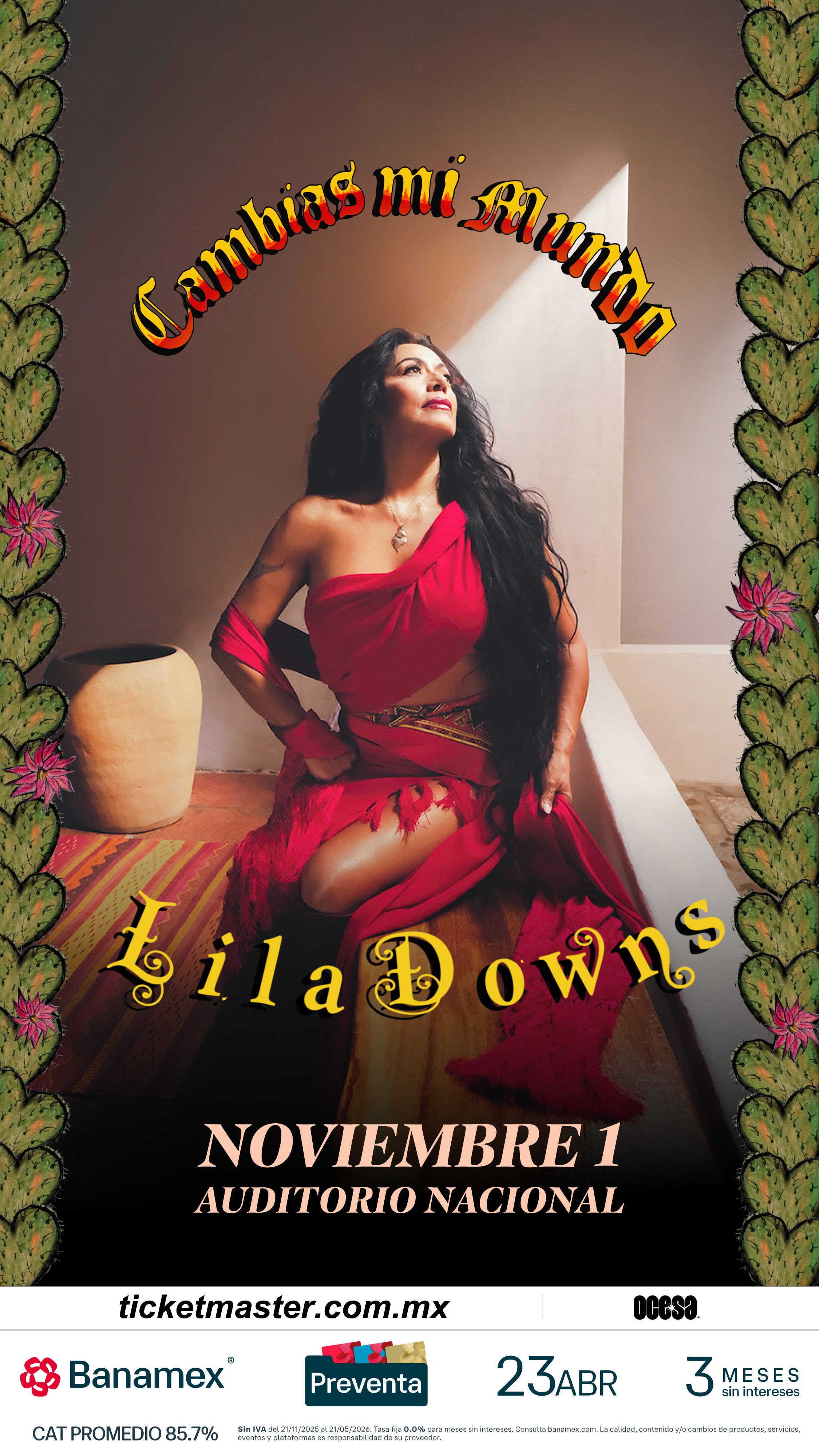 Con una de las trayectorias más sólidas y respetadas de la música mexicana contemporánea, Lila Downs anuncia su regreso al Auditorio Nacional el próximo 1 de noviembre, en un concierto que celebra décadas de carrera, identidad cultural, una profunda conexión con su público y el lanzamiento de su próximo álbum, Cambias Mi Mundo.