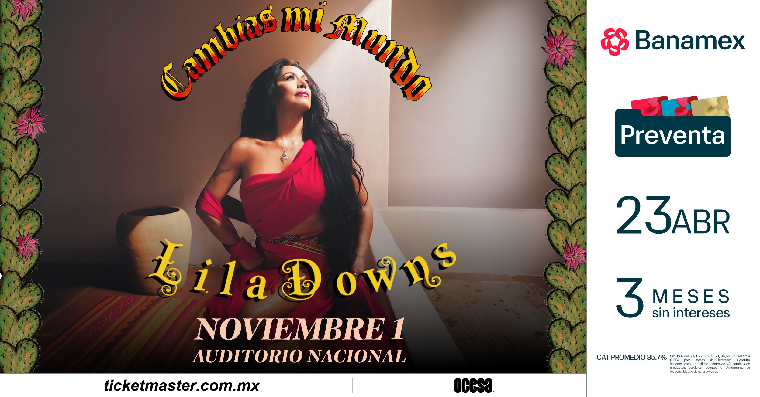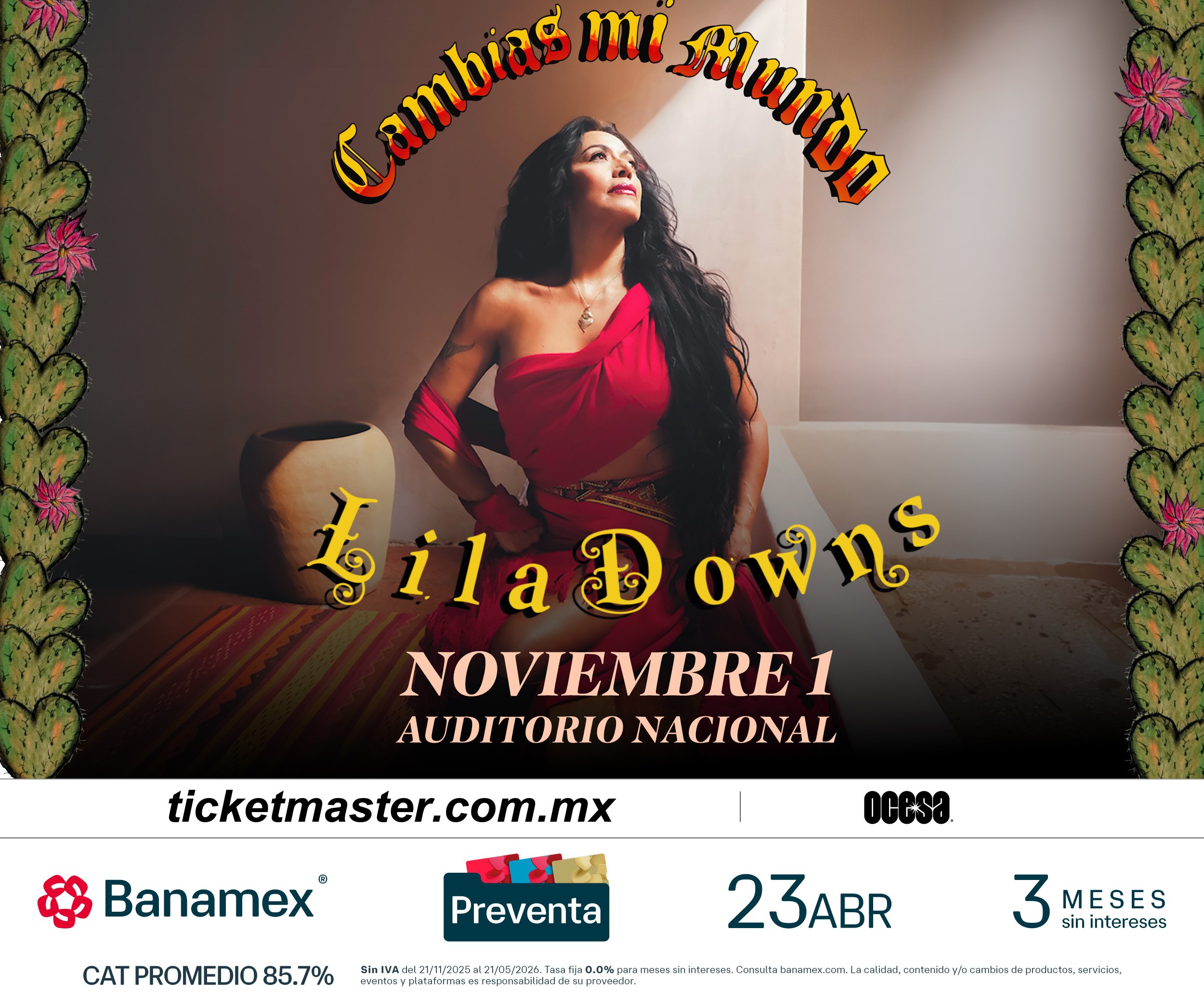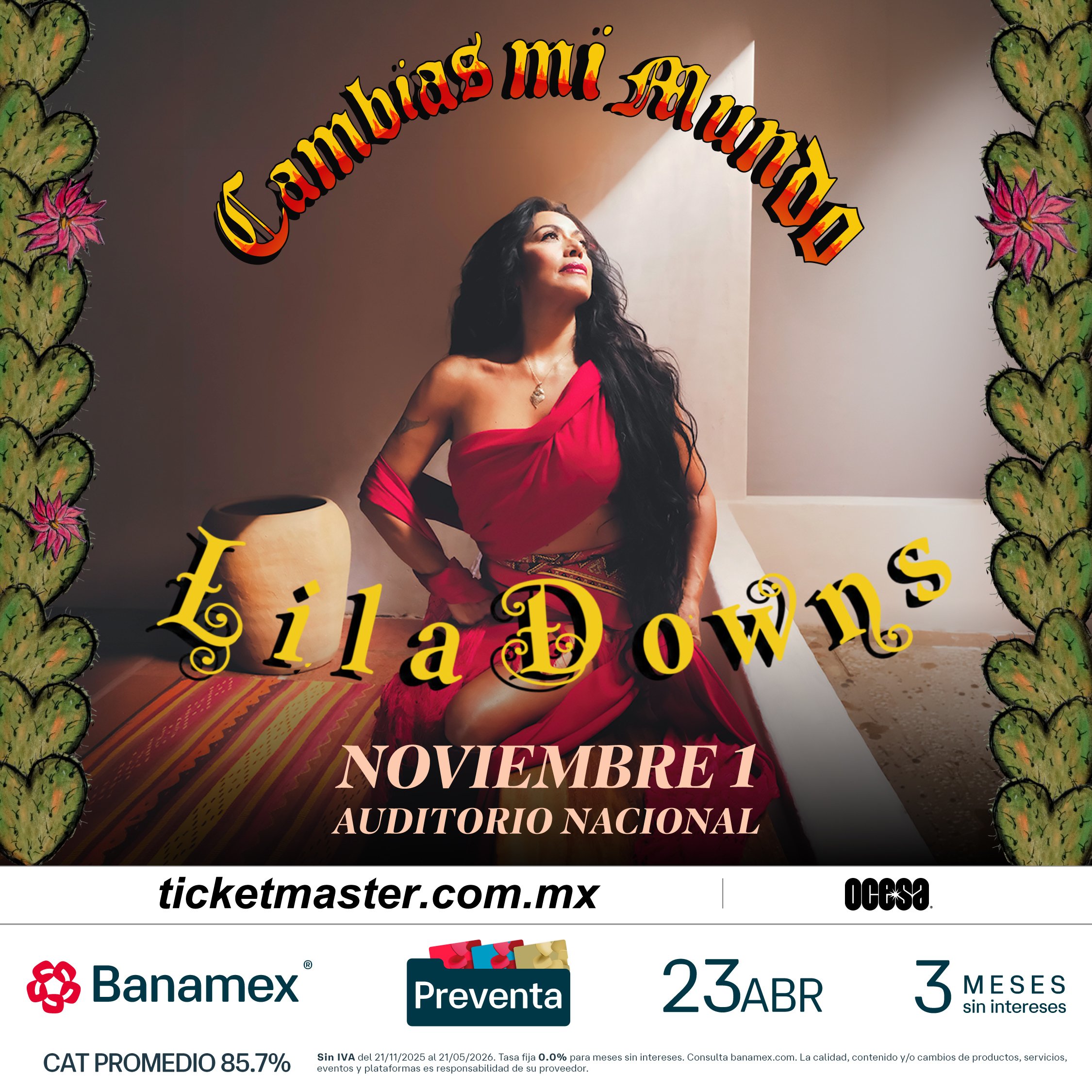 Con una de las trayectorias más sólidas y respetadas de la música mexicana contemporánea, Lila Downs anuncia su regreso al Auditorio Nacional el próximo 1 de noviembre, en un concierto que celebra décadas de carrera, identidad cultural, una profunda conexión con su público y el lanzamiento de su próximo álbum, Cambias Mi Mundo.